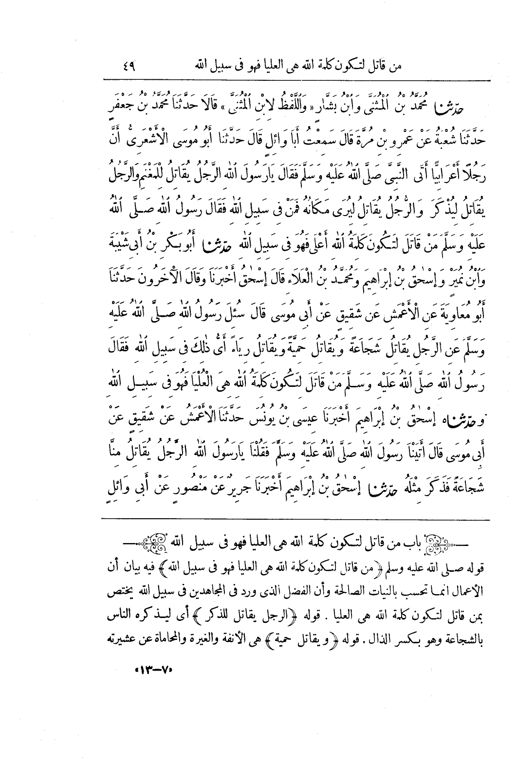 (بَاب مَنْ قَاتَلَ لِتَكُونَ كَلِمَةُ اللَّهِ هِيَ العليا فهو فِي سَبِيلِ اللَّهُ)