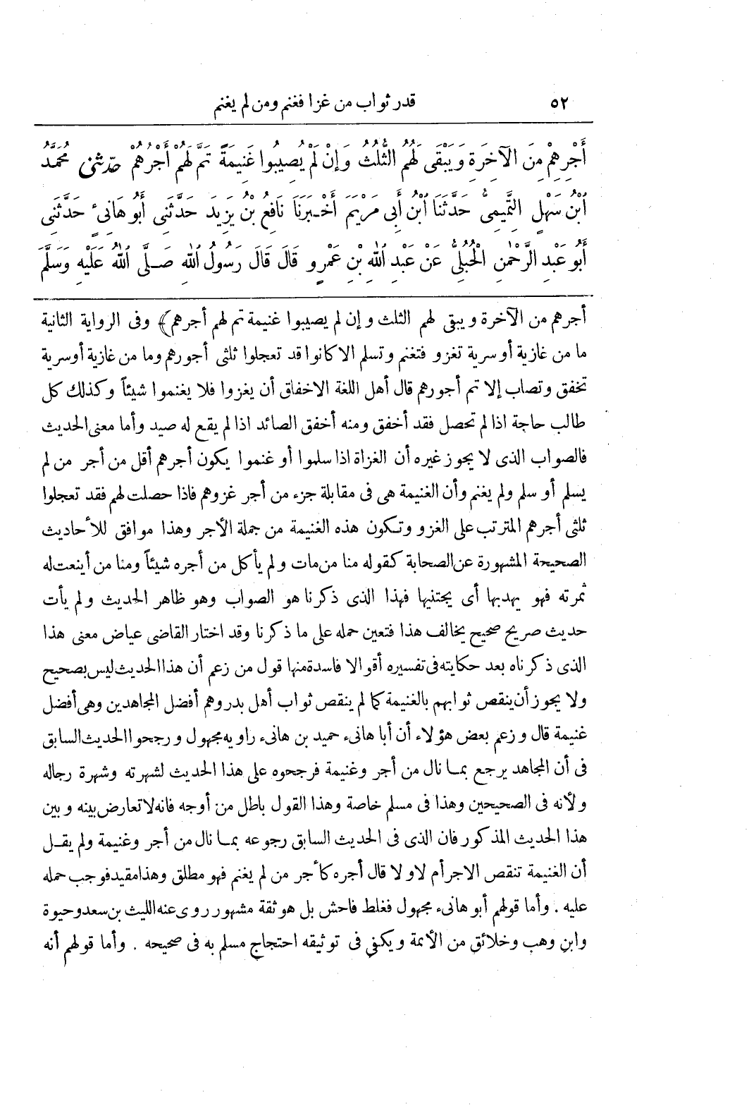 أَجْرِهِمْ مِنَ الْآخِرَةِ وَيَبْقَى لَهُمُ الثُّلُثُ وَإِنْ لَمْ يُصِيبُوا غَنِيمَةً تَمَّ لَهُمْ أَجْرُهُمْ) وَفِي الرِّوَايَةِ الثَّانِيَةِ مَا مِنْ غَازِيَةٍ أَوْ سَرِيَّةٍ تَغْزُو فَتَغْنَمُ وَتَسْلَمُ إِلَّا كَانُوا قَدْ تَعَجَّلُوا ثُلُثَيْ أُجُورِهِمْ وَمَا مِنْ غَازِيَةٍ أَوْ سَرِيَّةٍ تُخْفِقُ وَتُصَابُ إِلَّا تَمَّ أُجُورُهُمْ قَالَ أَهْلُ اللغة الاخفاق أن يغزو فَلَا يَغْنَمُوا شَيْئًا وَكَذَلِكَ كُلُّ طَالِبِ حَاجَةٍ إِذَا لَمْ تَحْصُلْ فَقَدْ أَخْفَقَ وَمِنْهُ أَخْفَقَ الصَّائِدُ إِذَا لَمْ يَقَعْ لَهُ صَيْدٌ وَأَمَّا مَعْنَى الْحَدِيثِ فَالصَّوَابُ الَّذِي لَا يَجُوزُ غَيْرُهُ أَنَّ الْغُزَاةَ إِذَا سَلِمُوا أَوْ غَنِمُوا يَكُونُ أَجْرُهُمْ أَقَلَّ مِنْ أَجْرِ مَنْ لَمْ يَسْلَمْ أَوْ سَلِمَ وَلَمْ يَغْنَمْ وَأَنَّ الْغَنِيمَةَ هِيَ فِي مُقَابَلَةِ جُزْءٍ مِنْ أَجْرِ غَزْوِهِمْ فَإِذَا حَصَلَتْ لَهُمْ فَقَدْ تَعَجَّلُوا ثُلُثَيْ أَجْرِهِمُ الْمُتَرَتَّبَ عَلَى الْغَزْوِ وَتَكُونُ هَذِهِ الْغَنِيمَةُ مِنْ جُمْلَةِ الْأَجْرِ وَهَذَا مُوَافِقٌ لِلْأَحَادِيثِ الصَّحِيحَةِ الْمَشْهُورَةِ عَنِ الصَّحَابَةِ كَقَوْلِهِ مِنَّا مَنْ مَاتَ وَلَمْ يَأْكُلْ مِنْ أَجْرِهِ شَيْئًا وَمِنَّا مَنْ أَيْنَعَتْ لَهُ ثَمَرَتُهُ فَهُوَ يَهْدِبُهَا أَيْ يَجْتَنِيهَا فَهَذَا الَّذِي ذَكَرْنَا هُوَ الصَّوَابُ وَهُوَ ظَاهِرُ الْحَدِيثِ وَلَمْ يَأْتِ حَدِيثٌ صَرِيحٌ صَحِيحٌ يُخَالِفُ هَذَا فَتَعَيَّنَ حَمْلُهُ عَلَى مَا ذَكَرْنَا وَقَدِ اخْتَارَ الْقَاضِي عِيَاضٌ مَعْنَى هَذَا الَّذِي ذَكَرْنَاهُ بَعْدَ حِكَايَتِهِ فِي تَفْسِيرِهِ أَقْوَالًا فَاسِدَةً مِنْهَا قَوْلُ مَنْ زعم أن هذا الحديث ليس بصحيح ولايجوز أَنْ يَنْقُصَ ثَوَابُهُمْ بِالْغَنِيمَةِ كَمَا لَمْ يَنْقُصْ ثَوَابُ أَهْلِ بَدْرٍ وَهُمْ أَفْضَلُ الْمُجَاهِدِينَ وَهِيَ أَفْضَلُ غَنِيمَةٍ قَالَ وَزَعَمَ بَعْضُ هَؤُلَاءِ أَنَّ أَبَا هَانِئٍ حُمَيْدَ بْنَ هَانِئٍ رَاوِيَةٌ مَجْهُولٌ وَرَجَّحُوا الْحَدِيثَ السَّابِقَ فِي أَنَّ الْمُجَاهِدَ يَرْجِعُ بِمَا نَالَ مِنْ أَجْرٍ وَغَنِيمَةٍ فَرَجَّحُوهُ عَلَى هَذَا الْحَدِيثِ لِشُهْرَتِهِ وَشُهْرَةِ رِجَالِهِ وَلِأَنَّهُ فِي الصَّحِيحَيْنِ وَهَذَا فِي مُسْلِمٍ خَاصَّةً وَهَذَا الْقَوْلٌ بَاطِلٌ مِنْ أَوْجُهٍ فَإِنَّهُ لَا تَعَارُضَ بَيْنَهُ وَبَيْنَ هَذَا الْحَدِيثِ الْمَذْكُورِ فَإِنَّ الَّذِي فِي الْحَدِيثِ السَّابِقِ رُجُوعُهُ بِمَا نَالَ مِنْ أَجْرٍ وَغَنِيمَةٍ وَلَمْ يَقُلْ إِنَّ الْغَنِيمَةَ تَنْقُصُ الْأَجْرَ أَمْ لَا وَلَا قَالَ أَجْرُهُ كَأَجْرِ مَنْ لَمْ يَغْنَمْ فَهُوَ مُطْلَقٌ وَهَذَا مُقَيَّدٌ فَوَجَبَ حَمْلُهُ عَلَيْهِ وَأَمَّا قَوْلُهُمْ أَبُو هَانِئٍ مَجْهُولٌ فَغَلَطٌ فَاحِشٌ بَلْ هُوَ ثِقَةٌ مَشْهُورٌ رَوَى عنه الليث بن سعد وحيوة وبن وَهْبٍ وَخَلَائِقُ مِنَ الْأَئِمَّةِ وَيَكْفِي فِي تَوْثِيقِهِ احْتِجَاجُ مُسْلِمٍ بِهِ فِي صَحِيحِهِ وَأَمَّا قَوْلُهُمْ أنه