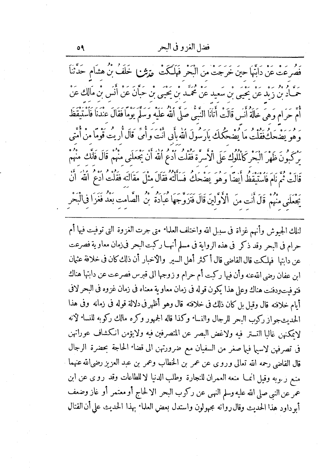 لِتِلْكَ الْجُيُوشِ وَأَنَّهُمْ غُزَاةٌ فِي سَبِيلِ اللَّهِ وَاخْتَلَفَ الْعُلَمَاءُ مَتَى جَرَتِ الْغَزْوَةُ الَّتِي تُوُفِّيَتْ فِيهَا أُمُّ حَرَامٍ فِي الْبَحْرِ وَقَدْ ذَكَرَ فِي هَذِهِ الرِّوَايَةِ فِي مُسْلِمٍ أَنَّهَا رَكِبَتِ الْبَحْرَ فِي زَمَانِ مُعَاوِيَةَ فَصُرِعَتْ عَنْ دَابَّتِهَا فَهَلَكَتْ قَالَ الْقَاضِي قَالَ أَكْثَرُ أَهْلِ السِّيَرِ وَالْأَخْبَارِ إِنَّ ذَلِكَ كَانَ فِي خِلَافَةِ عُثْمَانَ بْنِ عَفَّانَ رَضِيَ اللَّهُ عَنْهُ وَأَنَّ فِيهَا ركبت أم حرام وزوجها إلى قبرص فَصُرِعَتْ عَنْ دَابَّتِهَا هُنَاكَ فَتُوُفِّيَتْ وَدُفِنَتْ هُنَاكَ وَعَلَى هَذَا يَكُونُ قَوْلُهُ فِي زَمَانِ مُعَاوِيَةَ مَعْنَاهُ فِي زَمَانِ غَزْوِهِ فِي الْبَحْرِ لَا فِي أَيَّامِ خِلَافَتِهِ قَالَ وَقِيلَ بَلْ كَانَ ذَلِكَ فِي خِلَافَتِهِ قَالَ وَهُوَ أَظْهَرُ فِي دَلَالَةِ قَوْلِهِ فِي زَمَانِهِ وَفِي هَذَا الْحَدِيثِ جَوَازُ رُكُوبِ الْبَحْرِ لِلرِّجَالِ وَالنِّسَاءِ وَكَذَا قَالَهُ الْجُمْهُورُ وَكَرِهَ مَالِكٌ رُكُوبَهَ لِلنِّسَاءِ لِأَنَّهُ لَا يُمْكِنُهُنَّ غَالِبًا التَّسَتُّرُ فِيهِ وَلَا غَضُّ الْبَصَرِ عن المتصرفين فيه ولايؤمن انْكِشَافُ عَوْرَاتِهِنَّ فِي تَصَرُّفِهِنَّ لَا سِيَّمَا فِيمَا صَغُرَ مِنَ السُّفْيَانِ مَعَ ضَرُورَتِهِنَّ إِلَى قَضَاءِ الْحَاجَةِ بِحَضْرَةِ الرِّجَالِ قَالَ الْقَاضِي رَحِمَهُ اللَّهُ تَعَالَى وَرُوِيَ عَنْ عُمَرَ بْنِ الْخَطَّابِ وَعُمَرَ بْنِ عَبْدِ الْعَزِيزِ رَضِيَ اللَّهُ عَنْهُمَا مَنْعُ رُكُوبِهِ وَقِيلَ إِنَّمَا مَنَعَهُ الْعُمَرَانِ لِلتِّجَارَةِ وَطَلَبِ الدنيا لا للطاعات وقد روى عن بن عُمَرَ عَنِ النَّبِيِّ صَلَّى اللَّهُ عَلَيْهِ وَسَلَّمَ النَّهْيُ عَنْ رُكُوبِ الْبَحْرِ إِلَّا لِحَاجٍّ أَوْ مُعْتَمِرٍ أَوْ غَازٍ وَضَعَّفَ أَبُو دَاوُدَ هَذَا الْحَدِيثَ وَقَالَ رُوَاتُهُ مَجْهُولُونَ وَاسْتَدَلَّ بَعْضُ الْعُلَمَاءِ بِهَذَا الْحَدِيثِ عَلَى أَنَّ الْقِتَالَ