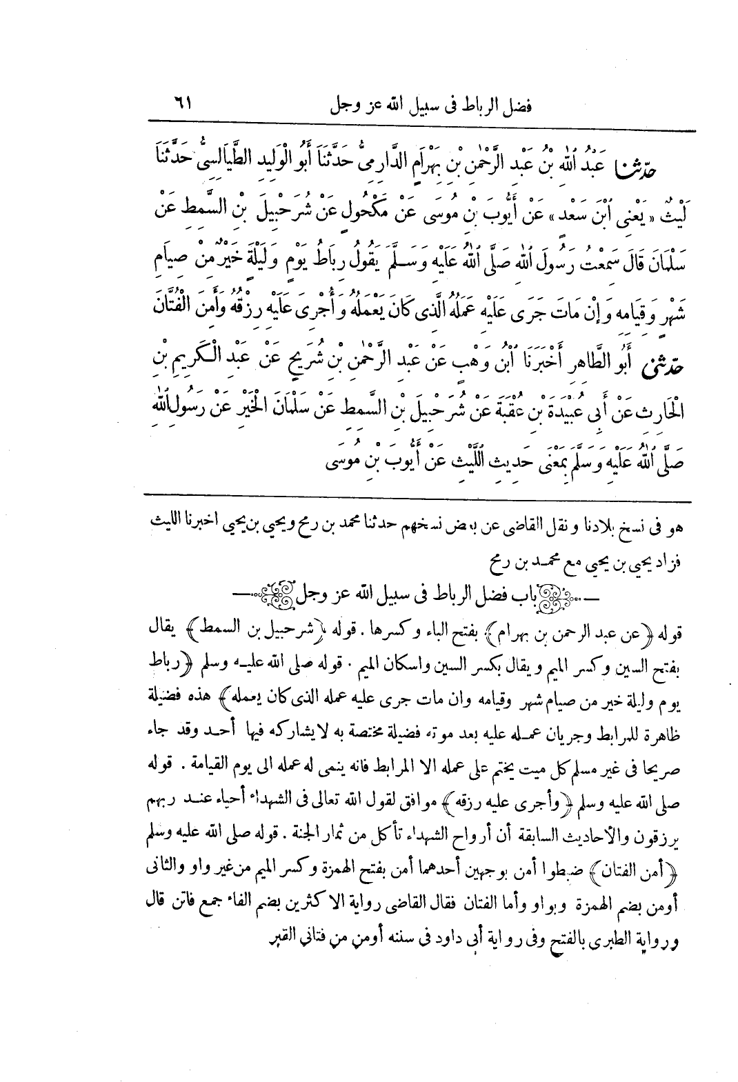 [1913] قَوْلُهُ (عَنْ عَبْدِ الرَّحْمَنِ بْنِ بَهْرَامٍ) بِفَتْحِ الْبَاءِ وَكَسْرِهَا قَوْلُهُ (شُرَحْبِيلُ بْنِ السَّمِطِ) يُقَالُ بِفَتْحِ السِّينِ وَكَسْرِ الْمِيمِ وَيُقَالُ بِكَسْرِ السِّينِ وَإِسْكَانِ الْمِيمِ قَوْلُهُ صَلَّى اللَّهُ عَلَيْهِ وَسَلَّمَ (رِبَاطُ يَوْمٍ وَلَيْلَةٍ خَيْرٌ مِنْ صِيَامِ شَهْرٍ وَقِيَامِهِ وَإِنْ مَاتَ جَرَى عَلَيْهِ عَمَلُهُ الَّذِي كَانَ يَعْمَلُهُ) هَذِهِ فَضِيلَةٌ ظَاهِرَةٌ لِلْمُرَابِطِ وَجَرَيَانُ عَمَلِهِ عليه بَعْدَ مَوْتِهِ فَضِيلَةٌ مُخْتَصَّةٌ بِهِ لَا يُشَارِكُهُ فِيهَا أَحَدٌ وَقَدْ جَاءَ صَرِيحًا فِي غَيْرِ مُسْلِمٍ كُلُّ مَيِّتٍ يُخْتَمُ عَلَى عَمَلِهِ إِلَّا الْمُرَابِطَ فَإِنَّهُ يُنَمَّى لَهُ عَمَلُهُ إِلَى يَوْمَ الْقِيَامَةِ قَوْلُهُ صَلَّى اللَّهُ عَلَيْهِ وَسَلَّمَ (وَأُجْرِيَ عَلَيْهِ رِزْقُهُ) مُوَافِقٌ لِقَوْلِ اللَّهِ تَعَالَى فِي الشهداء أحياء عند ربهم يرزقون وَالْأَحَادِيثُ السَّابِقَةُ أَنَّ أَرْوَاحَ الشُّهَدَاءِ تَأْكُلُ مِنْ ثِمَارِ الْجَنَّةِ قَوْلُهُ صَلَّى اللَّهُ عَلَيْهِ وَسَلَّمَ (أَمِنَ الْفُتَّانَ) ضَبَطُوا أَمِنَ بِوَجْهَيْنِ أَحَدُهُمَا أَمِنَ بِفَتْحِ الْهَمْزَةِ وَكَسْرِ الْمِيمِ مِنْ غَيْرِ وَاوٍ والثانى أو من بِضَمِّ الْهَمْزَةِ وَبِوَاوٍ وَأَمَّا الْفُتَّانُ فَقَالَ الْقَاضِي رِوَايَةُ الْأَكْثَرِينَ بِضَمِّ الْفَاءِ جَمْعُ فَاتِنٍ قَالَ وَرِوَايَةُ الطَّبَرِيِّ بِالْفَتْحِ وَفِي رِوَايَةِ أَبِي دَاوُدَ فِي سُنَنِهِ أُومِنَ مِنْ فَتَّانِي الْقَبْرِ