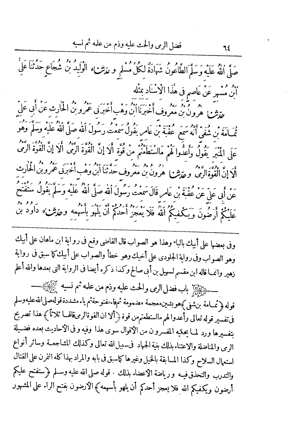 [1917] قَوْلُهُ (ثُمَامَةَ بْنَ شُفَيٍّ) هُوَ بِشِينٍ مُعْجَمَةٍ مَضْمُومَةٍ ثُمَّ فَاءٍ مَفْتُوحَةٍ ثُمَّ يَاءٍ مُشَدَّدَةٍ قَوْلُهُ صَلَّى اللَّهُ عَلَيْهِ وَسَلَّمَ فِي تَفْسِيرِ قَوْلُهُ تَعَالَى وَأَعِدُّوا لَهُمْ مَا اسْتَطَعْتُمْ مِنْ قوة أَلَا إِنَّ الْقُوَّةَ الرَّمْيُ قَالَهَا ثَلَاثًا) هَذَا تَصْرِيحٌ بِتَفْسِيرِهَا وَرَدَ لِمَا يَحْكِيهِ الْمُفَسِّرُونَ مِنَ الْأَقْوَالِ سِوَى هَذَا وَفِيهِ وَفِي الْأَحَادِيثِ بَعْدَهُ فَضِيلَةُ الرَّمْيِ وَالْمُنَاضَلَةِ وَالِاعْتِنَاءِ بِذَلِكَ بِنِيَّةِ الْجِهَادِ فِي سَبِيلِ اللَّهِ تَعَالَى وَكَذَلِكَ الْمُشَاجَعَةُ وَسَائِرُ أَنْوَاعِ اسْتِعْمَالِ السِّلَاحِ وَكَذَا الْمُسَابَقَةُ بِالْخَيْلِ وَغَيْرِهَا كَمَا سَبَقَ فِي بَابِهِ وَالْمُرَادُ بِهَذَا كُلِّهِ التَّمَرُّنُ عَلَى الْقِتَالِ وَالتَّدَرُّبُ وَالتَّحَذُّقُ فِيهِ وَرِيَاضَةُ الْأَعْضَاءِ بِذَلِكَ