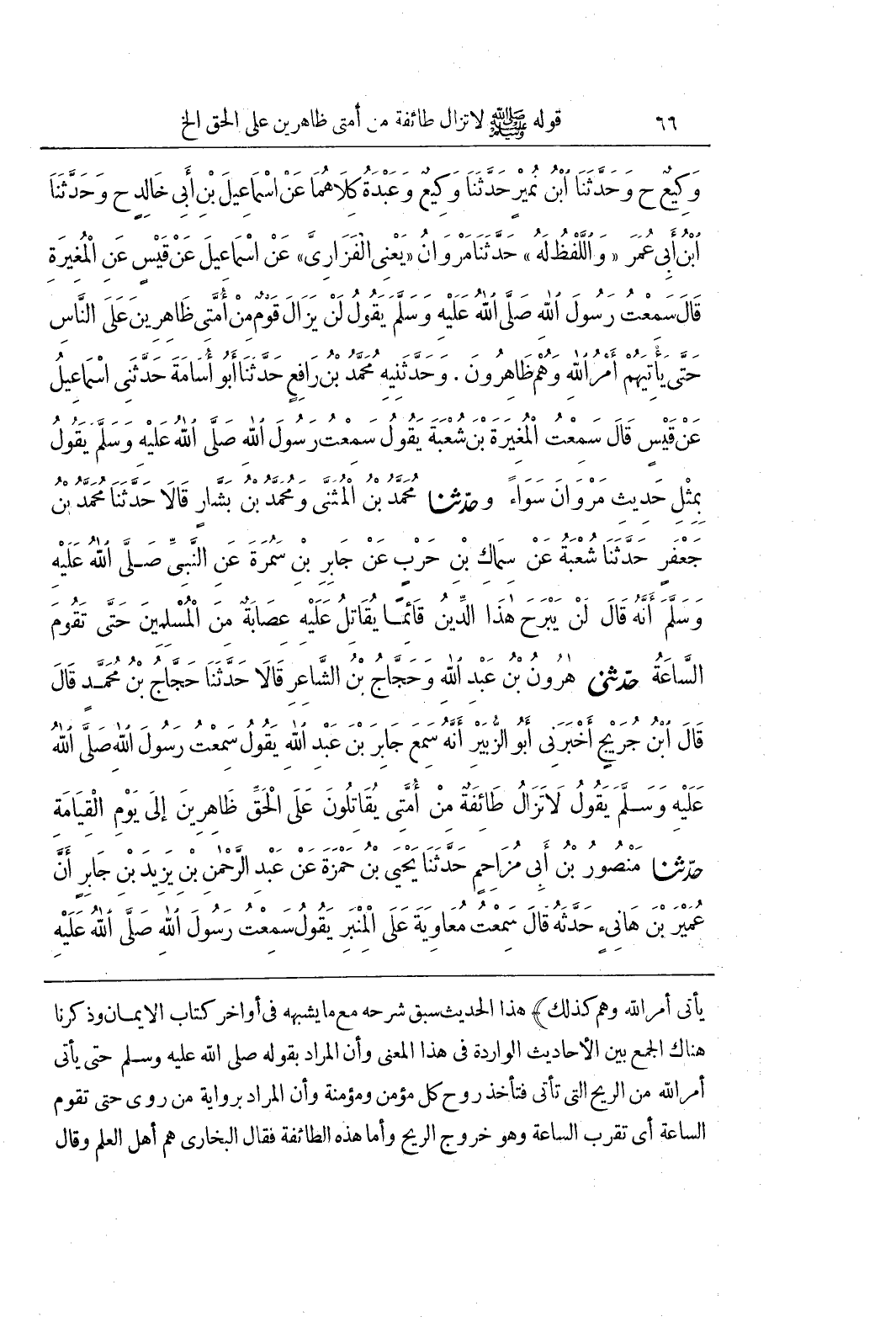 يَأْتِيَ أَمْرُ اللَّهِ وَهُمْ كَذَلِكَ) هَذَا الْحَدِيثُ سَبَقَ شَرْحُهُ مَعَ مَا يُشْبِهُهُ فِي أَوَاخِرِ كِتَابِ الْإِيمَانِ وَذَكَرْنَا هُنَاكَ الْجَمْعَ بَيْنَ الْأَحَادِيثِ الْوَارِدَةِ فِي هَذَا الْمَعْنَى وَأَنَّ الْمُرَادَ بِقَوْلِهِ صَلَّى اللَّهُ عَلَيْهِ وَسَلَّمَ حَتَّى يَأْتِيَ أَمْرُ اللَّهِ مِنَ الرِّيحِ الَّتِي تَأْتِي فَتَأْخُذُ رُوحَ كُلِّ مُؤْمِنٍ وَمُؤْمِنَةٍ وَأَنَّ الْمُرَادَ بِرِوَايَةِ مَنْ رَوَى حَتَّى تَقُومَ السَّاعَةُ أَيْ تَقْرُبَ السَّاعَةُ وَهُوَ خُرُوجُ الرِّيحِ وَأَمَّا هَذِهِ الطَّائِفَةُ فَقَالَ الْبُخَارِيُّ هُمْ أَهْلُ الْعِلْمِ وَقَالَ