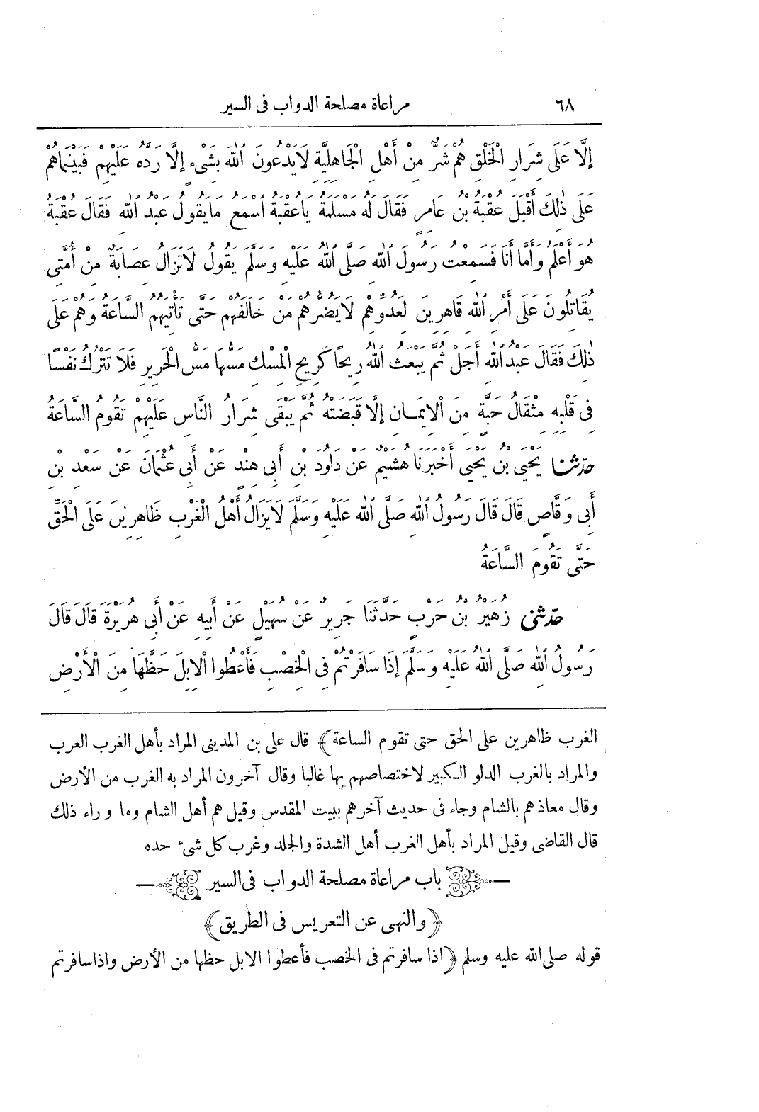 (بَاب مُرَاعَاةِ مَصْلَحَةِ الدَّوَابِّ فِي السَّيْرِ وَالنَّهْيِ عَنْ التَّعْرِيسِ فِي الطَّرِيقِ)