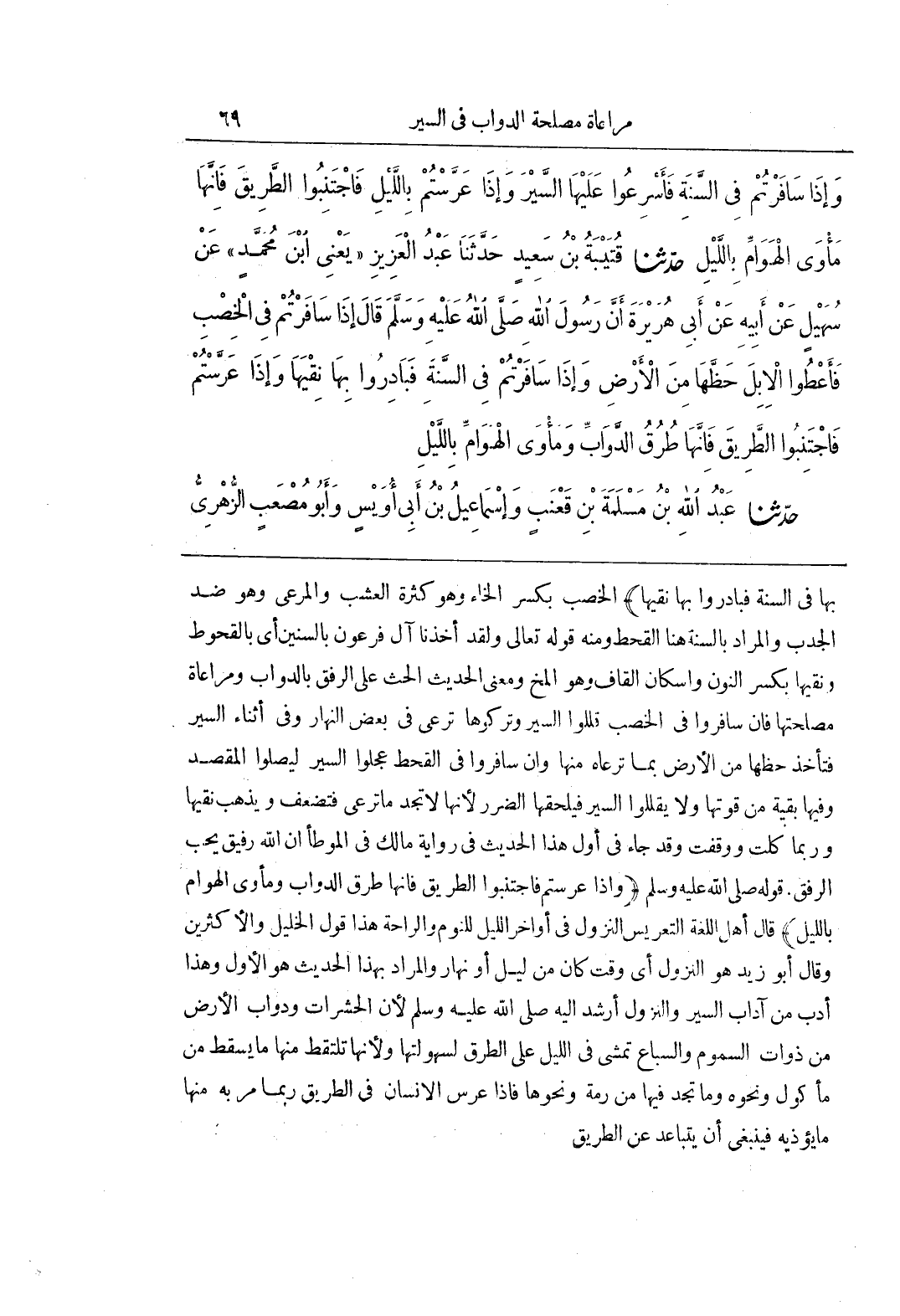 بِهَا فِي السَّنَةِ فَبَادِرُوا بِهَا نِقْيَهَا) الْخِصْبُ بِكَسْرِ الْخَاءِ وَهُوَ كَثْرَةُ الْعُشْبِ وَالْمَرْعَى وَهُوَ ضِدُّ الْجَدْبِ وَالْمُرَادُ بِالسَّنَةِ هُنَا الْقَحْطُ وَمِنْهُ قَوْلُهُ تَعَالَى وَلَقَدْ أَخَذْنَا آلَ فِرْعَوْنَ بِالسِّنِينَ أى بالقحوط ونقيها بِكَسْرِ النُّونِ وَإِسْكَانِ الْقَافِ وَهُوَ الْمُخُّ وَمَعْنَى الْحَدِيثِ الْحَثُّ عَلَى الرِّفْقِ بِالدَّوَابِّ وَمُرَاعَاةُ مَصْلَحَتِهَا فَإِنْ سَافَرُوا فِي الْخِصْبِ قَلَّلُوا السَّيْرَ وَتَرَكُوهَا تَرْعَى فِي بَعْضِ النَّهَارِ وَفِي أَثْنَاءِ السَّيْرِ فَتَأْخُذُ حَظَّهَا مِنَ الْأَرْضِ بِمَا تَرْعَاهُ مِنْهَا وَإِنْ سَافَرُوا فِي الْقَحْطِ عَجَّلُوا السَّيْرَ لِيَصِلُوا الْمَقْصِدَ وَفِيهَا بَقِيَّةٌ مِنْ قُوَّتِهَا وَلَا يُقَلِّلُوا السَّيْرَ فَيَلْحَقَهَا الضَّرَرُ لِأَنَّهَا لَا تَجِدُ مَا تَرْعَى فَتَضْعُفُ وَيَذْهَبُ نِقْيُهَا وَرُبَّمَا كَلَّتْ وَوَقَفَتْ وَقَدْ جَاءَ فِي أَوَّلِ هَذَا الْحَدِيثِ فِي رِوَايَةِ مَالِكٍ فِي الْمُوَطَّأِ أَنَّ اللَّهَ رَفِيقٌ يُحِبُّ الرِّفْقَ قَوْلُهُ صَلَّى اللَّهُ عَلَيْهِ وَسَلَّمَ (وَإِذَا عَرَّسْتُمْ فَاجْتَنِبُوا الطَّرِيقَ فَإِنَّهَا طُرُقُ الدَّوَابِّ وَمَأْوَى الْهَوَامِّ بِاللَّيْلِ) قَالَ أَهْلُ اللُّغَةِ التَّعْرِيسُ النُّزُولُ فِي أَوَاخِرِ اللَّيْلِ لِلنَّوْمِ وَالرَّاحَةِ هَذَا قَوْلُ الْخَلِيلِ وَالْأَكْثَرِينَ وَقَالَ أَبُو زَيْدٍ هُوَ النُّزُولُ أَيَّ وَقْتٍ كَانَ مِنْ لَيْلٍ أَوْ نَهَارٍ وَالْمُرَادُ بِهَذَا الْحَدِيثِ هُوَ الْأَوَّلُ وَهَذَا أَدَبٌ مِنْ آدَابِ السَّيْرِ وَالنُّزُولِ أَرْشَدَ إِلَيْهِ صَلَّى اللَّهُ عَلَيْهِ وَسَلَّمَ لِأَنَّ الْحَشَرَاتِ وَدَوَابَّ الْأَرْضِ مِنْ ذَوَاتِ السُّمُومِ وَالسِّبَاعِ تَمْشِي فِي الليل على الطرق لِسُهُولَتِهَا وَلِأَنَّهَا تَلْتَقِطُ مِنْهَا مَا يَسْقُطُ مِنْ مَأْكُولٍ وَنَحْوِهِ وَمَا تَجِدُ فِيهَا مِنْ رِمَّةٍ وَنَحْوِهَا فَإِذَا عَرَّسَ الْإِنْسَانُ فِي الطَّرِيقِ رُبَّمَا مَرَّ بِهِ مِنْهَا مَا يُؤْذِيهِ فَيَنْبَغِي أَنْ يَتَبَاعَدَ عَنِ الطَّرِيقِ