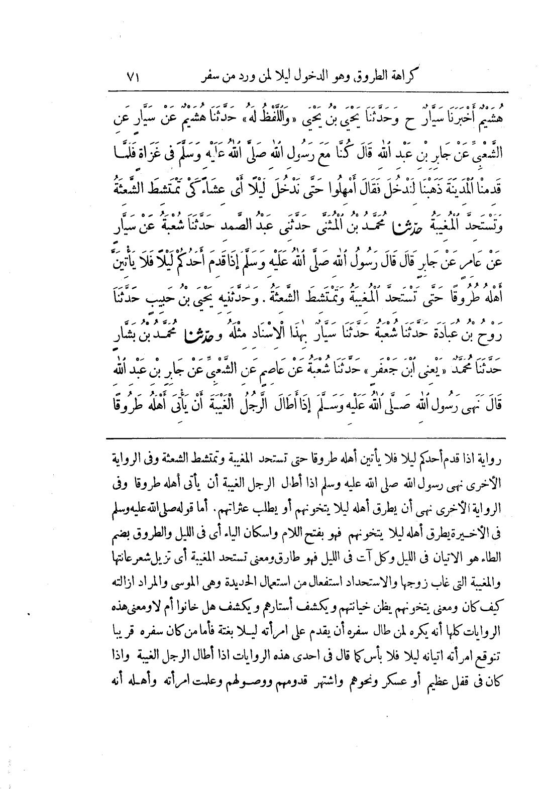 رِوَايَةٍ إِذَا قَدِمَ أَحَدُكُمْ لَيْلًا فَلَا يَأْتِيَنَّ أَهْلَهُ طُرُوقًا حَتَّى تَسْتَحِدَّ الْمُغِيبَةُ وَتَمْتَشِطَ الشَّعِثَةُ وَفِي الرِّوَايَةِ الْأُخْرَى نَهَى رَسُولُ اللَّهِ صَلَّى اللَّهُ عَلَيْهِ وَسَلَّمَ إِذَا أَطَالَ الرَّجُلُ الْغَيْبَةَ أن يأتى أهله طروقا وفى الرواية الأخرى نَهَى أَنْ يَطْرُقَ أَهْلَهُ لَيْلًا يَتَخَوَّنَهُمْ أَوْ يطلب عثراتهم أما قوله صلى الله عليه وسلم في الأخيرة يَطْرُقُ أَهْلَهُ لَيْلًا يَتَخَوَّنُهُمْ فَهُوَ بِفَتْحِ اللَّامِ وَإِسْكَانِ الْيَاءِ أَيْ فِي اللَّيْلِ وَالطُّرُوقُ بِضَمِّ الطَّاءِ هُوَ الْإِتْيَانُ فِي اللَّيْلِ وَكُلُّ آتٍ فِي اللَّيْلِ فَهُوَ طَارِقٌ وَمَعْنَى تَسْتَحِدُّ الْمُغِيبَةُ أَيْ تُزِيلُ شَعْرَ عَانَتِهَا وَالْمَغِيبَةُ الَّتِي غَابَ زَوْجُهَا وَالِاسْتِحْدَادُ اسْتِفْعَالٌ مِنَ اسْتِعْمَالِ الْحَدِيدَةِ وَهِيَ الْمُوسَى وَالْمُرَادُ إِزَالَتُهُ كَيْفَ كَانَ وَمَعْنَى يَتَخَوَّنُهُمْ يَظُنُّ خِيَانَتَهُمْ وَيَكْشِفُ أَسْتَارَهُمْ وَيَكْشِفُ هَلْ خَانُوا أَمْ لَا وَمَعْنَى هَذِهِ الرِّوَايَاتِ كُلِّهَا أَنَّهُ يكوه لِمَنْ طَالَ سَفَرُهُ أَنْ يَقْدَمَ عَلَى امْرَأَتِهِ لَيْلًا بَغْتَةً فَأَمَّا مَنْ كَانَ سَفَرُهُ قَرِيبًا تَتَوَقَّعُ امْرَأَتُهُ إِتْيَانَهُ لَيْلًا فَلَا بَأْسَ كَمَا قَالَ فِي إِحْدَى هَذِهِ الرِّوَايَاتِ إِذَا أَطَالَ الرَّجُلُ الْغَيْبَةَ وَإِذَا كَانَ فِي قَفْلٍ عَظِيمٍ أَوْ عَسْكَرٍ وَنَحْوِهِمْ وَاشْتُهِرَ قُدُومُهُمْ وَوُصُولُهُمْ وَعَلِمَتِ امْرَأَتُهُ وَأَهْلُهُ أَنَّهُ