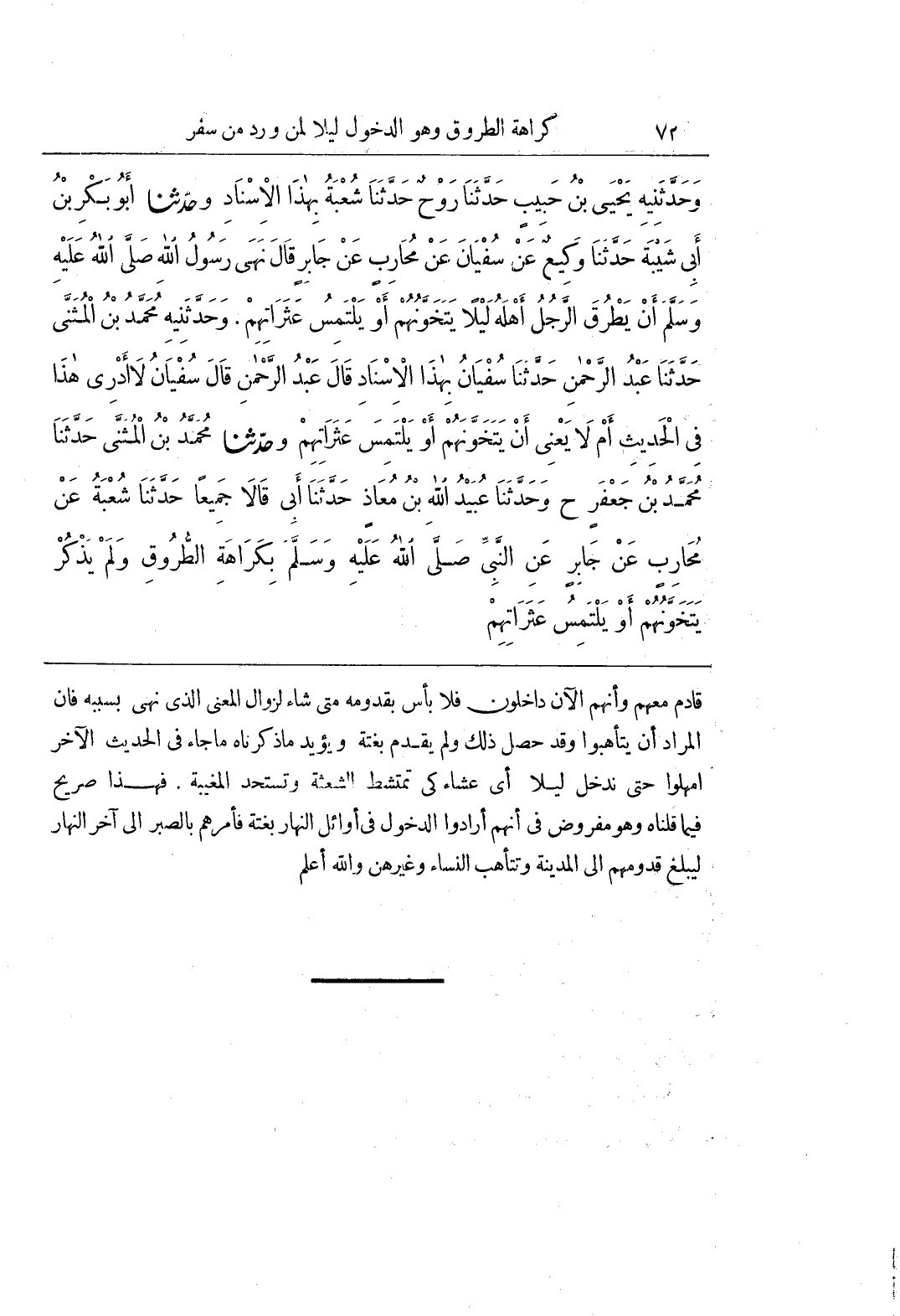 [715] الْحَدِيثِ الْآخِرِ أَمْهِلُوا حَتَّى نَدْخُلَ لَيْلًا أَيْ عِشَاءً كَيْ تَمْتَشِطَ الشَّعِثَةُ وَتَسْتَحِدَّ الْمُغِيبَةُ فَهَذَا صَرِيحٌ فِيمَا قُلْنَاهُ وَهُوَ مَفْرُوضٌ فِي أَنَّهُمْ أَرَادُوا الدُّخُولَ فِي أَوَائِلِ النَّهَارِ بَغْتَةً فَأَمَرَهُمْ بِالصَّبْرِ إِلَى آخِرِ النَّهَارِ لِيَبْلُغَ قُدُومُهُمْ إِلَى الْمَدِينَةِ وَتَتَأَهَّبَ النِّسَاءُ وَغَيْرُهُنَّ والله أعلم