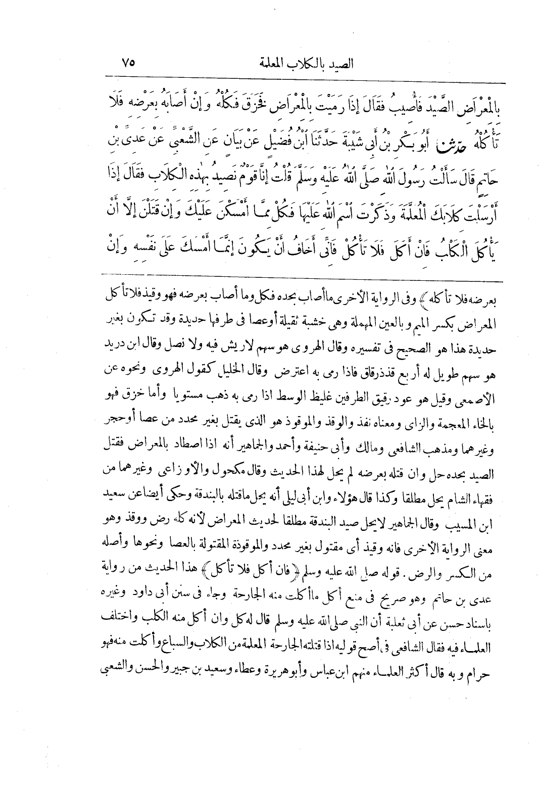 بِعَرْضِهِ فَلَا تَأْكُلْهُ) وَفِي الرِّوَايَةِ الْأُخْرَى مَا أَصَابَ بِحَدِّهِ فَكُلْ وَمَا أَصَابَ بِعَرْضِهِ فَهُوَ وَقِيذٌ فَلَا تَأْكُلْ الْمِعْرَاضُ بِكَسْرِ الْمِيمِ وَبِالْعَيْنِ الْمُهْمَلَةِ وَهِيَ خَشَبَةٌ ثَقِيلَةٌ أَوْ عَصًا فِي طَرَفِهَا حَدِيدَةٌ وَقَدْ تَكُونُ بِغَيْرِ حَدِيدَةٍ هَذَا هُوَ الصَّحِيحُ فِي تَفْسِيرِهِ وَقَالَ الْهَرَوِيُّ هُوَ سَهْمٌ لَا رِيشَ فِيهِ وَلَا نَصْلَ وَقَالَ بن دُرَيْدٍ هُوَ سَهْمٌ طَوِيلٌ لَهُ أَرْبَعُ قُذَذٍ رِقَاقٍ فَإِذَا رَمَى بِهِ اعْتَرَضَ وَقَالَ الْخَلِيلُ كَقَوْلِ الْهَرَوِيِّ وَنَحْوُهُ عَنِ الْأَصْمَعِيِّ وَقِيلَ هُوَ عُودٌ رَقِيقُ الطَّرَفَيْنِ غَلِيظُ الْوَسَطِ إِذَا رُمِيَ بِهِ ذَهَبَ مُسْتَوِيًا وَأَمَّا خَزَقَ فَهُوَ بِالْخَاءِ الْمُعْجَمَةِ وَالزَّايِ وَمَعْنَاهُ نَفَذَ وَالْوَقْذُ وَالْمَوْقُوذُ هُوَ الَّذِي يُقْتَلُ بِغَيْرِ مُحَدَّدٍ مِنْ عَصًا أَوْ حَجَرٍ وَغَيْرِهِمَا وَمَذْهَبُ الشَّافِعِيِّ وَمَالِكٍ وَأَبِي حَنِيفَةَ وَأَحْمَدَ وَالْجَمَاهِيرِ أَنَّهُ إِذَا اصْطَادَ بِالْمِعْرَاضِ فَقَتَلَ الصَّيْدَ بِحَدِّهِ حَلَّ وَإِنْ قَتَلَهُ بِعَرْضِهِ لَمْ يَحِلَّ لِهَذَا الْحَدِيثِ وَقَالَ مَكْحُولٌ وَالْأَوْزَاعِيُّ وَغَيْرُهُمَا مِنْ فُقَهَاءِ الشَّامِ يَحِلُّ مُطْلَقًا وَكَذَا قَالَ هؤلاء وبن أبى ليلى أنه يحل ما قتله بالبندقية وَحُكِيَ أَيْضًا عَنْ سَعِيدِ بْنِ الْمُسَيِّبِ وَقَالَ الجماهير لا يحل صيد البندقية مُطْلَقًا لِحَدِيثِ الْمِعْرَاضِ لِأَنَّهُ كُلَّهُ رَضٌّ وَوَقْذٌ وَهُوَ مَعْنَى الرِّوَايَةِ الْأُخْرَى فَإِنَّهُ وَقِيذٌ أَيْ مَقْتُولٌ بِغَيْرِ مُحَدَّدٍ وَالْمَوْقُوذَةُ الْمَقْتُولَةُ بِالْعَصَا وَنَحْوِهَا وَأَصْلُهُ مِنَ الْكَسْرِ وَالرَّضِّ قَوْلُهُ صَلَّى اللَّهُ عَلَيْهِ وَسَلَّمَ (فَإِنْ أَكَلَ فَلَا تَأْكُلْ) هَذَا الْحَدِيثُ مِنْ رِوَايَةِ عَدِيِّ بْنِ حَاتِمٍ وَهُوَ صَرِيحٌ فِي مَنْعِ أَكْلِ مَا أَكَلَتْ مِنْهُ الْجَارِحَةُ وَجَاءَ فِي سُنَنِ أَبِي دَاوُدَ وَغَيْرِهِ بِإِسْنَادٍ حَسَنٍ عَنْ أَبِي ثَعْلَبَةَ أَنَّ النَّبِيَّ صَلَّى اللَّهُ عَلَيْهِ وَسَلَّمَ قَالَ لَهُ كُلْ وَإِنْ أَكَلَ مِنْهُ الْكَلْبُ وَاخْتَلَفَ الْعُلَمَاءُ فِيهِ فَقَالَ الشَّافِعِيُّ فِي أَصَحِّ قَوْلَيْهِ إِذَا قَتَلَتْهُ الْجَارِحَةُ الْمُعَلَّمَةُ مِنَ الْكِلَابِ وَالسِّبَاعِ وَأَكَلَتَ مِنْهُ فَهُوَ حَرَامٌ وَبِهِ قَالَ أَكْثَرُ الْعُلَمَاءِ مِنْهُمُ بن عَبَّاسٍ وَأَبُو هُرَيْرَةَ وَعَطَاءٌ وَسَعِيدُ بْنُ جُبَيْرٍ والحسن والشعبى