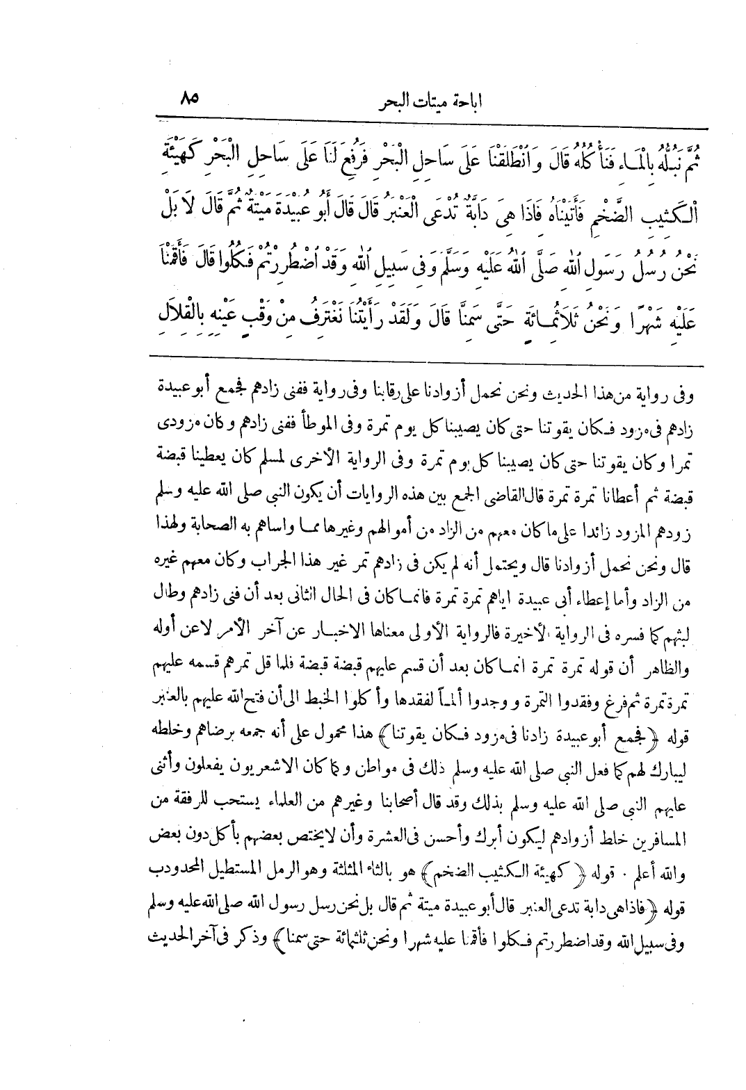 وَفِي رِوَايَةٍ مِنْ هَذَا الْحَدِيثِ وَنَحْنُ نَحْمِلُ أَزْوَادَنَا عَلَى رِقَابِنَا وَفِي رِوَايَةٍ فَفَنِيَ زَادُهُمْ فَجَمَعَ أَبُو عُبَيْدَةَ زَادَهُمْ فِي مِزْوَدٍ فَكَانَ يقوتنا حتى كان يصيبنا كل يوم تمرة وفى الموطأ ففنى زادهم وكان مزودى تمرا وَكَانَ يُقَوِّتُنَا حَتَّى كَانَ يُصِيبُنَا كُلَّ يَوْمٍ تَمْرَةً وَفِي الرِّوَايَةِ الْأُخْرَى لِمُسْلِمٍ كَانَ يُعْطِينَا قَبْضَةً قَبْضَةً ثُمَّ أَعْطَانَا تَمْرَةً تَمْرَةً قَالَ الْقَاضِي الْجَمْعُ بَيْنَ هَذِهِ الرِّوَايَاتِ أَنْ يَكُونَ النَّبِيُّ صَلَّى اللَّهُ عَلَيْهِ وَسَلَّمَ زَوَّدَهُمُ الْمِزْوَدَ زَائِدًا عَلَى مَا كَانَ مَعَهُمْ مِنَ الزَّادِ مِنْ أَمْوَالِهِمْ وَغَيْرِهَا مِمَّا وَاسَاهُمْ بِهِ الصَّحَابَةُ وَلِهَذَا قَالَ وَنَحْنُ نَحْمِلُ أَزْوَادَنَا قَالَ وَيَحْتَمِلُ أَنَّهُ لَمْ يكُنْ فِي زَادِهِمْ تَمْرٌ غَيْرُ هَذَا الْجِرَابِ وَكَانَ مَعَهُمْ غَيْرُهُ مِنَ الزَّادِ وَأَمَّا إِعْطَاءُ أَبِي عُبَيْدَةَ إِيَّاهُمْ تَمْرَةً تَمْرَةً فإنما كان فى الحال الثانى بَعْدَ أَنْ فَنِيَ زَادُهُمْ وَطَالَ لُبْثُهُمْ كَمَا فَسَّرَهُ فِي الرِّوَايَةِ الْأَخِيرَةِ فَالرِّوَايَةُ الْأُولَى مَعْنَاهَا الْإِخْبَارُ عَنْ آخِرِ الْأَمْرِ لَا عَنْ أَوَّلِهِ وَالظَّاهِرُ أَنَّ قَوْلَهُ تَمْرَةً تَمْرَةً إِنَّمَا كَانَ بَعْدَ أَنْ قَسَمَ عَلَيْهِمْ قَبْضَةً قَبْضَةً فَلَمَّا قَلَّ تَمْرُهُمْ قَسَمَهُ عَلَيْهِمْ تَمْرَةً تَمْرَةً ثُمَّ فرغ وفقدوا التمرة ووجدوا أَلَمًا لِفَقْدِهَا وَأَكَلُوا الْخَبَطَ إِلَى أَنْ فَتَحَ اللَّهُ عَلَيْهِمْ بِالْعَنْبَرِ قَوْلُهُ (فَجَمَعَ أَبُو عُبَيْدَةَ زَادَنَا فِي مِزْوَدٍ فَكَانَ يُقَوِّتُنَا) هَذَا مَحْمُولٌ عَلَى أَنَّهُ جَمَعَهُ بِرِضَاهُمْ وَخَلَطَهُ لِيُبَارَكَ لَهُمْ كَمَا فَعَلَ النَّبِيُّ صَلَّى اللَّهُ عَلَيْهِ وَسَلَّمَ ذَلِكَ فِي مَوَاطِنَ وَكَمَا كَانَ الْأَشْعَرِيُّونَ يَفْعَلُونَ وَأَثْنَى عَلَيْهِمُ النَّبِيُّ صَلَّى اللَّهُ عَلَيْهِ وَسَلَّمَ بِذَلِكَ وَقَدْ قَالَ أَصْحَابُنَا وَغَيْرُهُمْ مِنَ الْعُلَمَاءِ يُسْتَحَبُّ لِلرُّفْقَةِ مِنَ الْمُسَافِرِينَ خَلْطُ أَزْوَادِهِمْ لِيَكُونَ أبرك وأحسن فى العشرة وأن لا يَخْتَصَّ بَعْضُهُمْ بِأَكْلٍ دُونَ بَعْضٍ وَاللَّهُ أَعْلَمُ قَوْلُهُ (كَهَيْئَةِ الْكَثِيبِ الضَّخْمِ) هُوَ بِالثَّاءِ الْمُثَلَّثَةِ وَهُوَ الرَّمْلُ الْمُسْتَطِيلُ الْمُحْدَوْدَبُ