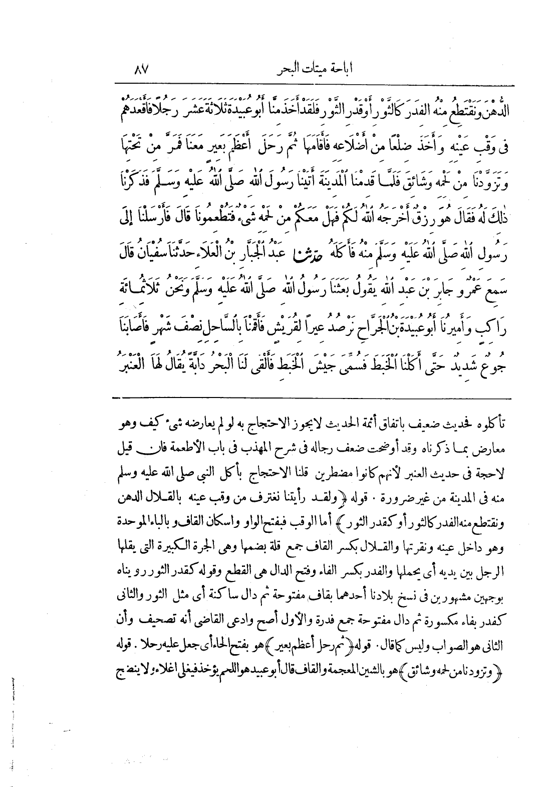تأكلوا فحديث ضيعف بِاتِّفَاقِ أَئِمَّةِ الْحَدِيثِ لَا يَجُوزُ الِاحْتِجَاجُ بِهِ لو لم يعارضه شئ كيف وهو معارض بما ذكرنا وَقَدْ أَوْضَحْتُ ضَعْفَ رِجَالِهِ فِي شَرْحِ الْمُهَذَّبِ فِي بَابِ الْأَطْعِمَةِ فَإِنْ قِيلَ لَا حُجَّةَ فِي حَدِيثِ الْعَنْبَرِ لِأَنَّهُمْ كَانُوا مُضْطَرِّينَ قُلْنَا الِاحْتِجَاجُ بِأَكْلِ النَّبِيِّ صَلَّى اللَّهُ عَلَيْهِ وَسَلَّمَ مِنْهُ فِي الْمَدِينَةِ مِنْ غَيْرِ ضَرُورَةٍ قَوْلُهُ (ولقد رأيتنا تغترف مِنْ وَقْبِ عَيْنِهِ بِالْقِلَالِ الدُّهْنَ وَنَقْتَطِعُ مِنْهُ الْفِدَرَ كَالثَّوْرِ أَوْ كَقَدْرِ الثَّوْرِ) أَمَّا الْوَقْبُ فبفتح الواو واسكان القاف والباء الموحدة وهو داخل عينه ونقرتها والقلال بِكَسْرِ الْقَافِ جَمْعُ قُلَّةٍ بِضَمِّهَا وَهِيَ الْجَرَّةُ الْكَبِيرَةُ الَّتِي يُقِلُّهَا الرَّجُلُ بَيْنَ يَدَيْهِ أَيْ يحملها والفدر بِكَسْرِ الْفَاءِ وَفَتْحِ الدَّالِ هِيَ الْقِطَعُ وَقَوْلُهُ كَقَدْرِ الثَّوْرِ رَوَيْنَاهُ بِوَجْهَيْنِ مَشْهُورَيْنِ فِي نُسَخِ بِلَادِنَا أَحَدُهُمَا بِقَافٍ مَفْتُوحَةٍ ثُمَّ دَالٍ سَاكِنَةٍ أَيْ مِثْلُ الثَّوْرِ وَالثَّانِي كَفِدَرِ بِفَاءٍ مَكْسُورَةٍ ثُمَّ دَالٍ مَفْتُوحَةٍ جَمْعُ فِدْرَةٍ وَالْأَوَّلُ أَصَحُّ وَادَّعَى الْقَاضِي أَنَّهُ تَصْحِيفٌ وَأَنَّ الثَّانِي هُوَ الصَّوَابُ وَلَيْسَ كَمَا قَالَ قَوْلُهُ (ثُمَّ رَحَلَ أَعْظَمَ بَعِيرٍ) هُوَ بِفَتْحِ الْحَاءِ أَيْ جَعَلَ عليه رحلا قوله (وتوزدنا مِنْ لَحْمِهِ وَشَائِقَ) هُوَ بِالشِّينِ الْمُعْجَمَةِ وَالْقَافِ قَالَ أَبُو عُبَيْدٍ هُوَ اللَّحْمُ يُؤْخَذُ فَيُغْلَى اعلاء ولا ينضج