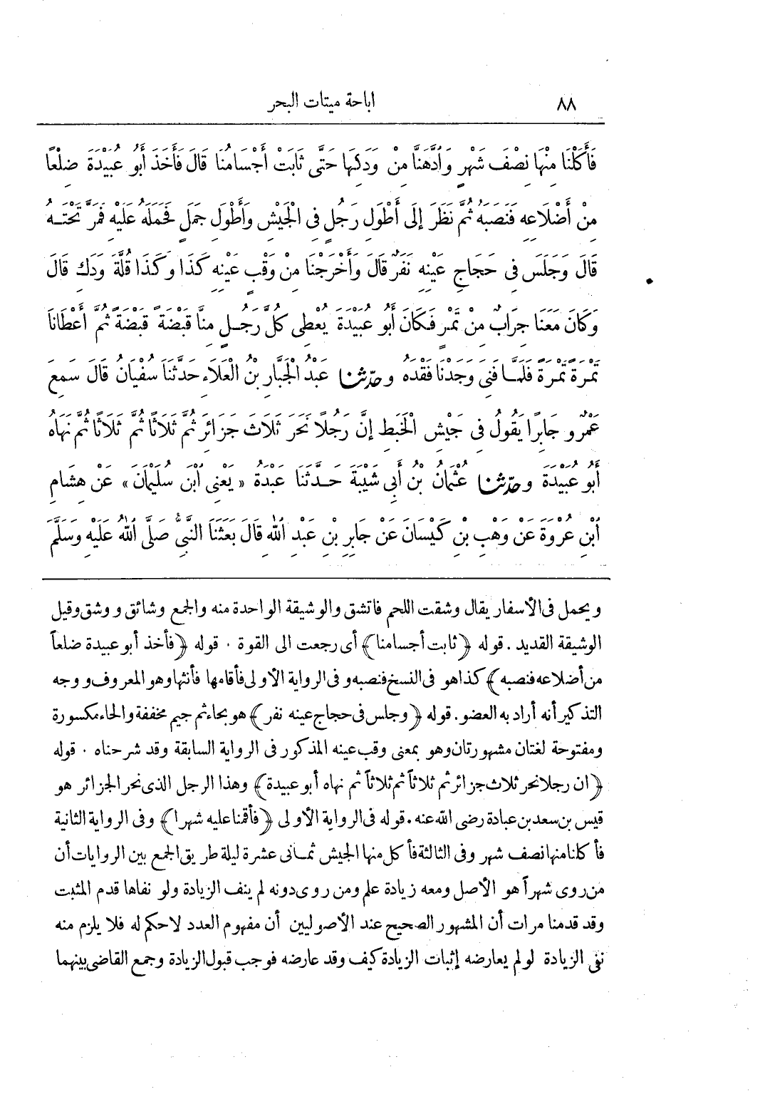 وَيُحْمَلُ فِي الْأَسْفَارِ يُقَالٍ وَشَقْتُ اللَّحْمَ فَاتَّشَقَ وَالْوَشِيقَةُ الْوَاحِدَةُ مِنْهُ وَالْجَمْعُ وَشَائِقُ وَوُشُقٌ وَقِيلَ الوشيق الْقَدِيدُ قَوْلُهُ (ثَابَتْ أَجْسَامِنَا) أَيْ رَجَعَتْ إِلَى القوة قوله (فيأخذ أبو عبيدة ضلعا من أضلاعه فتصبه) كذا هو فى النسخ فتصبه وَفِي الرِّوَايَةِ الْأُولَى فَأَقَامَهَا فَأَنَّثَهَا وَهُوَ الْمَعْرُوفُ وَوَجْهُ التَّذْكِيرِ أَنَّهُ أَرَادَ بِهِ الْعُضْوَ قَوْلُهُ (وَجَلَسَ فِي حَجَاجِ عَيْنِهِ نَفَرٌ) هُوَ بِحَاءٍ ثُمَّ جِيمٍ مُخَفَّفَةٍ وَالْحَاءُ مَكْسُورَةٌ وَمَفْتُوحَةٌ لُغَتَانِ مَشْهُورَتَانِ وَهُوَ بِمَعْنَى وَقْبِ عَيْنِهِ الْمَذْكُورِ فِي الرِّوَايَةِ السَّابِقَةِ وَقَدْ شَرَحْنَاهُ قَوْلُهُ (إِنَّ رَجُلًا نَحَرَ ثَلَاثَ جَزَائِرَ ثُمَّ ثَلَاثًا ثُمَّ ثَلَاثًا ثُمَّ نَهَاهُ أَبُو عُبَيْدَةَ) وَهَذَا الرَّجُلُ الَّذِي نَحَرَ الْجَزَائِرَ هُوَ قَيْسُ بْنُ سَعْدِ بْنِ عبادة رضى الله قَوْلُهُ فِي الرِّوَايَةِ الْأُولَى (فَأَقَمْنَا عَلَيْهِ شَهْرًا) وَفِي الرِّوَايَةِ الثَّانِيَةِ فَأَكَلْنَا مِنْهَا نِصْفَ شَهْرٍ وَفِي الثَّالِثَةِ فَأَكَلَ مِنْهَا الْجَيْشُ ثَمَانِيَ عَشْرَةَ لَيْلَةٍ طَرِيقُ الْجَمْعِ بَيْنَ الرِّوَايَاتِ أَنَّ مَنْ رَوَى شَهْرًا هُوَ الْأَصْلُ وَمَعَهُ زِيَادَةُ عِلْمٍ وَمَنْ رَوَى دُونَهُ لَمْ يَنْفِ الزِّيَادَةَ وَلَوْ نَفَاهَا قَدَّمَ الْمُثْبَتَ وَقَدْ قَدَّمْنَا مَرَّاتٍ أَنَّ الْمَشْهُورَ الصَّحِيحَ عِنْدَ الْأُصُولِيِّينَ أَنَّ مَفْهُومَ الْعَدَدِ لَا حُكْمَ لَهُ فَلَا يَلْزَمُ مِنْهُ نَفْيُ الزِّيَادَةِ لَوْ لَمْ يُعَارِضْهُ إِثْبَاتُ الزِّيَادَةِ كَيْفَ وَقَدْ عَارَضَهُ فَوَجَبَ قَبُولُ الزِّيَادَةِ وَجَمَعَ الْقَاضِي بينهما
