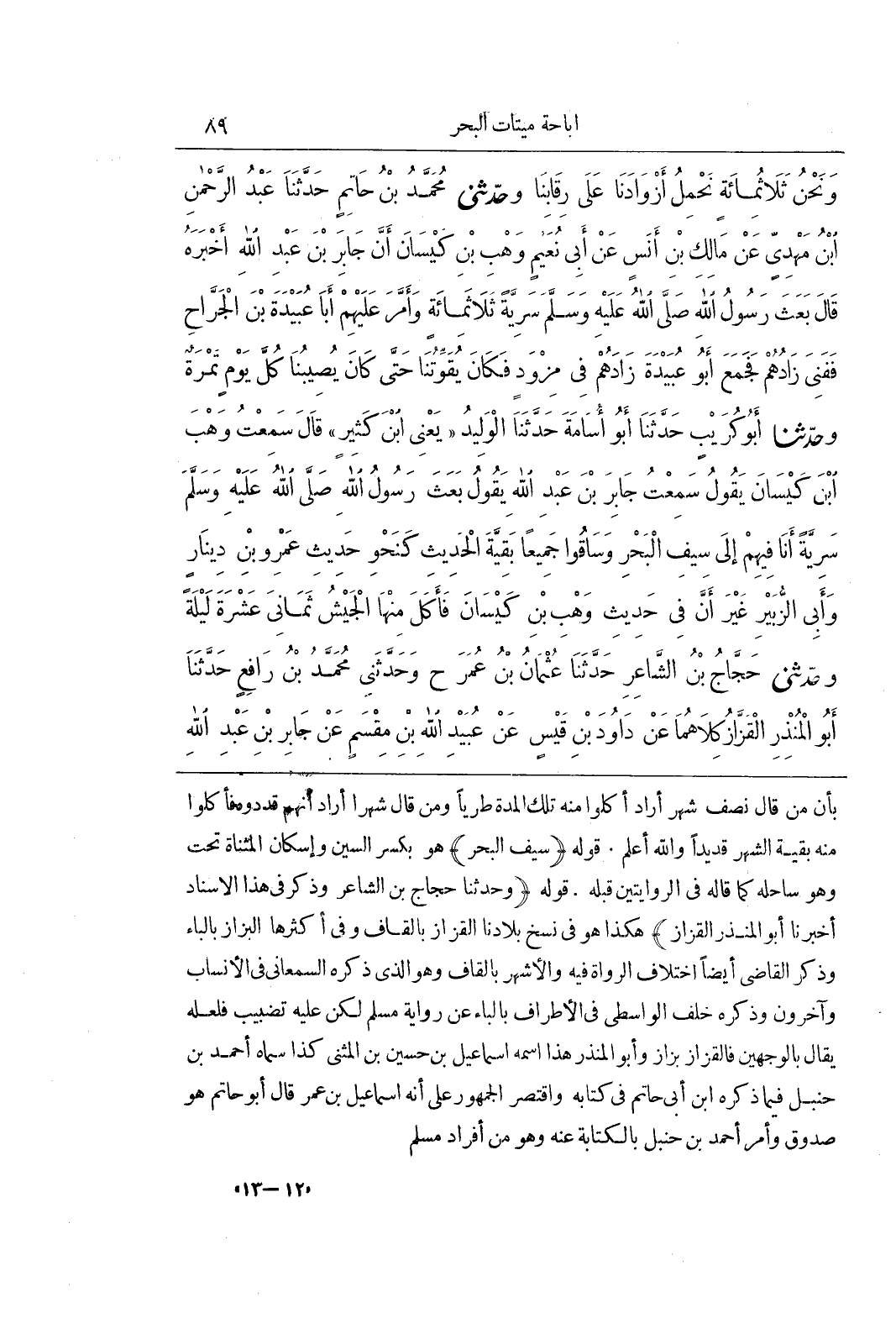 بِأَنَّ مَنْ قَالَ نِصْفَ شَهْرٍ أَرَادَ أَكَلُوا مِنْهُ تِلْكَ الْمُدَّةَ طَرِيًّا وَمَنْ قَالَ شَهْرًا أراد قَدَّدُوهُ فَأَكَلُوا مِنْهُ بَقِيَّةَ الشَّهْرِ قَدِيدًا وَاللَّهُ أَعْلَمُ قَوْلُهُ (سِيفُ الْبَحْرِ) هُوَ بِكَسْرِ السِّينِ وإسكان المثناة تحت وهو ساحله كما قاله فِي الرِّوَايَتَيْنِ قَبْلَهُ قَوْلُهُ (وَحَدَّثَنَا حَجَّاجُ بْنُ الشَّاعِرِ وَذَكَرَ فِي هَذَا الْإِسْنَادِ أَخْبَرْنَا أَبُو الْمُنْذِرِ الْقَزَّازُ) هَكَذَا هُوَ فِي نُسَخِ بِلَادِنَا الْقَزَّازُ بِالْقَافِ وَفِي أَكْثَرِهَا الْبَزَّازُ بِالْبَاءِ وَذَكَرَ الْقَاضِي أَيْضًا اخْتِلَافَ الرُّوَاةِ فِيهِ وَالْأَشْهَرُ بِالْقَافِ وَهُوَ الَّذِي ذَكَرَهُ السَّمْعَانِيُّ فِي الْأَنْسَابِ وَآخَرُونَ وَذَكَرَهُ خَلَفُ الْوَاسِطِيُّ فِي الْأَطْرَافِ بِالْبَاءِ عَنْ رِوَايَةِ مُسْلِمٍ لَكِنْ عَلَيْهِ تَضْبِيبٌ فَلَعَلَّهُ يُقَالُ بالوجهين فالقزاز بزاز وأبو المنذر هذا اسْمُهُ إِسْمَاعِيلُ بْنُ حُسَيْنِ بْنِ الْمُثَنَّى كَذَا سماه أحمد بن حنبل فيما ذكره بن أَبِي حَاتِمٍ فِي كِتَابِهِ وَاقْتَصَرَ الْجُمْهُورُ عَلَى أَنَّهُ إِسْمَاعِيلُ بْنُ عُمَرَ قَالَ أَبُو حَاتِمٍ هُوَ صَدُوقٌ وَأَمَرَ أَحْمَدُ بْنُ حَنْبَلٍ بِالْكِتَابَةِ عنه وهو من أفراد مسلم