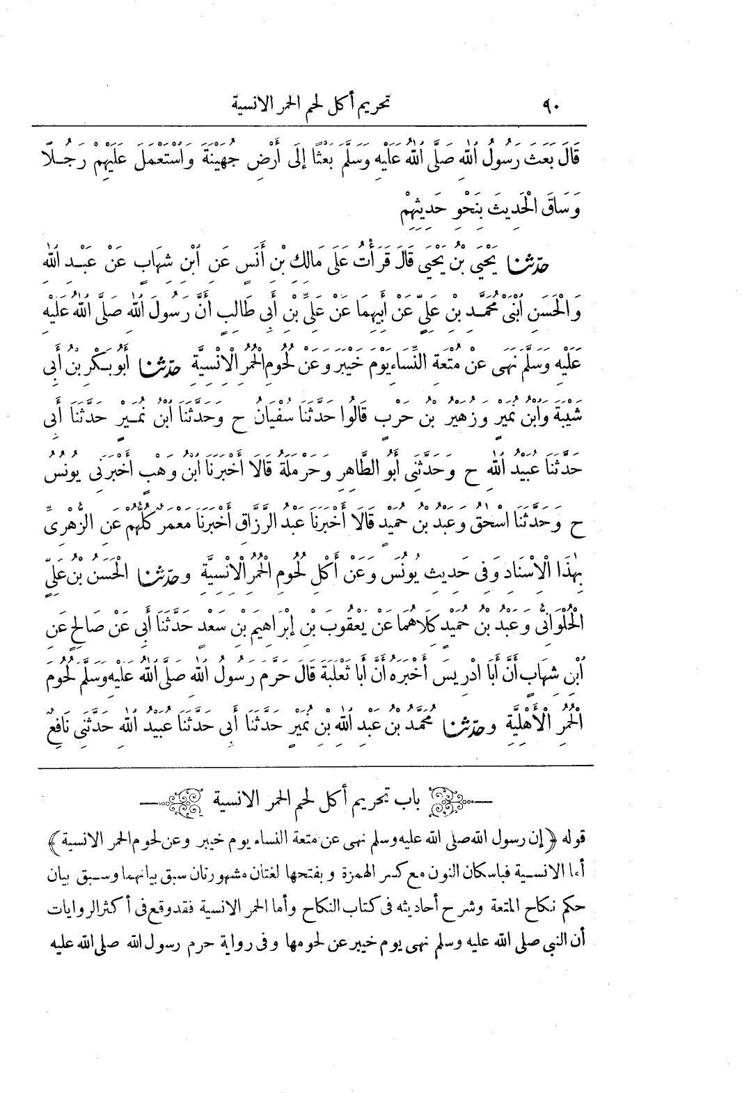 [1407] قَوْلُهُ (أَنَّ رَسُولَ اللَّهِ صَلَّى اللَّهُ عَلَيْهِ وَسَلَّمَ نَهَى عَنْ مُتْعَةِ النِّسَاءِ يَوْمَ خَيْبَرَ وَعَنْ لُحُومِ الْحُمُرِ الْإِنْسِيَّةِ) أَمَّا الْإِنْسِيَّةُ فَبِإِسْكَانِ النُّونِ مَعَ كَسْرِ الْهَمْزَةِ وَبِفَتْحِهَا لُغَتَانِ مَشْهُورَتَانِ سَبَقَ بَيَانُهُمَا وَسَبَقَ بَيَانُ حُكْمِ نِكَاحِ الْمُتْعَةِ وَشَرْحُ أَحَادِيثِهِ فِي كِتَابِ النِّكَاحِ وَأَمَّا الْحُمُرُ الْإِنْسِيَّةُ فَقَدْ وَقَعَ فِي أَكْثَرِ الرِّوَايَاتِ إِنَّ النَّبِيَّ صَلَّى اللَّهُ عَلَيْهِ وَسَلَّمَ نَهَى يَوْمَ خَيْبَرَ عَنْ لُحُومِهَا وَفِي رِوَايَةٍ