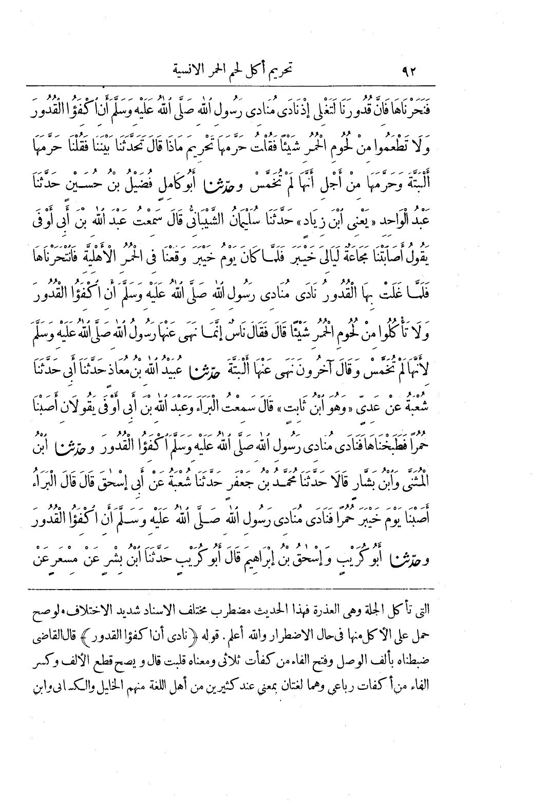[1937] (نادى أن اكفؤا الْقُدُورَ) قَالَ الْقَاضِي ضَبَطْنَاهُ بِأَلِفِ الْوَصْلِ وَفَتْحِ الْفَاءِ مِنْ كَفَأْتُ ثُلَاثِيٌ وَمَعْنَاهُ قَلَبْتُ قَالَ وَيَصِحُّ قَطْعُ الْأَلِفِ وَكَسْرُ الْفَاءِ مِنْ أَكْفَأْتُ رُبَاعِيٌّ وَهُمَا لُغَتَانِ بِمَعْنًى عِنْدَ كَثِيرِينَ مِنْ أهل اللغة منهم الخليل والكسائى وبن
