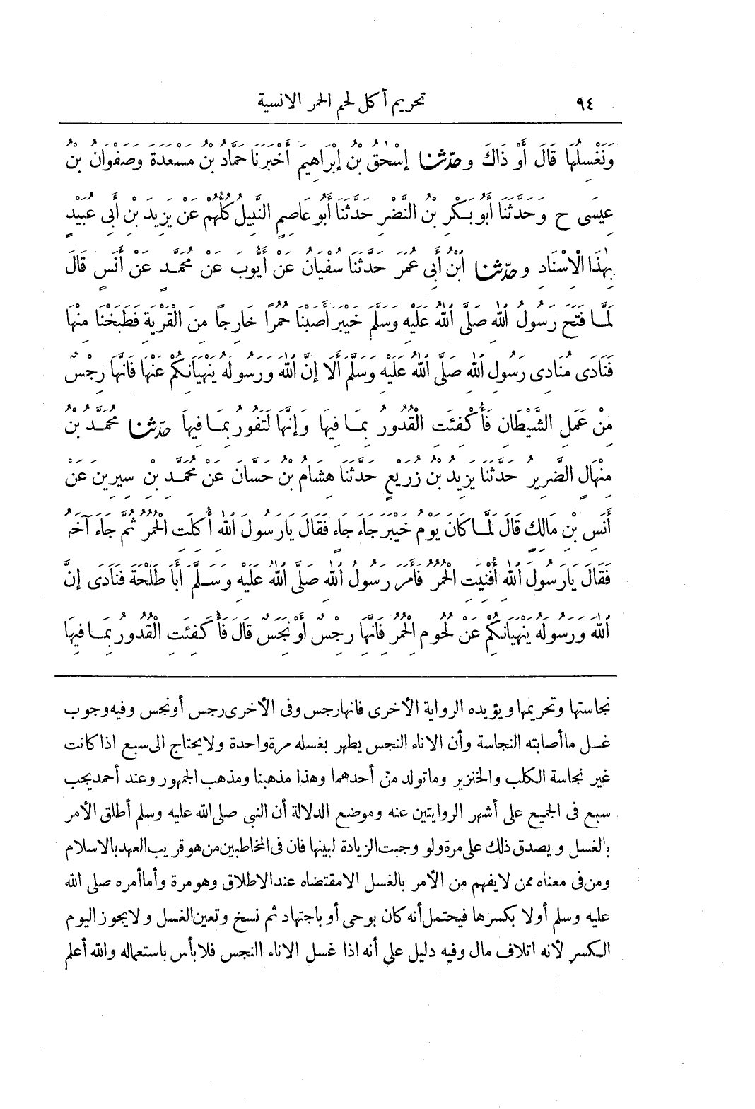 نَجَاسَتِهَا وَتَحْرِيمِهَا وَيُؤَيِّدُهُ الرِّوَايَةُ الْأُخْرَى فَإِنَّهَا رِجْسٌ وَفِي الْأُخْرَى رِجْسٌ أَوْ نَجَسٌ وَفِيهِ وُجُوبُ غَسْلِ مَا أَصَابَتْهُ النَّجَاسَةُ وَأَنَّ الْإِنَاءَ النَّجِسَ يَطْهُرُ بِغَسْلِهِ مَرَّةً وَاحِدَةً وَلَا يَحْتَاجُ إِلَى سَبْعٍ إِذَا كَانَتْ غَيْرَ نَجَاسَةِ الْكَلْبِ وَالْخِنْزِيرِ وَمَا تَوَلَّدَ مِنْ أَحَدِهِمَا وَهَذَا مَذْهَبُنَا وَمَذْهَبُ الْجُمْهُورِ وَعِنْدَ أَحْمَدَ يَجِبُ سَبْعٌ فِي الْجَمِيعِ عَلَى أَشْهَرِ الرِّوَايَتَيْنِ عَنْهُ وَمَوْضِعُ الدَّلَالَةِ أَنَّ النَّبِيَّ صَلَّى اللَّهُ عَلَيْهِ وَسَلَّمَ أَطْلَقَ الْأَمْرَ بِالْغَسْلِ وَيَصْدُقُ ذَلِكَ عَلَى مَرَّةٍ وَلَوْ وَجَبَتِ الزِّيَادَةُ لَبَيَّنَهَا فَإِنَّ فِي الْمُخَاطَبِينَ مَنْ هُوَ قَرِيبُ الْعَهْدِ بِالْإِسْلَامِ وَمَنْ فِي مَعْنَاهُ مِمَّنْ لَا يَفْهَمُ مِنَ الْأَمْرِ بِالْغَسْلِ إِلَّا مُقْتَضَاهُ عِنْدَ الْإِطْلَاقِ وَهُوَ مَرَّةٌ وَأَمَّا أَمْرُهُ صَلَّى اللَّهُ عَلَيْهِ وَسَلَّمَ أَوَّلًا بِكَسْرِهَا فَيُحْتَمَلُ أَنَّهُ كَانَ بِوَحْيٍ أَوْ بِاجْتِهَادٍ ثُمَّ نُسِخَ وَتَعَيَّنَ الْغَسْلُ وَلَا يَجُوزُ الْيَوْمَ الْكَسْرُ لِأَنَّهُ إِتْلَافُ مَالٍ وَفِيهِ دَلِيلٌ عَلَى أَنَّهُ إِذَا غُسِلَ الْإِنَاءُ النَّجِسُ فَلَا بَأْسَ بِاسْتِعْمَالِهِ وَاللَّهُ أَعْلَمُ