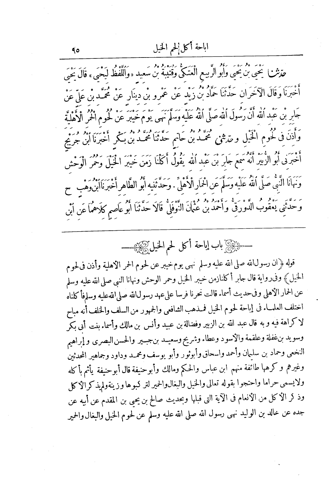 [1941] قَوْلُهُ (أَنَّ رَسُولَ اللَّهِ صَلَّى اللَّهُ عَلَيْهِ وَسَلَّمَ نَهَى يَوْمَ خَيْبَرَ عَنْ لُحُومِ الْحُمُرِ الْأَهْلِيَّةِ وَأَذِنَ فِي لُحُومِ الْخَيْلِ) وَفِي رِوَايَةٍ قَالَ جَابِرٌ أَكَلْنَا مِنْ خَيْبَرَ الْخَيْلَ وَحُمُرَ الْوَحْشِ وَنَهَانَا النَّبِيُّ صَلَّى اللَّهُ عَلَيْهِ وَسَلَّمَ عَنِ الْحِمَارِ الْأَهْلِيِّ