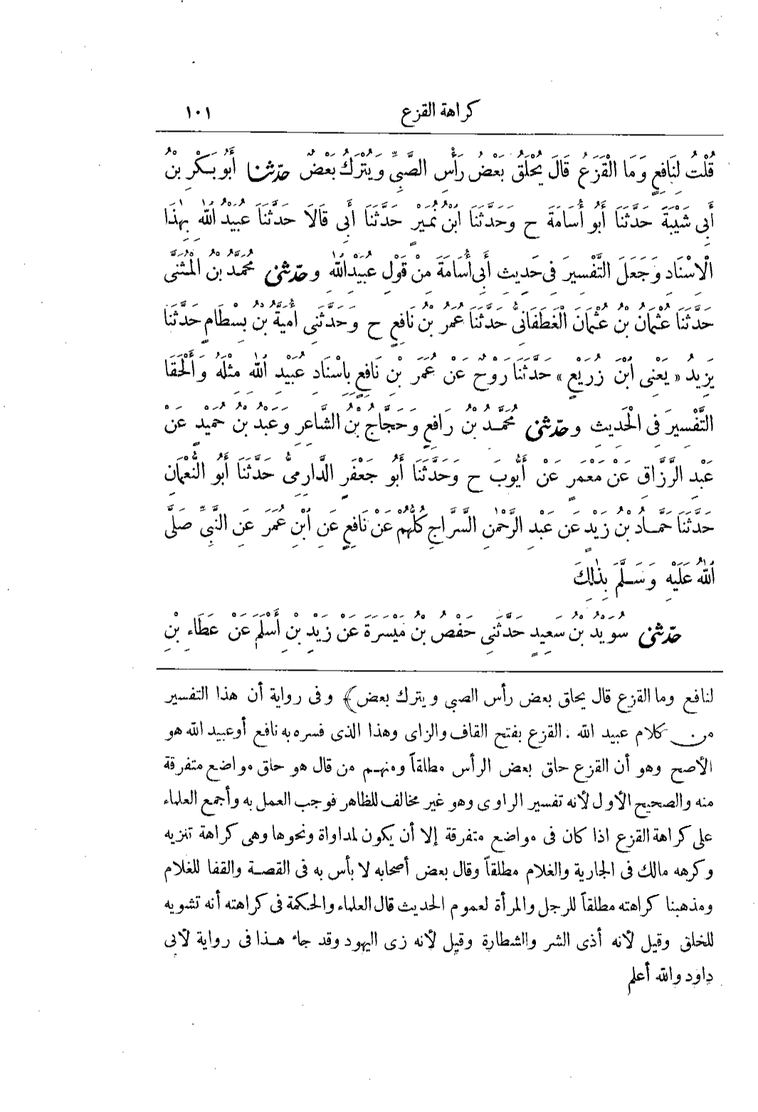 لِنَافِعٍ وَمَا الْقَزَعُ قَالَ يُحْلَقُ بَعْضُ رَأْسِ الصَّبِيِّ وَيُتْرَكُ بَعْضٌ) وَفِي رِوَايَةٍ أَنَّ هَذَا التَّفْسِيرَ مِنْ كَلَامِ عُبَيْدِ اللَّهِ الْقَزَعُ بِفَتْحِ الْقَافِ وَالزَّايِ وَهَذَا الَّذِي فَسَّرَهُ بِهِ نَافِعٌ أَوْ عُبَيْدُ اللَّهِ هُوَ الْأَصَحُّ وَهُوَ أَنَّ الْقَزَعَ حَلْقُ بَعْضِ الرَّأْسِ مُطْلَقًا وَمِنْهُمْ مَنْ قَالَ هُوَ حَلْقُ مَوَاضِعَ مُتَفَرِّقَةٍ مِنْهُ وَالصَّحِيحُ الْأَوَّلُ لِأَنَّهُ تَفْسِيرُ الرَّاوِي وَهُوَ غَيْرُ مُخَالِفٍ لِلظَّاهِرِ فَوَجَبَ الْعَمَلُ بِهِ وَأَجْمَعَ الْعُلَمَاءُ عَلَى كَرَاهَةِ الْقَزَعِ إِذَا كَانَ فِي مَوَاضِعَ مُتَفَرِّقَةٍ إِلَّا أَنْ يَكُونَ لِمُدَاوَاةٍ وَنَحْوِهَا وَهِيَ كَرَاهَةُ تَنْزِيهٍ وَكَرِهَهُ مَالِكٌ فِي الْجَارِيَةِ وَالْغُلَامِ مُطْلَقًا وقال بعض أصحابه لابأس بِهِ فِي الْقُصَّةِ وَالْقَفَا لِلْغُلَامِ وَمَذْهَبُنَا كَرَاهَتُهُ مُطْلَقًا لِلرَّجُلِ وَالْمَرْأَةِ لِعُمُومِ الْحَدِيثِ قَالَ الْعُلَمَاءُ وَالْحِكْمَةُ فِي كَرَاهَتِهِ أَنَّهُ تَشْوِيهٌ لِلْخَلْقِ وَقِيلَ لِأَنَّهُ أَذَى الشَّرِّ وَالشَّطَارَةِ وَقِيلَ لِأَنَّهُ زِيُّ الْيَهُودِ وَقَدْ جَاءَ هَذَا فِي رِوَايَةٍ لِأَبِي دَاوُدَ وَاللَّهُ أَعْلَمُ