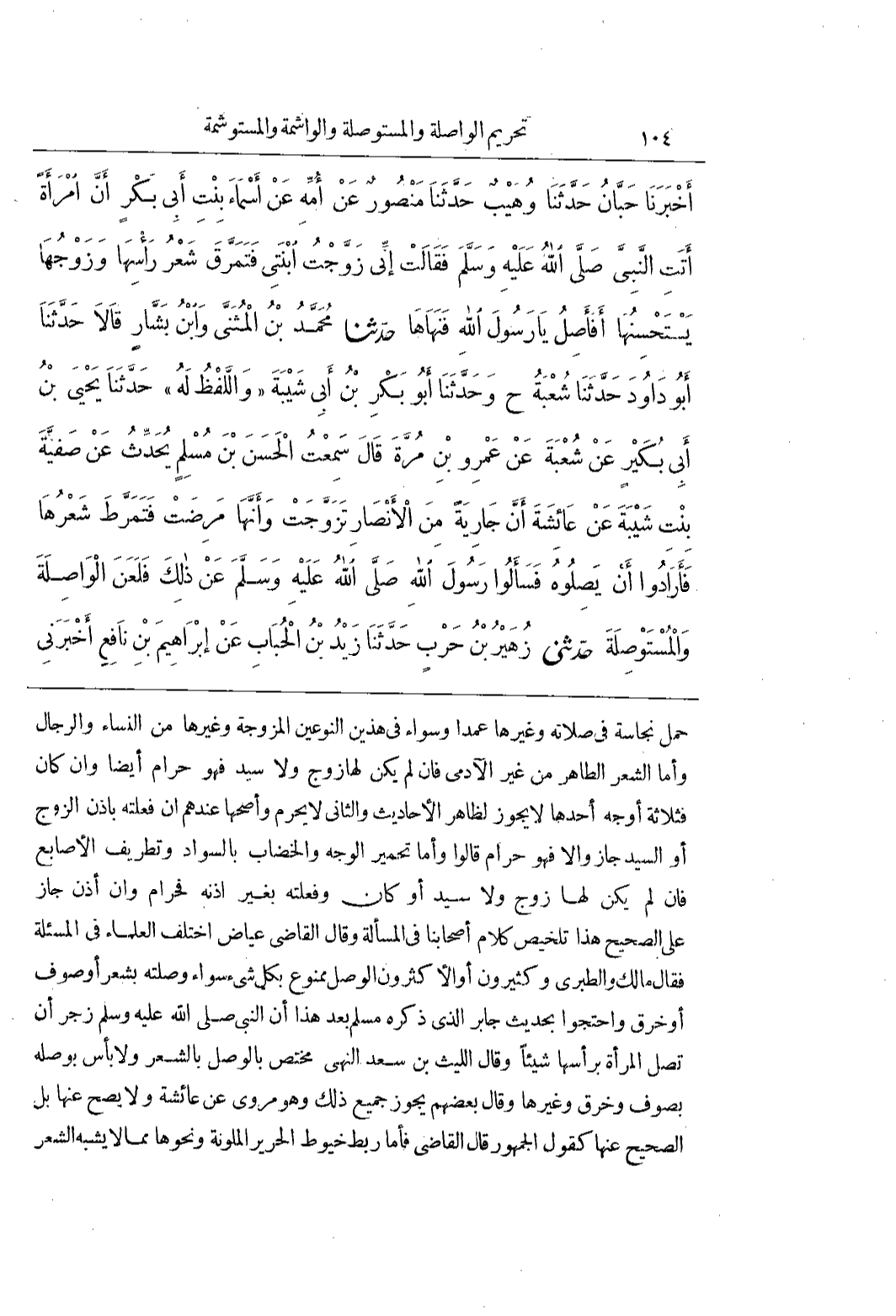 حَمَلَ نَجَاسَةً فِي صَلَاتِهِ وَغَيْرِهَا عَمْدًا وَسَوَاءٌ فى هذين النوعين المزوجةوغيرها مِنَ النِّسَاءِ وَالرِّجَالِ وَأَمَّا الشَّعْرُ الطَّاهِرُ مِنْ غَيْرِ الْآدَمِيِّ فَإِنْ لَمْ يَكُنْ لَهَا زَوْجٌ ولاسيد فَهُوَ حَرَامٌ أَيْضًا وَإِنْ كَانَ فَثَلَاثَةُ أَوْجُهٍ أحدها لايجوز لظاهر الأحاديث والثانى لايحرم وَأَصَحُّهَا عِنْدَهُمْ إِنْ فَعَلَتْهُ بِإِذْنِ الزَّوْجِ أَوِ السَّيِّدِ جَازَ وَإِلَّا فَهُوَ حَرَامٌ قَالُوا وَأَمَّا تَحْمِيرُ الْوَجْهِ وَالْخِضَابُ بِالسَّوَادِ وَتَطْرِيفُ الْأَصَابِعِ فَإِنْ لَمْ يَكُنْ لَهَا زَوْجٌ وَلَا سَيِّدٌ أَوْ كَانَ وَفَعَلَتْهُ بِغَيْرِ إِذْنِهِ فَحَرَامٌ وَإِنْ أَذِنَ جَازَ عَلَى الصَّحِيحِ هَذَا تَلْخِيصُ كَلَامِ أَصْحَابِنَا فِي الْمَسْأَلَةِ وَقَالَ الْقَاضِي عِيَاضٌ اخْتَلَفَ الْعُلَمَاءُ فِي الْمَسْأَلَةِ فَقَالَ مَالِكٌ وَالطَّبَرِيُّ وَكَثِيرُونَ أَوِ الْأَكْثَرُونَ الْوَصْلُ مَمْنُوعٌ بِكُلِّ شَيْءٍ سَوَاءٌ وَصَلَتْهُ بِشَعْرٍ أَوْ صُوفٍ أَوْ خِرَقٍ وَاحْتَجُّوا بِحَدِيثِ جابر الذى ذكره مُسْلِمٌ بَعْدَ هَذَا أَنَّ النَّبِيَّ صَلَّى اللَّهُ عَلَيْهِ وَسَلَّمَ زَجَرَ أَنْ تَصِلَ الْمَرْأَةُ بِرَأْسِهَا شَيْئًا وَقَالَ اللَّيْثُ بْنُ سَعْدٍ النَّهْيُ مُخْتَصٌّ بِالْوَصْلِ بِالشَّعْرِ وَلَا بَأْسَ بِوَصْلِهِ بِصُوفِ وَخِرَقٍ وَغَيْرِهَا وَقَالَ بَعْضُهُمْ يَجُوزُ جَمِيعُ ذَلِكَ وَهُوَ مروى عن عائشة ولايصح عَنْهَا بَلِ الصَّحِيحُ عَنْهَا كَقَوْلِ الْجُمْهُورِ قَالَ الْقَاضِي فَأَمَّا رَبْطُ خُيُوطِ الْحَرِيرِ الْمُلَوَّنَةِ وَنَحْوِهَا مما لايشبه الشعر