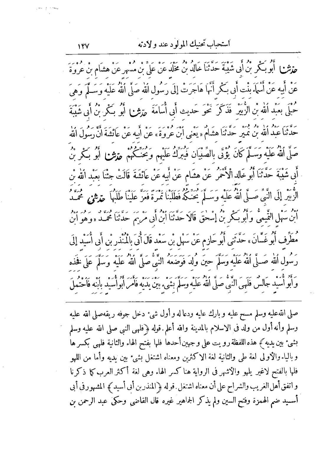صَلَّى اللَّهُ عَلَيْهِ وَسَلَّمَ مَسَحَ عَلَيْهِ وَبَارَكَ عَلَيْهِ وَدَعَا لَهُ وَأَوَّلُ شَيْءٍ دَخَلَ جَوْفَهُ رِيقُهُ صَلَّى اللَّهُ عَلَيْهِ وَسَلَّمَ وَأَنَّهُ أَوَّلُ مَنْ وُلِدَ فِي الْإِسْلَامِ بِالْمَدِينَةِ وَاللَّهُ أَعْلَمُ قَوْلُهُ (فَلَهِيَ النَّبِيُّ صَلَّى اللَّهُ عَلَيْهِ وَسَلَّمَ بِشَيْءٍ بَيْنَ يَدَيْهِ) هَذِهِ اللَّفْظَةُ رُوِيَتْ عَلَى وجهين أحدها فلها بفتح الهاء والثانية فلهى بكسرها وبالياءوالأولى لُغَةُ طَيٍّ وَالثَّانِيَةُ لُغَةُ الْأَكْثَرِينَ وَمَعْنَاهُ اشْتَغَلَ بِشَيْءٍ بَيْنَ يَدَيْهِ وَأَمَّا مِنَ اللَّهْوِ فَلَهَا بالفتح لاغير يلهو والأشهر فى الرواية هناكسر الْهَاءِ وَهِيَ لُغَةُ أَكْثَرِ الْعَرَبِ كَمَا ذَكَرْنَا وَاتَّفَقَ أَهْلُ الْغَرِيبِ وَالشُّرَّاحُ عَلَى أَنَّ مَعْنَاهُ اشْتَغَلَ