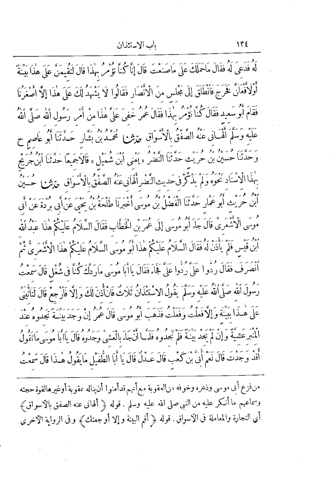 مِنْ فَزِعِ أَبِي مُوسَى وَذُعْرِهِ وَخَوْفِهِ مِنَ العقوبة مع أنهم قدأمنوا أَنْ يَنَالَهُ عُقُوبَةٌ أَوْ غَيْرُهَا لِقُوَّةِ حُجَّتِهِ وَسَمَاعِهِمْ مَا أَنْكَرَ عَلَيْهِ مِنَ النَّبِيِّ صَلَّى اللَّهُ عَلَيْهِ وَسَلَّمَ قَوْلُهُ (أَلْهَانِي عَنْهُ الصَّفْقُ بِالْأَسْوَاقِ) أَيِ التِّجَارَةُ وَالْمُعَامَلَةُ فِي الْأَسْوَاقِ قَوْلُهُ (أقم البينة وإلا أو جعتك) وَفِي الرِّوَايَةِ الْأُخْرَى