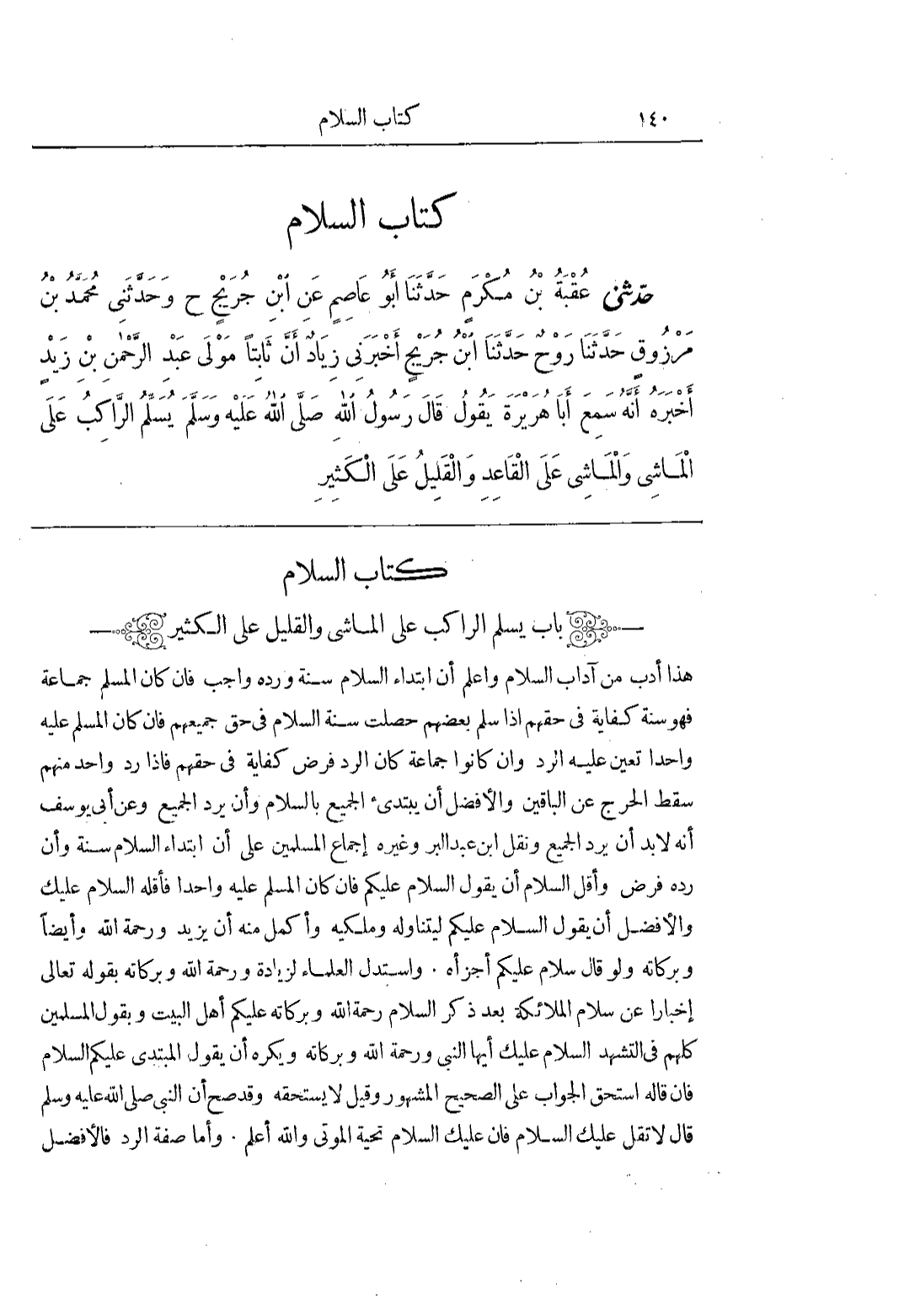 [2160] هَذَا أَدَبٌ مِنْ آدَابِ السَّلَامِ وَاعْلَمْ أَنَّ ابْتِدَاءَ السَّلَامِ سُنَّةٌ وَرَدُّهُ وَاجِبٌ فَإِنْ كَانَ الْمُسَلِّمُ جَمَاعَةً فَهُوَ سُنَّةُ كِفَايَةٍ فِي حَقِّهِمْ إِذَا سَلَّمَ بَعْضُهُمْ حَصَلَتْ سُنَّةُ السَّلَامِ فِي حَقِّ جَمِيعِهِمْ فَإِنْ كَانَ الْمُسَلِّمُ عَلَيْهِ وَاحِدًا تَعَيَّنَ عَلَيْهِ الرَّدُّ وَإِنْ كَانُوا جَمَاعَةً كَانَ الرَّدُّ فَرْضَ كِفَايَةٍ فِي حَقِّهِمْ فَإِذَا رَدَّ وَاحِدٌ مِنْهُمْ سَقَطَ الْحَرَجُ عَنِ الْبَاقِينَ وَالْأَفْضَلُ أَنْ يَبْتَدِئَ الْجَمِيعُ بِالسَّلَامِ وَأَنْ يَرُدَّ الْجَمِيعُ وَعَنْ أَبِي يُوسُفَ أَنَّهُ لابد أن يرد الجميع ونقل بن عَبْدِ الْبَرِّ وَغَيْرُهُ إِجْمَاعَ الْمُسْلِمِينَ عَلَى أَنَّ ابْتِدَاءَ السَّلَامِ سُنَّةٌ وَأَنَّ رَدَّهُ فَرْضٌ وَأَقَلُّ السَّلَامِ أَنْ يَقُولَ السَّلَامُ عَلَيْكُمْ فَإِنْ كَانَ الْمُسَلَّمُ عَلَيْهِ وَاحِدًا فَأَقَلُّهُ السَّلَامُ عَلَيْكَ وَالْأَفْضَلُ أَنْ يَقُولَ السَّلَامُ عَلَيْكُمْ لِيَتَنَاوَلَهُ وَمَلَكَيْهِ وَأَكْمَلُ مِنْهُ أَنْ يَزِيدَ وَرَحْمَةُ اللَّهِ وَأَيْضًا وَبَرَكَاتُهُ وَلَوْ قَالَ سَلَامٌ عَلَيْكُمْ أَجْزَأَهُ وَاسْتَدَلَّ الْعُلَمَاءُ لِزِيَادَةِ وَرَحْمَةُ اللَّهِ وَبَرَكَاتُهُ بِقَوْلِهِ تَعَالَى إِخْبَارًا عَنْ سَلَامِ الْمَلَائِكَةِ بَعْدَ ذِكْرِ السَّلَامِ رَحْمَةُ الله وبركاته عليكم أهل البيت وَبِقَوْلِ الْمُسْلِمِينَ كُلِّهِمْ فِي التَّشَهُّدِ السَّلَامُ عَلَيْكَ أَيُّهَا النَّبِيُّ وَرَحْمَةُ اللَّهِ وَبَرَكَاتُهُ وَيُكْرَهُ أَنْ يَقُولَ الْمُبْتَدِي عَلَيْكُمُ السَّلَامُ فَإِنْ قَالَهُ اسْتَحَقَّ الجواب على الصحيح المشهور وقيل لايستحقه وَقَدْ صَحَّ أَنَّ النَّبِيَّ صَلَّى اللَّهُ عَلَيْهِ وَسَلَّمَ قَالَ لاتقل عَلَيْكَ السَّلَامُ فَإِنَّ عَلَيْكَ السَّلَامُ تَحِيَّةُ الْمَوْتَى وَاللَّهُ أَعْلَمُ وَأَمَّا صِفَةُ الرَّدِّ فَالْأَفْضَلُ