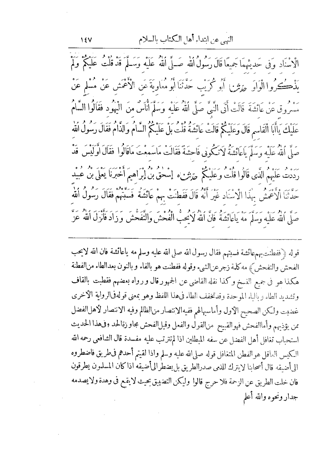 [2166] (فَفَطِنَتْ بِهِمْ عَائِشَةُ فَسَبَّتْهُمْ فَقَالَ رَسُولُ اللَّهِ صَلَّى اللَّهُ عَلَيْهِ وَسَلَّمَ مه ياعائشةفان الله لايحب الْفُحْشَ وَالتَّفَحُّشَ) مَهْ كَلِمَةُ زَجْرٍ عَنِ الشَّيْءِ وَقَوْلُهُ فَفَطِنَتْ هُوَ بِالْفَاءِ وَبِالنُّونِ بَعْدَ الطَّاءِ مِنَ الْفِطْنَةِ هَكَذَا هُوَ فِي جَمِيعِ النُّسَخِ وَكَذَا نَقَلَهُ الْقَاضِي عَنِ الْجُمْهُورِ قَالَ وَرَوَاهُ بَعْضُهُمْ فَقَطَّبَتْ بِالْقَافِ وَتَشْدِيدِ الطَّاءِ وَبِالْبَاءِ الْمُوَحَّدَةِ وقدتخفيف الطَّاءُ فِي هَذَا اللَّفْظِ وَهُوَ بِمَعْنَى قَوْلِهِ فِي الرِّوَايَةِ الْأُخْرَى غَضِبَتْ وَلَكِنَّ الصَّحِيحَ الْأَوَّلُ وَأَمَّا سَبُّهَا لَهُمْ فَفِيهِ الِانْتِصَارُ مِنَ الظَّالِمِ وَفِيهِ الِانْتِصَارُ لِأَهْلِ الْفَضْلِ مِمَّنْ يُؤْذِيهِمْ وَأَمَّا الْفُحْشُ فَهُوَ الْقَبِيحُ مِنَ الْقَوْلِ وَالْفِعْلِ وَقِيلَ الْفُحْشُ مُجَاوَزَةُ الْحَدِّ وَفِي هَذَا الْحَدِيثِ اسْتِحْبَابُ تَغَافُلِ أَهْلِ الْفَضْلِ عَنْ سَفَهِ الْمُبْطِلِينَ إِذَا لَمْ تَتَرَتَّبْ عَلَيْهِ مَفْسَدَةٌ قَالَ الشَّافِعِيُّ رَحِمَهُ اللَّهُ الْكَيِّسُ الْعَاقِلُ هُوَ الْفَطِنُ الْمُتَغَافِلُ قَوْلُهُ صَلَّى اللَّهُ عَلَيْهِ وَسَلَّمَ وَإِذَا لَقِيتُمْ أَحَدَهُمْ فِي طَرِيقٍ فَاضْطَرُّوهُ إِلَى أَضْيَقِهِ قَالَ أَصْحَابُنَا لايترك لِلذِّمِّيِّ صَدْرُ الطَّرِيقِ بَلْ يُضْطَرُّ إِلَى أَضْيَقِهِ إِذَا كَانَ الْمُسْلِمُونَ يَطْرُقُونَ فَإِنْ خَلَتِ الطَّرِيقُ عن الرحمة فلاحرج قالوا وليكن التضييق بحيث لايقع فى وهدة ولايصدمه جِدَارٌ وَنَحْوُهُ وَاللَّهُ أَعْلَمُ