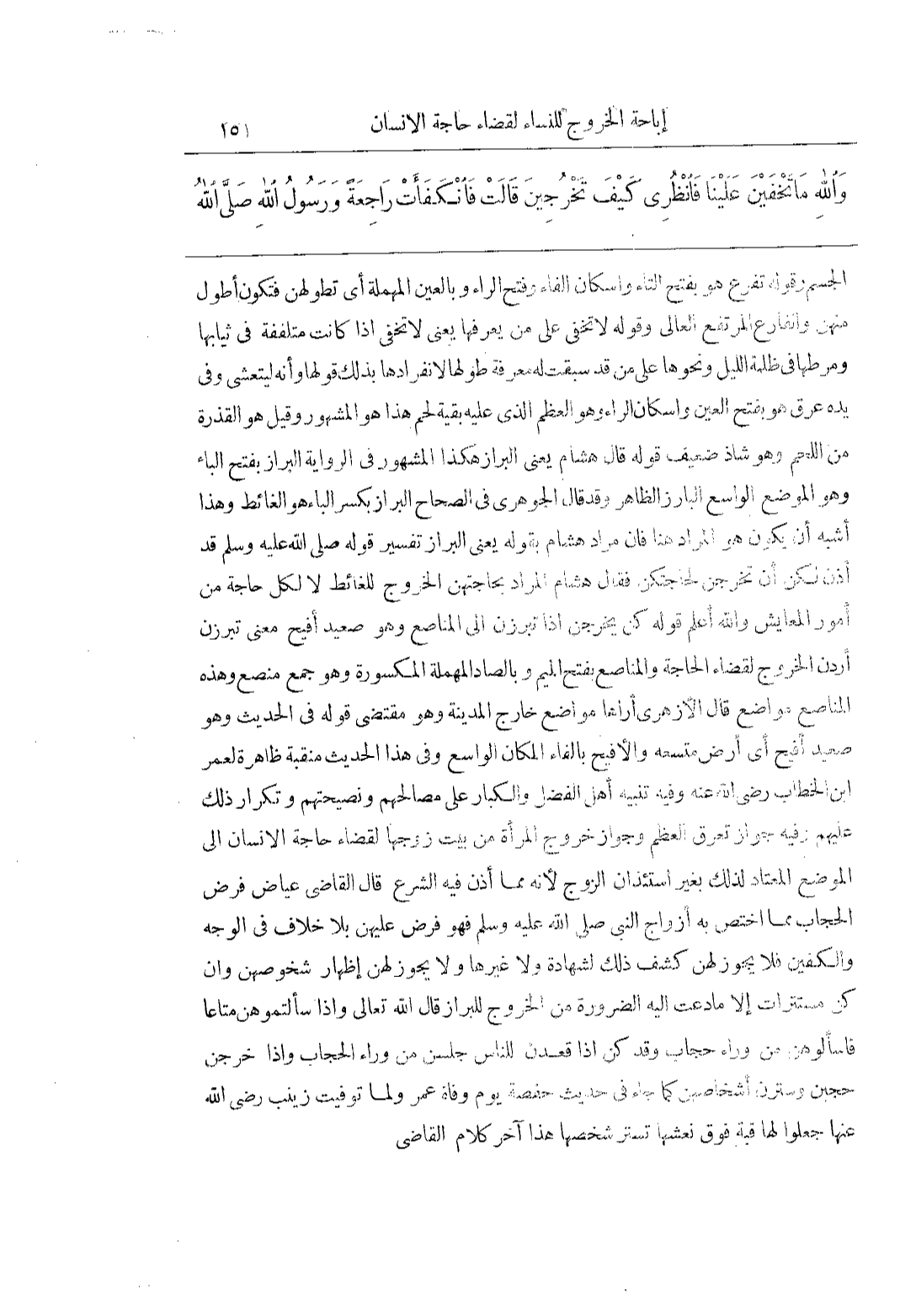 الْجِسْمِ وَقَوْلُهُ تَفْرَعُ هُوَ بِفَتْحِ التَّاءِ وَإِسْكَانِ الْفَاءِ وَفَتْحِ الرَّاءِ وَبِالْعَيْنِ الْمُهْمَلَةِ أَيْ تَطْوُلُهُنَّ فَتَكُونُ أَطْوَلَ مِنْهُنَّ وَالْفَارِعُ الْمُرْتَفِعُ الْعَالِي وَقَوْلُهُ لاتخفى على من يعرفها يعنى لاتخفى إِذَا كَانَتْ مُتَلَفِّفَةً فِي ثِيَابِهَا وَمِرْطِهَا فِي ظُلْمَةِ اللَّيْلِ وَنَحْوِهَا عَلَى مَنْ قَدْ سَبَقَتْ لَهُ مَعْرِفَةُ طُولِهَا لِانْفِرَادِهَا بِذَلِكَ قَوْلُهَا وَإِنَّهُ لَيَتَعَشَّى وَفِي يَدِهِ عَرْقٌ هُوَ بِفَتْحِ الْعَيْنِ وَإِسْكَانِ الرَّاءِ وَهُوَ الْعَظْمُ الَّذِي عَلَيْهِ بَقِيَّةُ لَحْمٍ هَذَا هُوَ الْمَشْهُورُ وَقِيلَ هُوَ الْقَذِرَةُ مِنَ اللَّحْمِ وَهُوَ شَاذٌّ ضَعِيفٌ قَوْلُهُ قَالَ هِشَامٌ يَعْنِي الْبَرَازَ هَكَذَا الْمَشْهُورُ فِي الرِّوَايَةِ الْبَرَازُ بِفَتْحِ الْبَاءِ وَهُوَ الْمَوْضِعُ الْوَاسِعُ الْبَارِزُ الظَّاهِرُ وَقَدْ قَالَ الْجَوْهَرِيُّ فِي الصِّحَاحِ الْبِرَازُ بِكَسْرِ الْبَاءِ هُوَ الْغَائِطُ وَهَذَا أَشْبَهُ أَنْ يَكُونَ هُوَ الْمُرَادُ هُنَا فَإِنَّ مُرَادَ هِشَامٍ بِقَوْلِهِ يَعْنِي الْبَرَازَ تَفْسِيرُ قَوْلِهِ صَلَّى اللَّهُ عَلَيْهِ وَسَلَّمَ قَدْ أُذِنَ لَكُنَّ أَنْ تَخْرُجْنَ لِحَاجَتِكُنَّ فَقَالَ هِشَامٌ الْمُرَادُ بِحَاجَتِهِنَّ الْخُرُوجُ لِلْغَائِطِ لالكل حَاجَةٍ مِنْ أُمُورِ الْمَعَايِشِ وَاللَّهُ أَعْلَمُ قَوْلُهُ كُنَّ يَخْرُجْنَ إِذَا تَبَرَّزْنَ إِلَى الْمَنَاصِعِ وَهُوَ صَعِيدٌ أَفْيَحُ مَعْنَى تَبَرَّزْنَ أَرَدْنَ الْخُرُوجَ لِقَضَاءِ الْحَاجَةِ وَالْمَنَاصِعُ بِفَتْحِ الْمِيمِ وَبِالصَّادِ الْمُهْمَلَةِ الْمَكْسُورَةِ وَهُوَ جَمْعُ مَنْصَعٍ وَهَذِهِ الْمَنَاصِعُ مَوَاضِعُ قَالَ الْأَزْهَرِيُّ أَرَاهَا مَوَاضِعَ خَارِجَ الْمَدِينَةِ وَهُوَ مُقْتَضَى قَوْلِهِ فِي الْحَدِيثِ وَهُوَ صَعِيدٌ أَفْيَحُ أَيْ أَرْضٌ مُتَّسَعَةٌ وَالْأَفْيَحُ بِالْفَاءِ الْمَكَانُ الْوَاسِعُ وَفِي هَذَا الْحَدِيثِ مَنْقَبَةٌ ظَاهِرَةٌ لِعُمَرَ بْنِ الْخَطَّابِ رَضِيَ اللَّهُ عَنْهُ وَفِيهِ تَنْبِيهُ أَهْلِ الْفَضْلِ وَالْكِبَارِ عَلَى مَصَالِحِهِمْ وَنَصِيحَتِهِمْ وَتَكْرَارُ ذَلِكَ عَلَيْهِمْ وَفِيهِ جَوَازُ تَعَرُّقِ الْعَظْمِ وَجَوَازُ خُرُوجِ الْمَرْأَةِ مِنْ بَيْتِ زَوْجِهَا لِقَضَاءِ حَاجَةِ الْإِنْسَانِ إِلَى الْمَوْضِعِ الْمُعْتَادِ لِذَلِكَ بِغَيْرِ اسْتِئْذَانِ الزَّوْجِ لِأَنَّهُ مِمَّا أَذِنَ فِيهِ الشَّرْعُ قَالَ الْقَاضِي عِيَاضٌ فَرْضُ الْحِجَابِ مِمَّا اخْتُصَّ بِهِ أَزْوَاجُ النَّبِيِّ صَلَّى اللَّهُ عَلَيْهِ وَسَلَّمَ فَهُوَ فَرْضٌ عَلَيْهِنَّ بلا خلاف فى الوجه والكفين فلايجوز لَهُنَّ كَشْفُ ذَلِكَ لِشَهَادَةٍ وَلَا غَيْرِهَا وَلَا يَجُوزُ لَهُنَّ إِظْهَارُ شُخُوصِهِنَّ وَإِنْ كُنَّ مُسْتَتِرَاتٍ إلاما دَعَتْ إِلَيْهِ الضَّرُورَةُ مِنَ الْخُرُوجِ لِلْبَرَازِ قَالَ اللَّهُ تَعَالَى وَإِذَا سَأَلْتُمُوهُنَّ مَتَاعًا فَاسْأَلُوهُنَّ مِنْ وراء حجاب وَقَدْ كُنَّ إِذَا قَعَدْنَ لِلنَّاسِ جَلَسْنَ مِنْ وَرَاءِ الْحِجَابِ وَإِذَا خَرَجْنَ حُجِبْنَ وَسَتَرْنَ أَشْخَاصَهُنَّ كَمَا جَاءَ فِي حَدِيثِ حَفْصَةَ يَوْمَ وَفَاةِ عُمَرَ وَلَمَّا تُوُفِّيَتْ زَيْنَبُ رَضِيَ اللَّهُ عَنْهَا جَعَلُوا لَهَا قُبَّةً فَوْقَ نَعْشِهَا تَسْتُرُ شَخْصَهَا هَذَا آخِرُ كَلَامِ الْقَاضِي