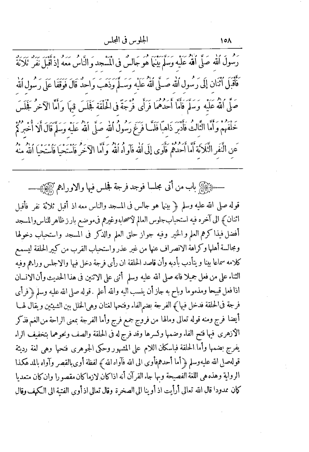 [2176] بَيْنَمَا هُوَ جَالِسٌ فِي الْمَسْجِدِ وَالنَّاسُ مَعَهُ إِذْ أَقْبَلَ ثَلَاثَةُ نَفَرٍ فَأَقْبَلَ اثْنَانِ) إِلَى آخِرِهِ فِيهِ اسْتِحْبَابُ جُلُوسِ الْعَالِمِ لِأَصْحَابِهِ وَغَيْرِهِمْ فِي مَوْضِعٍ بارز ظاهر للناس والمسجد أفضل فيذا كرهم الْعِلْمَ وَالْخَيْرَ وَفِيهِ جَوَازُ حِلَقِ الْعِلْمِ وَالذِّكْرِ فِي الْمَسْجِدِ وَاسْتِحْبَابُ دُخُولِهَا وَمُجَالَسَةِ أَهْلِهَا وَكَرَاهَةُ الِانْصِرَافِ عَنْهَا مِنْ غَيْرِ عُذْرٍ وَاسْتِحْبَابُ الْقُرْبِ مِنْ كَبِيرِ الْحَلْقَةِ لِيَسْمَعَ كَلَامَهُ سَمَاعًا بَيِّنًا وَيَتَأَدَّبَ بِأَدَبِهِ وَأَنَّ قَاصِدَ الْحَلْقَةِ إِنْ رَأَى فرجة دخل فيها والاجلس وراءهم وفيه الثناء على من فعل جميلافانه صَلَّى اللَّهُ عَلَيْهِ وَسَلَّمَ أَثْنَى عَلَى الِاثْنَيْنِ فِي هَذَا الْحَدِيثِ وَأَنَّ الْإِنْسَانَ إِذَا فَعَلَ قَبِيحًا وَمَذْمُومًا وَبَاحَ بِهِ جَازَ أَنْ يُنْسَبَ إِلَيْهِ وَاللَّهُ أَعْلَمُ قَوْلُهُ صَلَّى اللَّهُ عَلَيْهِ وَسَلَّمَ (فَرَأَى فُرْجَةً فِي الْحَلْقَةِ فَدَخَلَ فِيهَا) الْفُرْجَةُ بِضَمِّ الْفَاءِ وَفَتْحِهَا لُغَتَانِ وَهِيَ الْخَلَلُ بَيْنَ الشَّيْئَيْنِ وَيُقَالُ لَهَا أَيْضًا فَرْجٌ وَمِنْهُ قوله تعالى وما لها من فروج جَمْعُ فَرْجٍ وَأَمَّا الْفُرْجَةُ بِمَعْنَى الرَّاحَةِ مِنَ الْغَمِّ فَذَكَرَ الْأَزْهَرِيُّ فِيهَا فَتْحَ الْفَاءِ وَضَمَّهَا وَكَسْرَهَا وَقَدْ فَرَجَ لَهُ فِي الْحَلْقَةِ وَالصَّفِّ وَنَحْوِهِمَا بِتَخْفِيفِ الرَّاءِ يَفْرُجُ بِضَمِّهَا وَأَمَّا الْحَلْقَةُ فَبِإِسْكَانِ اللَّامِ عَلَى الْمَشْهُورِ وَحَكَى الْجَوْهَرِيُّ فَتْحَهَا وهىلغة رَدِيئَةٌ قَوْلُهُ صَلَّى اللَّهُ عَلَيْهِ وَسَلَّمَ (أَمَّا أَحَدُهُمْ فَأَوَى إِلَى اللَّهِ فَآوَاهُ اللَّهُ) لَفْظَةُ أوى بالقصر وآواه بِالْمَدِّ هَكَذَا الرِّوَايَةُ وَهَذِهِ هِيَ اللُّغَةُ الْفَصِيحَةُ وَبِهَا جَاءَ الْقُرْآنُ أَنَّهُ إِذَا كَانَ لَازِمًا كَانَ مَقْصُورًا وَإِنْ كَانَ مُتَعَدِّيًا كَانَ مَمْدُودًا قَالَ اللَّهُ تَعَالَى أَرَأَيْتَ إِذْ أَوَيْنَا إِلَى الصخرة وَقَالَ تَعَالَى إِذْ أَوَى الْفِتْيَةُ إِلَى الْكَهْفِ وقال