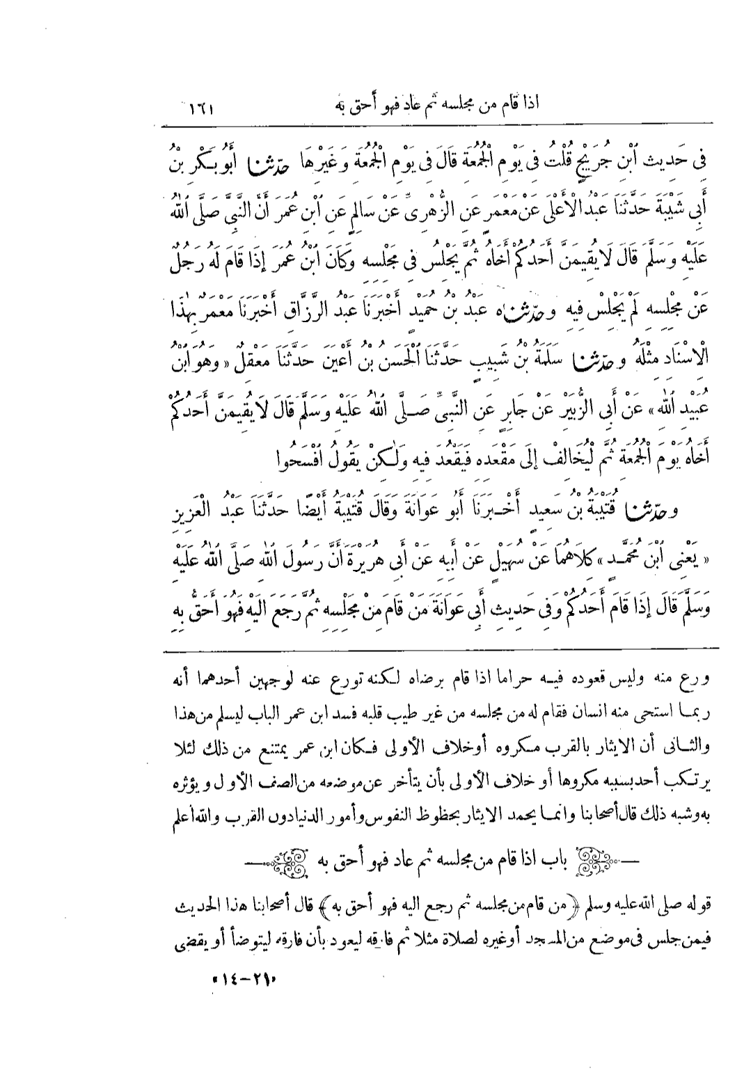 [2179] (مَنْ قَامَ مِنْ مَجْلِسِهِ ثُمَّ رَجَعَ إِلَيْهِ فَهُوَ أَحَقُّ بِهِ) قَالَ أَصْحَابُنَا هَذَا الْحَدِيثُ فِيمَنْ جَلَسَ فِي مَوْضِعٍ مِنَ الْمَسْجِدِ أَوْ غَيْرِهِ لِصَلَاةٍ مثلاثم فَارَقَهُ لِيَعُودَ بِأَنْ فَارَقَهُ لِيَتَوَضَّأَ أَوْ يَقْضِيَ