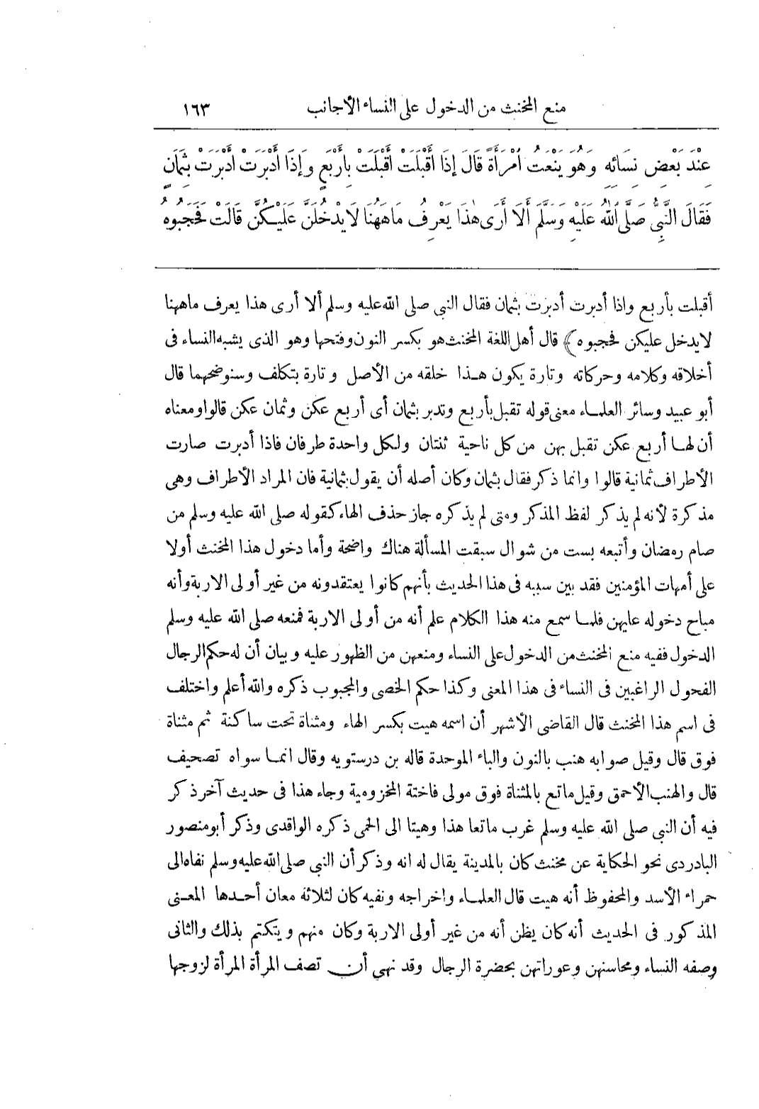 أقبلت بأربع وإذا أدبرت أدبرت بثمان فقال النَّبِيُّ صَلَّى اللَّهُ عَلَيْهِ وَسَلَّمَ أَلَا أَرَى هذا يعرف ماههنا لايدخل عَلَيْكُنَّ فَحَجَبُوهُ) قَالَ أَهْلُ اللُّغَةِ الْمُخَنَّثُ هُوَ بِكَسْرِ النُّونِ وَفَتْحِهَا وَهُوَ الَّذِي يُشْبِهُ النِّسَاءَ فِي أَخْلَاقِهِ وَكَلَامِهِ وَحَرَكَاتِهِ وَتَارَةً يَكُونُ هَذَا خُلُقَهُ مِنَ الْأَصْلِ وَتَارَةً بِتَكَلُّفٍ وَسَنُوضِحُهُمَا قَالَ أَبُو عُبَيْدٍ وَسَائِرُ الْعُلَمَاءِ مَعْنَى قَوْلِهِ تُقْبِلُ بِأَرْبَعِ وَتُدْبِرُ بِثَمَانٍ أَيْ أَرْبَعِ عُكَنٍ وَثَمَانِ عُكَنٍ قَالُوا وَمَعْنَاهُ أَنَّ لَهَا أَرْبَعَ عُكَنٍ تقبل بهن من كل ناحية اثنتان وَلِكُلِّ وَاحِدَةٍ طَرَفَانِ فَإِذَا أَدْبَرَتْ صَارَتِ الْأَطْرَافُ ثَمَانِيَةً قَالُوا وَإِنَّمَا ذَكَرَ فَقَالَ بِثَمَانٍ وَكَانَ أَصْلُهُ أَنْ يَقُولَ بِثَمَانِيَةٍ فَإِنَّ الْمُرَادَ الْأَطْرَافُ وَهِيَ مُذَكَّرَةٌ لِأَنَّهُ لَمْ يَذْكُرْ لَفْظَ الْمُذَكَّرِ وَمَتَى لَمْ يَذْكُرْهُ جَازَ حَذْفُ الْهَاءِ كَقَوْلِهِ صَلَّى اللَّهُ عَلَيْهِ وَسَلَّمَ مَنْ صَامَ رَمَضَانَ وَأَتْبَعَهُ بِسِتٍّ مِنْ شَوَّالٍ سَبَقَتِ الْمَسْأَلَةُ هُنَاكَ وَاضِحَةً وَأَمَّا دُخُولُ هَذَا الْمُخَنَّثِ أَوَّلًا عَلَى أُمَّهَاتِ الْمُؤْمِنِينَ فَقَدْ بَيَّنَ سَبَبَهُ فِي هَذَا الْحَدِيثُ بِأَنَّهُمْ كَانُوا يَعْتَقِدُونَهُ مِنْ غَيْرِ أُولِي الْإِرْبَةِ وَأَنَّهُ مُبَاحٌ دُخُولُهُ عَلَيْهِنَّ فَلَمَّا سَمِعَ مِنْهُ هَذَا الْكَلَامَ عَلِمَ أَنَّهُ مِنْ أُولِي الْإِرْبَةِ فَمَنَعَهُ صَلَّى اللَّهُ عَلَيْهِ وَسَلَّمَ الدُّخُولَ فَفِيهِ مَنْعُ الْمُخَنَّثِ مِنَ الدُّخُولِ عَلَى النِّسَاءِ وَمَنْعُهُنَّ مِنَ الظُّهُورِ عَلَيْهِ وَبَيَانُ أَنَّ لَهُ حُكْمَ الرِّجَالِ الْفُحُولِ الرَّاغِبِينَ فِي النِّسَاءِ فِي هَذَا الْمَعْنَى وَكَذَا حُكْمُ الْخَصِيِّ وَالْمَجْبُوبِ ذَكَرُهُ وَاللَّهُ أَعْلَمُ وَاخْتُلِفَ فِي اسْمِ هَذَا الْمُخَنَّثِ قَالَ الْقَاضِي الْأَشْهَرُ أَنَّ اسْمَهُ هِيْتٌ بِكَسْرِ الْهَاءِ وَمُثَنَّاةٍ تَحْتُ سَاكِنَةٍ ثُمَّ مُثَنَّاةٍ فَوْقُ قَالَ وَقِيلَ صَوَابُهُ هَنْبٌ بِالنُّونِ وَالْبَاءِ الْمُوَحَّدَةِ قاله بن دُرُسْتَوَيْهِ وَقَالَ إِنَّمَا سِوَاهُ تَصْحِيفٌ قَالَ وَالْهَنَبُ الْأَحْمَقُ وَقِيلَ مَاتِعٌ بِالْمُثَنَّاةِ فَوْقُ مَوْلَى فَاخِتَةَ الْمَخْزُومِيَّةِ وَجَاءَ هَذَا فِي حَدِيثٍ آخَرَ ذُكِرَ فِيهِ أَنَّ النَّبِيَّ صَلَّى اللَّهُ عَلَيْهِ وَسَلَّمَ غَرَّبَ مَاتِعًا هَذَا وَهِيتًا إِلَى الْحِمَى ذَكَرَهُ الواقدى وذكر أبومنصور الْبَادَرْدِيُّ نَحْوَ الْحِكَايَةِ عَنْ مُخَنَّثٍ كَانَ بِالْمَدِينَةِ يُقَالُ لَهُ أَنَهُ وَذَكَرَ أَنَّ النَّبِيَّ صَلَّى اللَّهُ عَلَيْهِ وَسَلَّمَ نَفَاهُ إِلَى حَمْرَاءِ الْأَسَدِ والمحفوظأنه هِيْتٌ قَالَ الْعُلَمَاءُ وَإِخْرَاجُهُ وَنَفْيُهُ كَانَ لِثَلَاثَةِ مَعَانٍ أَحَدُهَا الْمَعْنَى الْمَذْكُورُ فِي الْحَدِيثِ أَنَّهُ كَانَ يَظُنُّ أَنَّهُ مِنْ غَيْرِ أُولِي الْإِرْبَةِ وَكَانَ مِنْهُمْ وَيَتَكَتَّمُ بِذَلِكَ وَالثَّانِي وَصْفُهُ النِّسَاءَ وَمَحَاسِنَهُنَّ وَعَوْرَاتَهُنَّ بِحَضْرَةِ الرِّجَالِ وَقَدْ نُهِيَ أَنْ تصف المرأة المرأة لزوجها