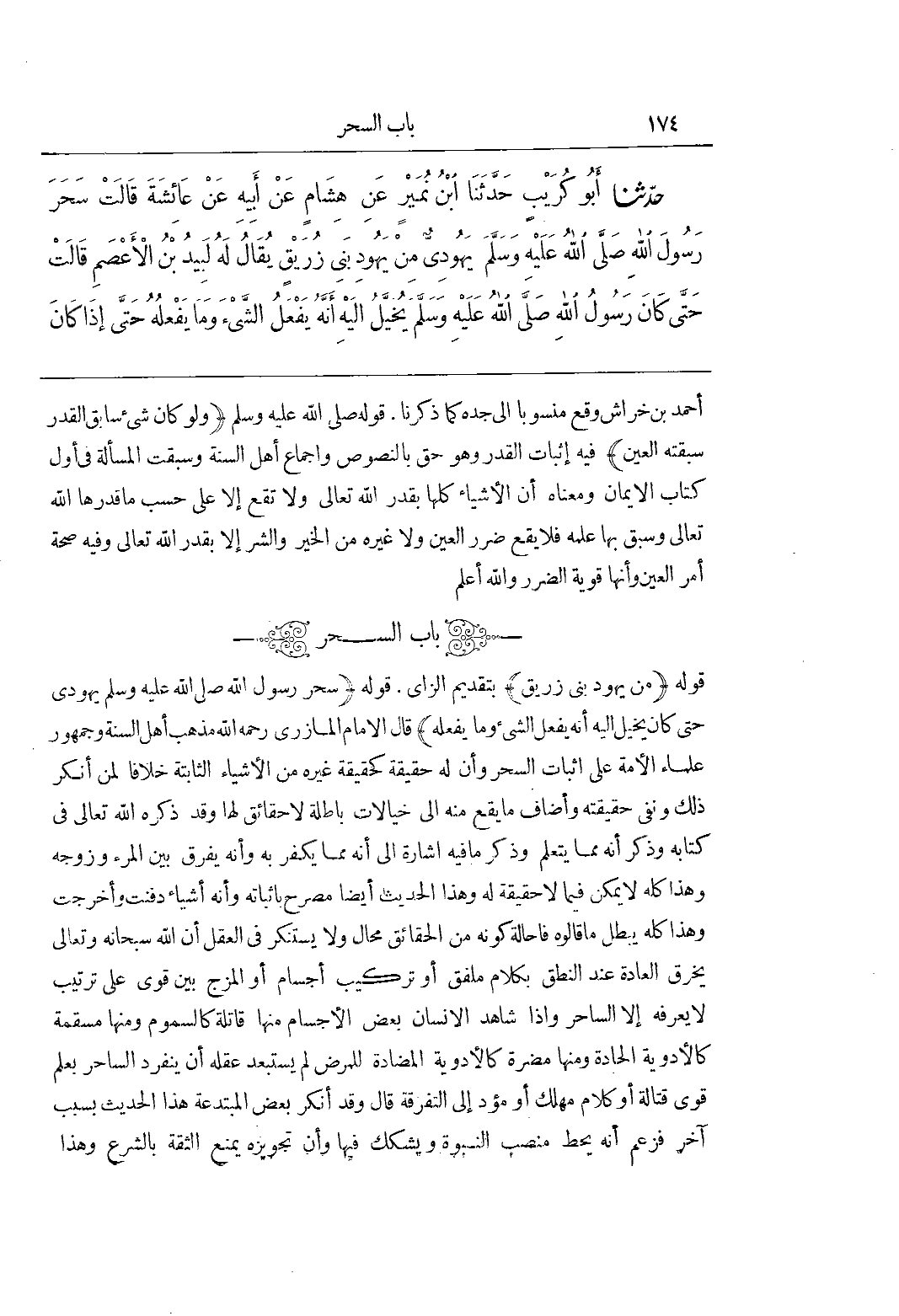 [2189] (مِنْ يَهُودِ بَنِي زُرَيْقٍ) بِتَقْدِيمِ الزَّايِ قَوْلُهُ (سَحَرَ رَسُولَ اللَّهِ صَلَّى اللَّهُ عَلَيْهِ وَسَلَّمَ يَهُودِيٌّ حَتَّى كَانَ يُخَيَّلُ إِلَيْهِ أَنَّهُ يَفْعَلُ الشيء ومايفعله) قَالَ الْإِمَامُ الْمَازِرِيُّ رَحِمَهُ اللَّهُ مَذْهَبُ أَهْلِ السُّنَّةِ وَجُمْهُورِ عُلَمَاءِ الْأُمَّةِ عَلَى إِثْبَاتِ السِّحْرِ وأن له حقيقة كحقيقة غيره من الأشياءالثابتة خِلَافًا لِمَنْ أَنْكَرَ ذَلِكَ وَنَفَى حَقِيقَتَهُ وَأَضَافَ ما يقع منه إلى خيالات باطلة لاحقائق لَهَا وَقَدْ ذَكَرَهُ اللَّهُ تَعَالَى فِي كِتَابِهِ وذكر أنه مما يتعلم وذكر مافيه إِشَارَةً إِلَى أَنَّهُ مِمَّا يُكَفَّرُ بِهِ وَأَنَّهُ يُفَرِّقُ بَيْنُ الْمَرْءِ وَزَوْجِهِ وَهَذَا كُلُّهُ لَا يمكن فيما لاحقيقة لَهُ وَهَذَا الْحَدِيثُ أَيْضًا مُصَرِّحٌ بِإِثْبَاتِهِ وَأَنَّهُ أَشْيَاءُ دُفِنَتْ وَأُخْرِجَتْ وَهَذَا كُلُّهُ يُبْطِلُ مَا قَالُوهُ فَإِحَالَةُ كَوْنِهِ مِنَ الْحَقَائِقِ مُحَالٌ وَلَا يُسْتَنْكَرُ فِي الْعَقْلِ أَنَّ اللَّهَ سُبْحَانَهُ وَتَعَالَى يَخْرِقُ الْعَادَةَ عِنْدَ النُّطْقِ بِكَلَامٍ مُلَفَّقٍ أَوْ تَرْكِيبِ أَجْسَامٍ أَوِ الْمَزْجِ بَيْنَ قُوًى عَلَى تَرْتِيبٍ لَا يَعْرِفُهُ إِلَّا السَّاحِرُ وَإِذَا شَاهَدَ الْإِنْسَانُ بَعْضَ الْأَجْسَامِ مِنْهَا قَاتِلَةٌ كَالسَّمُومِ وَمِنْهَا مُسْقِمَةٌ كَالْأَدْوِيَةِ الْحَادَّةِ وَمِنْهَا مُضِرَّةٌ كَالْأَدْوِيَةِ الْمُضَادَّةِ للمرض لم يستبعد عقله أن ينفر د السَّاحِرُ بِعِلْمِ قُوًى قَتَّالَةٍ أَوْ كَلَامٍ مُهْلِكٍ أَوْ مُؤَدٍّ إِلَى التَّفْرِقَةِ قَالَ وَقَدْ أَنْكَرَ بَعْضُ الْمُبْتَدِعَةِ هَذَا الْحَدِيثَ بِسَبَبٍ آخَرَ فَزَعَمَ أَنَّهُ يَحُطُّ مَنْصِبَ النُّبُوَّةِ وَيُشَكِّكُ فِيهَا وَأَنَّ تجويزه يمنع الثقة بالشرع وهذا