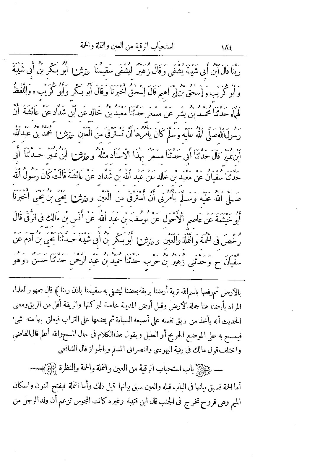 بِالْأَرْضِ ثُمَّ رَفَعَهَا بِاسْمِ اللَّهِ تُرْبَةُ أَرْضِنَا بِرِيقَةِ بَعْضِنَا لِيُشْفَى بِهِ سَقِيمُنَا بِإِذْنِ رَبِّنَا) قَالَ جُمْهُورُ الْعُلَمَاءِ الْمُرَادُ بِأَرْضِنَا هُنَا جُمْلَةُ الْأَرْضِ وَقِيلَ أَرْضُ الْمَدِينَةِ خَاصَّةً لِبَرَكَتِهَا وَالرِّيقَةُ أَقَلُّ مِنَ الرِّيقِ وَمَعْنَى الْحَدِيثِ أَنَّهُ يَأْخُذُ مِنْ رِيقِ نَفْسِهِ عَلَى أُصْبُعِهِ السَّبَّابَةِ ثُمَّ يَضَعُهَا عَلَى التُّرَابِ فَيَعْلَقُ بِهَا مِنْهُ شَيْءٌ فَيَمْسَحُ بِهِ عَلَى الْمَوْضِعِ الْجَرِيحِ أَوِ الْعَلِيلِ وَيَقُولُ هَذَا الْكَلَامَ فِي حَالِ الْمَسْحِ وَاللَّهُ أَعْلَمُ قَالَ الْقَاضِي وَاخْتَلَفَ قَوْلُ مَالِكٍ فِي رُقْيَةِ الْيَهُودِيِّ وَالنَّصْرَانِيِّ الْمُسْلِمَ وَبِالْجَوَازِ قَالَ الشَّافِعِيُّ