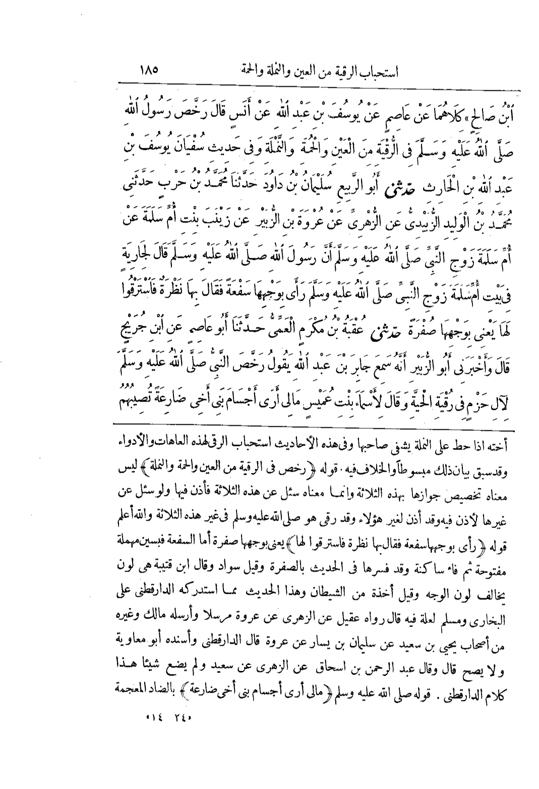 [2197] (رَأَى بِوَجْهِهَا سَفْعَةً فَقَالَ بِهَا نَظْرَةٌ فَاسْتَرَقُوا لَهَا) يَعْنِي بِوَجْهِهَا صُفْرَةٌ أَمَّا السَّفْعَةُ فَبِسِينٍ مُهْمَلَةٍ مَفْتُوحَةٍ ثُمَّ فَاءٍ سَاكِنَةٍ وَقَدْ فَسَّرَهَا فِي الْحَدِيثِ بِالصُّفْرَةِ وَقِيلَ سَوَادٌ وقال بن قُتَيْبَةَ هِيَ لَوْنٌ يُخَالِفُ لَوْنَ الْوَجْهِ وَقِيلَ أَخْذَةٌ مِنَ الشَّيْطَانِ وَهَذَا الْحَدِيثُ مِمَّا اسْتَدْرَكَهُ الدَّارَقُطْنِيُّ عَلَى الْبُخَارِيِّ وَمُسْلِمٍ لِعِلَّةٍ فِيهِ قَالَ رَوَاهُ عُقَيْلٌ عَنِ الزُّهْرِيِّ عَنْ عُرْوَةَ مُرْسَلًا وَأَرْسَلَهُ مَالِكٌ وَغَيْرُهُ مِنْ أَصْحَابِ يَحْيَى بْنِ سَعِيدٍ عَنْ سُلَيْمَانَ بْنِ يَسَارٍ عَنْ عُرْوَةَ قال الدارقطني وأسنده أبو معاوية ولايصح قَالَ وَقَالَ عَبْدُ الرَّحْمَنِ بْنُ إِسْحَاقَ عَنِ الزُّهْرِيِّ عَنْ سَعِيدٍ وَلَمْ يَضَعْ شَيْئًا هَذَا كَلَامُ الدَّارَقُطْنِيِّ قَوْلُهُ صَلَّى اللَّهُ عَلَيْهِ وَسَلَّمَ