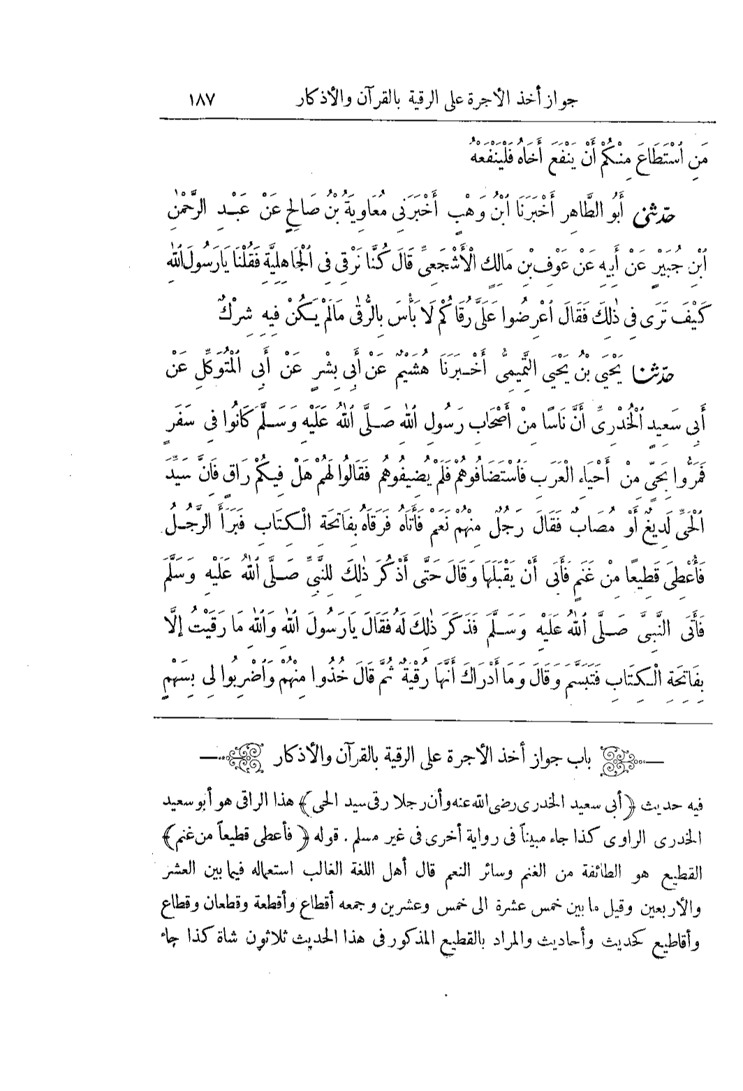 [2201] (أَبِي سَعِيدٍ الْخُدْرِيِّ رَضِيَ اللَّهُ عَنْهُ وَأَنَّ رَجُلًا رَقَى سَيِّدَ الْحَيِّ) هَذَا الراقى هو أَبُو سَعِيدٍ الْخُدْرِيُّ الرَّاوِي كَذَا جَاءَ مُبَيَّنًا فِي رِوَايَةٍ أُخْرَى فِي غَيْرِ مُسْلِمٍ قَوْلُهُ (فَأُعْطِيَ قَطِيعًا مِنْ غَنَمٍ) الْقَطِيعُ هُوَ الطَّائِفَةُ مِنَ الْغَنَمِ وَسَائِرِ النَّعَمِ قَالَ أَهْلُ اللُّغَةِ الْغَالِبُ اسْتِعْمَالُهُ فِيمَا بَيْنَ الْعَشْرِ وَالْأَرْبَعِينَ وَقِيلَ مَا بَيْنَ خَمْسَ عَشْرَةَ إِلَى خَمْسٍ وَعِشْرِينَ وَجَمْعُهُ أَقْطَاعٌ وَأَقْطِعَةٌ وَقُطْعَانٌ وَقِطَاعٌ وَأَقَاطَيعُ كَحَدِيثٍ وَأَحَادِيثَ وَالْمُرَادُ بِالْقَطِيعِ الْمَذْكُورِ فِي هَذَا الْحَدِيثِ ثَلَاثُونَ شَاةً كَذَا جَاءَ