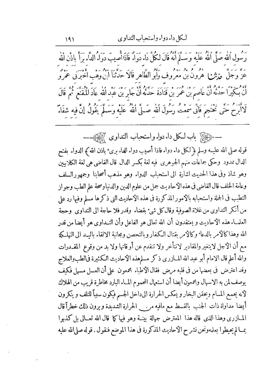 [2204] (لِكُلِّ دَاءٍ دَوَاءٌ فاذا أصيب دواء الداء بريء بِإِذْنِ اللَّهِ) الدَّوَاءُ بِفَتْحِ الدَّالِ مَمْدُودٌ وَحَكَى جَمَاعَاتٌ مِنْهُمُ الْجَوْهَرِيُّ فِيهِ لُغَةً بِكَسْرِ الدَّالِ قال القاضي هي لغة الكلابيين وهو شاذوفى هَذَا الْحَدِيثِ إِشَارَةٌ إِلَى اسْتِحْبَابِ الدَّوَاءِ وَهُوَ مَذْهَبُ أَصْحَابِنَا وَجُمْهُورِ السَّلَفِ وَعَامَّةِ الْخَلْفِ قَالَ الْقَاضِي فِي هَذِهِ الْأَحَادِيثِ جُمَلٌ مِنْ عُلُومِ الدين والدنيا وصحة علم الطب وجواز التطيب فِي الْجُمْلَةِ وَاسْتِحْبَابُهُ بِالْأُمُورِ الْمَذْكُورَةِ فِي هَذِهِ الْأَحَادِيثِ الَّتِي ذَكَرَهَا مُسْلِمٌ وَفِيهَا رَدٌّ عَلَى مَنْ أَنْكَرَ التَّدَاوِيَ مِنْ غُلَاةِ الصُّوفِيَّةِ وَقَالَ كل شيء بقضاء وقدر فلاحاجة إِلَى التَّدَاوِي وَحُجَّةُ الْعُلَمَاءِ هَذِهِ الْأَحَادِيثُ وَيَعْتَقِدُونَ أَنَّ اللَّهَ تَعَالَى هُوَ الْفَاعِلُ وَأَنَّ التَّدَاوِيَ هُوَ أَيْضًا مِنْ قَدَرِ اللَّهِ وَهَذَا كَالْأَمْرِ بالدعاء وكالأمر بقتال الكفار وبالتحصن ومجانية الْإِلْقَاءِ بِالْيَدِ إِلَى التَّهْلُكَةِ مَعَ أَنَّ الْأَجَلَ لايتغير والمقادير لاتتأخر ولا تتقدم عن أوقاتها ولابد مِنْ وُقُوعِ الْمُقَدَّرَاتِ وَاللَّهُ أَعْلَمُ قَالَ الْإِمَامُ أَبُو عَبْدِ اللَّهِ الْمَازِرِيُّ ذَكَرَ مُسْلِمٌ هَذِهِ الْأَحَادِيثَ الْكَثِيرَةَ فِي الطِّبِّ وَالْعِلَاجِ وَقَدِ اعْتَرَضَ فِي بَعْضِهَا مَنْ فِي قَلْبِهِ مَرَضٌ فَقَالَ الْأَطِبَّاءُ مُجْمِعُونَ عَلَى أَنَّ الْعَسَلَ مُسَهِّلٌ فَكَيْفَ يُوصَفُ لِمَنْ بِهِ الْإِسْهَالُ وَمُجْمِعُونَ أَيْضًا أَنَّ اسْتِعْمَالَ الْمَحْمُومِ الْمَاءَ الْبَارِدَ مُخَاطَرَةٌ قَرِيبٌ مِنَ الْهَلَاكِ لِأَنَّهُ يُجَمِّعُ الْمَسَامَّ وَيَحْقِنُ الْبُخَارَ وَيَعْكِسُ الْحَرَارَةَ إِلَى دَاخِلِ الْجِسْمِ فَيَكُونُ سَبَبًا لِلتَّلَفِ وينكرو أيضا مداواة ذات الجنب بالقسط مع مافيه مِنَ الْحَرَارَةِ الشَّدِيدَةِ وَيَرَوْنَ ذَلِكَ خَطَرًا قَالَ المازرى وهذا الذى قال هَذَا الْمُعْتَرِضُ جَهَالَةٌ بَيِّنَةٌ وَهُوَ فِيهَا كَمَا قَالَ اللَّهُ تَعَالَى بَلْ كَذَّبُوا بِمَا لَمْ يحيطوا بعلمه وَنَحْنُ نَشْرَحُ الْأَحَادِيثَ الْمَذْكُورَةَ فِي هَذَا الْمَوْضِعِ فَنَقُولُ قَوْلُهُ صَلَّى اللَّهُ عَلَيْهِ