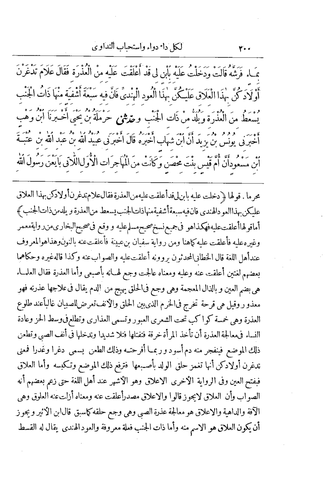 [2214] (دَخَلْتُ عَلَيْهِ بِابْنٍ لِي قَدْ أَعْلَقْتُ عَلَيْهِ مِنَ الْعُذْرَةِ فَقَالَ عَلَامَ تَدْغَرْنَ أَوْلَادَكُنَّ بهذا العلاق عليكن بهذا العلاق عليكن بهذا العود لاهندى فَإِنَّ فِيهِ سَبْعَةُ أَشْفِيَةٍ مِنْهَا ذَاتُ الْجَنْبِ يُسْعَطُ مِنَ الْعُذْرَةِ وَيُلَدُّ مِنْ ذَاتِ الْجَنْبِ) أما قولها أعلقت عليه فكهذا هُوَ فِي جَمِيعِ نُسَخِ صَحِيحِ مُسْلِمٍ عَلَيْهِ وَوَقَعَ فِي صَحِيحِ الْبُخَارِيِّ مِنْ رِوَايَةِ مَعْمَرٍ وَغَيْرِهِ عَلَيْهِ فَأَعْلَقْتُ عَلَيْهِ كَمَا هُنَا وَمَنْ رِوَايَةِ سُفْيَانَ بْنِ عُيَيْنَةَ فَأَعْلَقْتُ عَنْهُ بِالنُّونِ وَهَذَا هُوَ الْمَعْرُوفُ عِنْدَ أَهْلِ اللُّغَةِ قَالَ الْخَطَّابِيُّ الْمُحَدِّثُونَ يَرْوُونَهُ أَعَلَقْتُ عَلَيْهِ وَالصَّوَابُ عَنْهُ وكذا قال غَيْرُهُ وَحَكَاهُمَا بَعْضُهُمْ لُغَتَيْنِ أَعَلَقْتُ عَنْهُ وَعَلَيْهِ وَمَعْنَاهُ عَالَجْتُ وَجَعَ لَهَاتِهِ بِأُصْبُعِي وَأَمَّا الْعُذْرَةُ فَقَالَ الْعُلَمَاءُ هِيَ بِضَمِّ الْعَيْنِ وَبِالذَّالِ الْمُعْجَمَةِ وَهِيَ وَجَعٌ فِي الْحَلْقِ يَهِيجُ مِنَ الدَّمِ يُقَالُ فِي عِلَاجِهَا عَذَرْتُهُ فَهُوَ مَعْذُورٌ وَقِيلَ هي قرحة تخرج في الخر الذى يبن الْحَلْقِ وَالْأَنْفِ تَعْرِضُ لَلصِّبْيَانِ غَالِبًا عِنْدَ طُلُوعِ الْعُذْرَةِ وَهِيَ خَمْسَةُ كَوَاكِبَ تَحْتَ الشِّعْرَى الْعَبُورِ وَتُسَمَّى الْعَذَارَى وَتَطْلُعُ فِي وَسَطِ الْحَزِّ وَعَادَةُ النِّسَاءِ فِي مُعَالَجَةِ الْعُذْرَةِ أَنْ تَأْخُذَ الْمَرْأَةُ خِرْقَةً فَتَفْتِلَهَا فَتْلًا شَدِيدًا وَتُدْخِلَهَا فِي أَنْفِ الصَّبِيِّ وَتَطْعَنَ ذَلِكَ الْمَوْضِعِ فَيَنْفَجِرُ مِنْهُ دَمٌ أَسْوَدُ وَرُبَّمَا أَقْرَحَتْهُ وَذَلِكَ الطَّعْنُ يُسَمَّى دَغْرًا وَغَدْرًا فَمَعْنَى تَدْغَرْنَ أَوْلَادَكُنَّ أَنَّهَا تَغْمِزُ حَلْقَ الْوَلَدِ بِأُصْبُعِهَا فَتَرْفَعُ ذَلِكَ الْمَوْضِعَ وَتَكْبِسُهُ وَأَمَّا الْعَلَاقُ فَبِفَتْحِ الْعَيْنِ وَفِي الرِّوَايَةِ الْأُخْرَى الْإِعْلَاقُ وَهُوَ الْأَشْهَرُ عِنْدَ أَهْلِ اللُّغَةِ حَتَّى زَعَمَ بعضهم أنه الصواب وأن العلاق لايجوز قالوا والعلاق مَصْدَرُ أَعَلَقْتُ عَنْهُ وَمَعْنَاهُ أَزَلْتُ عَنْهُ الْعَلُوقَ وَهِيَ الْآفَةُ وَالدَّاهِيَةُ وَالْإِعْلَاقُ هُوَ مُعَالَجَةُ عُذْرَةِ الصَّبِيِّ وَهِيَ وَجَعُ حَلْقِهِ كَمَا سَبَقَ قَالَ بن الْأَثِيرِ وَيَجُوزُ أَنْ يَكُونَ الْعَلَاقُ هُوَ الِاسْمُ منه وأما ذات الجنبفعلة معروفة والعودالهندى يُقَالُ لَهُ الْقُسْطُ