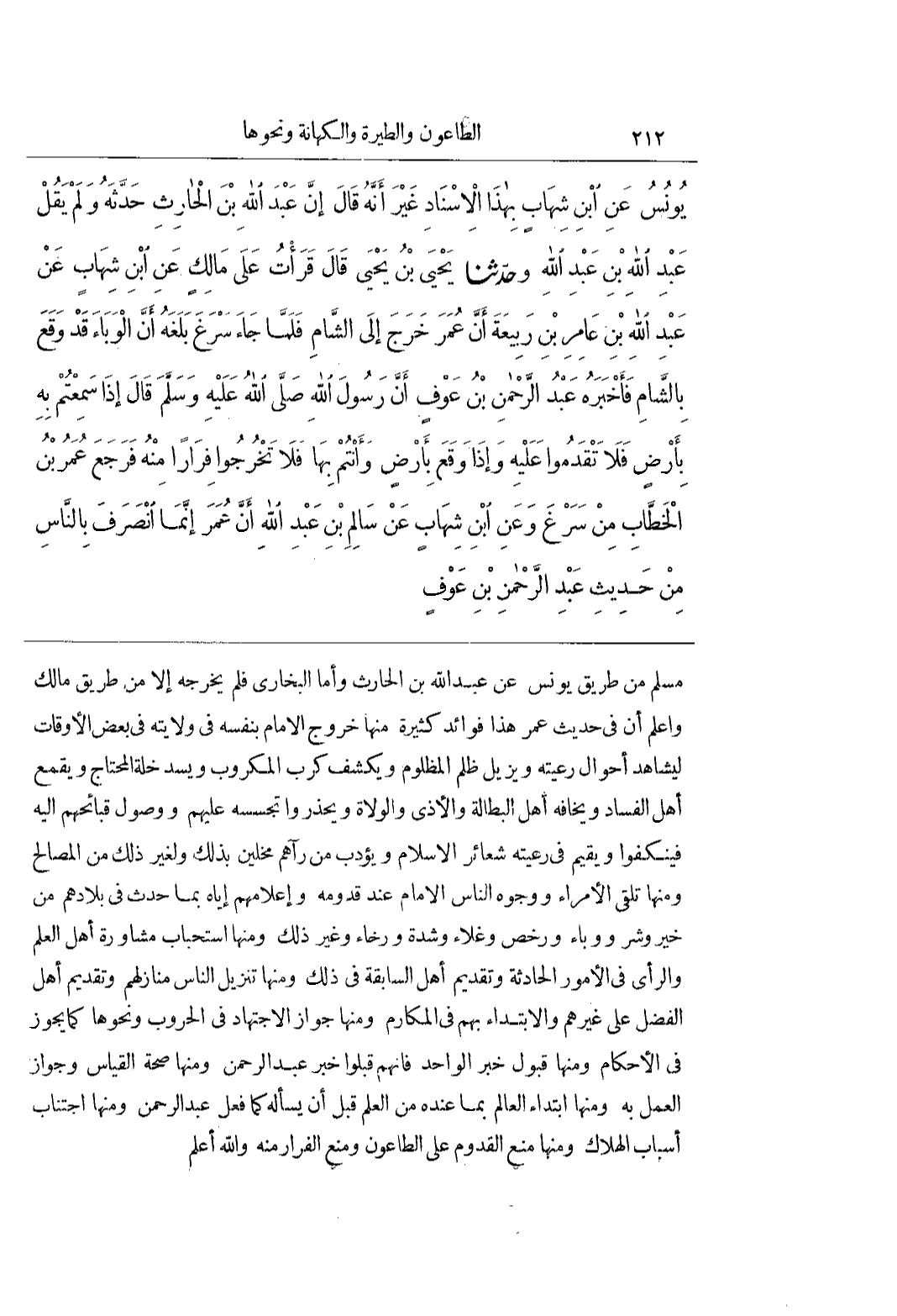 مُسْلِمٌ مِنْ طَرِيقِ يُونُسَ عَنْ عَبْدِ اللَّهِ بن الحارث وأما البخارى فلم يخرجه إلامن طَرِيقِ مَالِكٍ وَاعْلَمْ أَنَّ فِي حَدِيثِ عُمَرَ هَذَا فَوَائِدَ كَثِيرَةً مِنْهَا خُرُوجُ الْإِمَامِ بِنَفْسِهِ فِي وِلَايَتِهِ فِي بَعْضِ الْأَوْقَاتِ لِيُشَاهِدَ أَحْوَالَ رَعِيَّتِهِ وَيُزِيلَ ظُلْمَ الْمَظْلُومِ وَيَكْشِفَ كَرْبَ الْمَكْرُوبِ وَيَسُدَّ خَلَّةَ الْمُحْتَاجِ وَيَقْمَعَ أَهْلَ الْفَسَادِ وَيَخَافَهُ أَهْلُ الْبَطَالَةِ وَالْأَذَى وَالْوُلَاةِ وَيَحْذَرُوا تَجَسُّسَهُ عَلَيْهِمْ وَوُصُولَ قَبَائِحِهِمْ إِلَيْهِ فَيَنْكُفُوا وَيُقِيمَ فِي رَعِيَّتِهِ شَعَائِرَ الْإِسْلَامِ وَيُؤَدِّبَ مَنْ رَآهُمْ مُخِلِّينَ بِذَلِكَ وَلِغَيْرِ ذَلِكَ مِنَ الْمَصَالِحِ وَمِنْهَا تَلَقِّي الْأُمَرَاءِ وَوُجُوهِ النَّاسِ الْإِمَامَ عِنْدَ قُدُومِهِ وَإِعْلَامُهُمْ إِيَّاهُ بِمَا حَدَثَ فِي بِلَادِهِمْ مِنْ خَيْرٍ وَشَرٍّ وَوَبَاءٍ وَرُخْصٍ وَغَلَاءٍ وَشِدَّةٍ وَرَخَاءٍ وَغَيْرِ ذَلِكَ وَمِنْهَا اسْتِحْبَابُ مُشَاوَرَةِ أَهْلِ الْعِلْمِ وَالرَّأْيِ فِي الْأُمُورِ الْحَادِثَةِ وَتَقْدِيمُ أَهْلِ السَّابِقَةِ فِي ذَلِكَ وَمِنْهَا تَنْزِيلُ النَّاسِ مَنَازِلَهُمْ وَتَقْدِيمُ أَهْلِ الْفَضْلِ عَلَى غَيْرِهِمْ وَالِابْتِدَاءُ بِهِمْ فِي الْمَكَارِمِ وَمِنْهَا جَوَازُ الِاجْتِهَادِ فِي الْحُرُوبِ وَنَحْوِهَا كَمَا يَجُوزُ فِي الْأَحْكَامِ وَمِنْهَا قَبُولُ خَبَرِ الْوَاحِدِ فَإِنَّهُمْ قَبِلُوا خَبَرَ عَبْدِ الرَّحْمَنِ وَمِنْهَا صِحَّةُ الْقِيَاسِ وَجَوَازُ الْعَمَلِ بِهِ وَمِنْهَا ابْتِدَاءُ الْعَالِمِ بِمَا عِنْدَهُ مِنَ الْعِلْمِ قَبْلَ أَنْ يَسْأَلَهُ كَمَا فَعَلَ عَبْدُ الرَّحْمَنِ وَمِنْهَا اجْتِنَابُ أَسْبَابِ الْهَلَاكِ وَمِنْهَا مَنْعُ الْقُدُومِ عَلَى الطَّاعُونِ وَمَنْعُ الْفِرَارِ منه والله أعلم