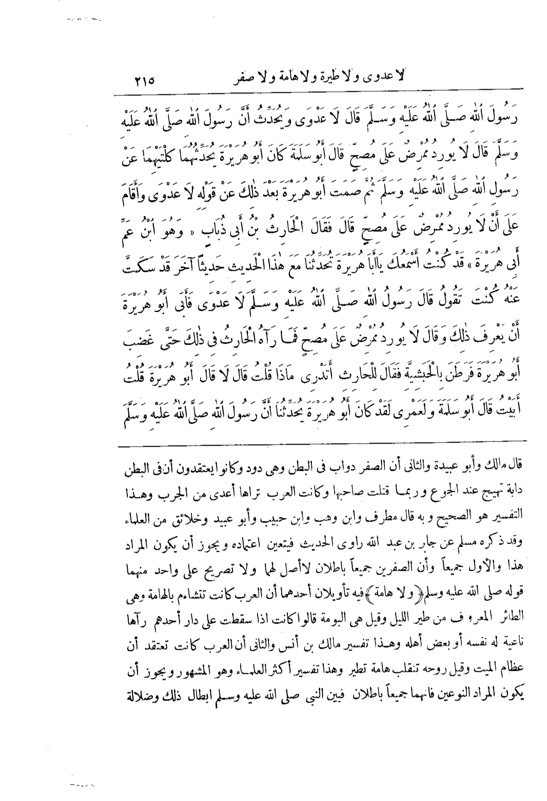 قَالَ مَالِكٌ وَأَبُو عُبَيْدَةَ وَالثَّانِي أَنَّ الصَّفَرَ دَوَابٌّ فِي الْبَطْنِ وَهِيَ دُودٌ وَكَانُوا يَعْتَقِدُونَ أَنَّ فِي الْبَطْنَ دَابَّةً تَهِيجُ عِنْدَ الْجُوعِ وَرُبَّمَا قَتَلَتْ صَاحِبَهَا وَكَانَتِ الْعَرَبُ تَرَاهَا أَعْدَى مِنَ الْجَرَبِ وَهَذَا التَّفْسِيرُ هُوَ الصَّحِيحُ وَبِهِ قال مطرف وبن وهب وبن حَبِيبٍ وَأَبُو عُبَيْدٍ وَخَلَائِقُ مِنَ الْعُلَمَاءِ وَقَدْ ذَكَرَهُ مُسْلِمٌ عَنْ جَابِرِ بْنِ عَبْدِ اللَّهِ رَاوِي الْحَدِيثِ فَيَتَعَيَّنَ اعْتِمَادُهُ وَيَجُوزُ أَنْ يَكُونَ الْمُرَادُ هَذَا وَالْأَوَّلَ جَمِيعًا وَأَنَّ الصَّفَرَيْنِ جَمِيعًا باطلان لاأصل لهما ولاتصريح عَلَى وَاحِدٍ مِنْهُمَا قَوْلُهُ صَلَّى اللَّهُ عَلَيْهِ وسلم (ولاهامة) فيه تأويلان أحدهما أن العرب كانت تتشاءم باطامة وَهِيَ الطَّائِرُ الْمَعْرُوفُ مِنْ طَيْرِ اللَّيْلِ وَقِيلَ هِيَ الْبُومَةُ قَالُوا كَانَتْ إِذَا سَقَطَتْ عَلَى دار أحدهم رآها ناعية له نفسه أوبعض أَهْلِهِ وَهَذَا تَفْسِيرُ مَالِكِ بْنِ أَنَسٍ وَالثَّانِي أَنَّ الْعَرَبَ كَانَتْ تَعْتَقِدُ أَنَّ عِظَامَ الْمَيِّتِ وَقِيلَ رُوحُهُ تَنْقَلِبُ هَامَةً تَطِيرُ وَهَذَا تَفْسِيرُ أَكْثَرِ الْعُلَمَاءِ وَهُوَ الْمَشْهُورُ وَيَجُوزُ أَنْ يَكُونَ الْمُرَادُ النَّوْعَيْنِ فَإِنَّهُمَا جَمِيعًا بَاطِلَانِ فَبَيَّنَ النَّبِيُّ صَلَّى اللَّهُ عَلَيْهِ وَسَلَّمَ إِبْطَالَ ذَلِكَ وَضَلَالَةَ