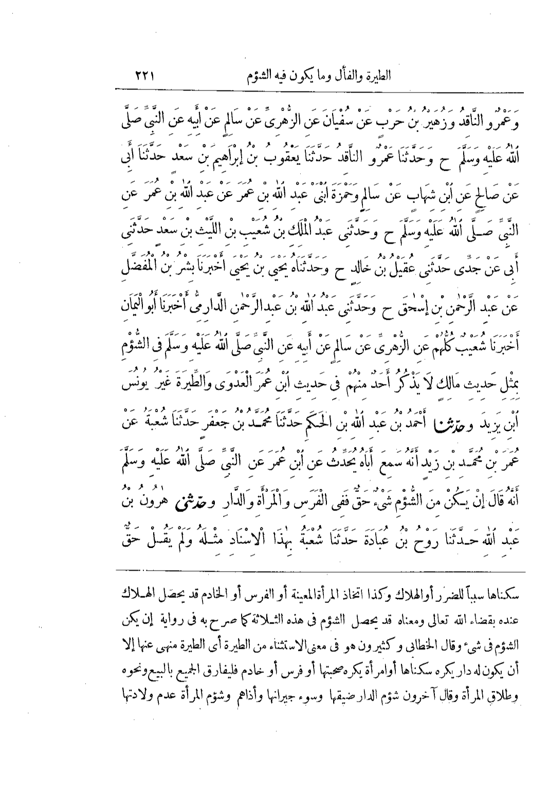 سُكْنَاهَا سَبَبًا لِلضَّرَرِ أَوِ الْهَلَاكِ وَكَذَا اتِّخَاذُ الْمَرْأَةِ الْمُعَيَّنَةِ أَوِ الْفَرَسِ أَوِ الْخَادِمِ قَدْ يَحْصُلُ الْهَلَاكُ عِنْدَهُ بِقَضَاءِ اللَّهِ تَعَالَى وَمَعْنَاهُ قَدْ يَحْصُلُ الشُّؤْمُ فِي هَذِهِ الثَّلَاثَةِ كَمَا صَرَّحَ بِهِ فِي رِوَايَةِ إِنْ يَكُنِ الشُّؤْمُ فِي شَيْءٍ وَقَالَ الْخَطَّابِيُّ وَكَثِيرُونَ هُوَ فِي معنى الاستثناء من الطيرةأى الطِّيَرَةُ مَنْهِيٌّ عَنْهَا إِلَّا أَنْ يَكُونَ لَهُ دار يكره سكناها أوامرأة يكره صحبتها أو فرس أوخادم فَلْيُفَارِقِ الْجَمِيعَ بِالْبَيْعِ وَنَحْوِهِ وَطَلَاقِ الْمَرْأَةِ وَقَالَ آخَرُونَ شُؤْمُ الدَّارِ ضِيقُهَا وَسُوءُ جِيرَانِهَا وَأَذَاهُمْ وَشُؤْمُ الْمَرْأَةِ عَدَمُ وِلَادَتِهَا