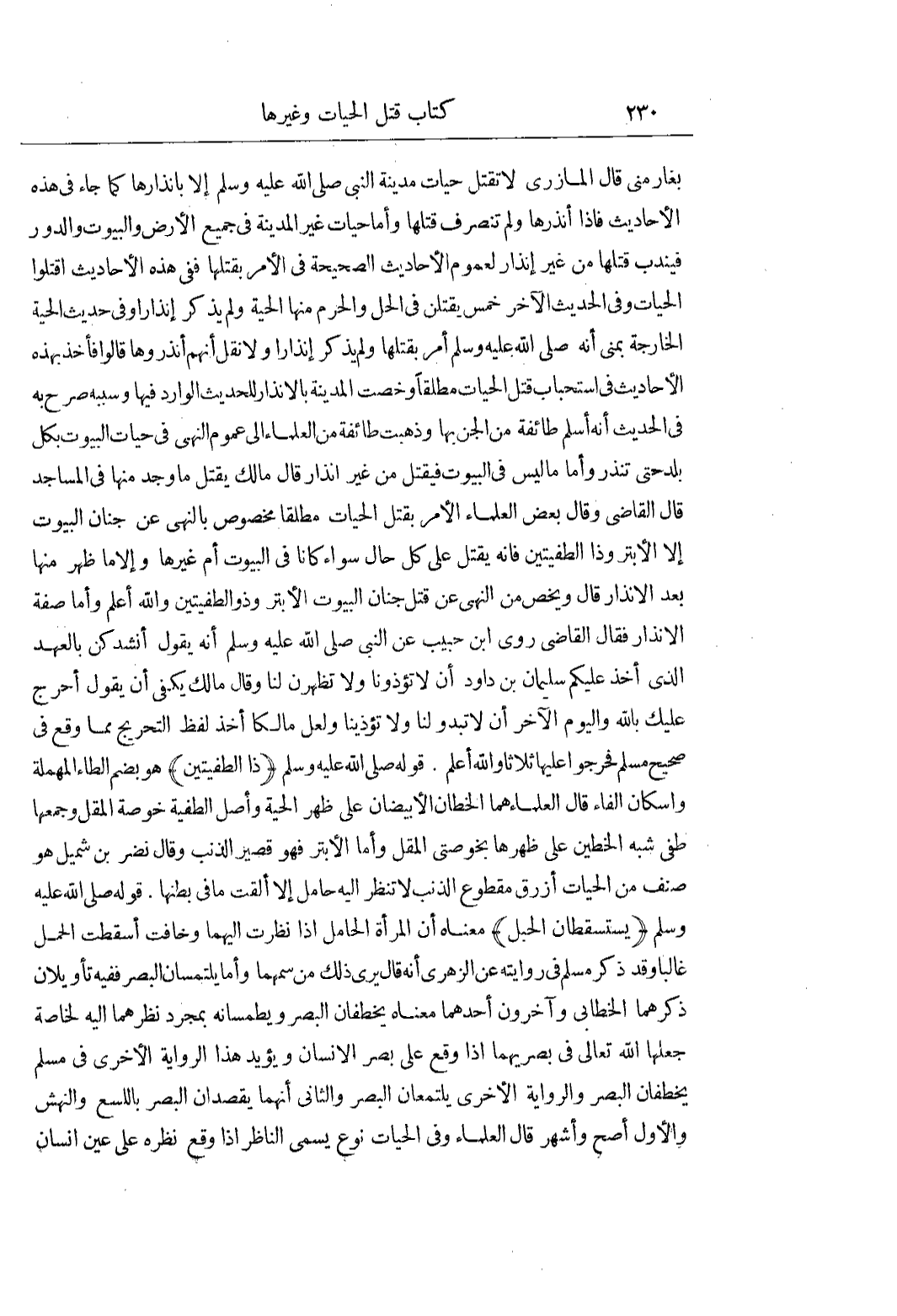 بغار مني قال المازري لاتقتل حَيَّاتُ مَدِينَةِ النَّبِيِّ صَلَّى اللَّهُ عَلَيْهِ وَسَلَّمَ إلابانذارها كَمَا جَاءَ فِي هَذِهِ الْأَحَادِيثِ فَإِذَا أَنْذَرَهَا وَلَمْ تَنْصَرِفْ قَتَلَهَا وَأَمَّا حَيَّاتُ غَيْرِ الْمَدِينَةِ فىجميع الْأَرْضِ وَالْبُيُوتِ وَالدُّورِ فَيُنْدَبُ قَتْلُهَا مِنْ غَيْرِ إِنْذَارٍ لِعُمُومِ الْأَحَادِيثِ الصَّحِيحَةِ فِي الْأَمْرِ بِقَتْلِهَا فَفِي هَذِهِ الْأَحَادِيثِ اقْتُلُوا الْحَيَّاتِ وَفِي الْحَدِيثِ الْآخَرِ خَمْسٌ يُقْتَلْنَ فِي الْحِلِّ وَالْحَرَمِ مِنْهَا الْحَيَّةُ وَلَمْ يَذْكُرْ إِنْذَارًا وَفِي حَدِيثِ الْحَيَّةُ الْخَارِجَةُ بِمِنًى أَنَّهُ صَلَّى اللَّهُ عَلَيْهِ وَسَلَّمَ أمر بقتلها ولم يذكر أَنْذَرُوهَا قَالُوا فَأَخَذَ بِهَذِهِ الْأَحَادِيثِ فِي اسْتِحْبَابِ قَتْلِ الْحَيَّاتِ مُطْلَقًا وَخُصَّتِ الْمَدِينَةُ بِالْإِنْذَارِ لِلْحَدِيثِ الْوَارِدِ فِيهَا وَسَبَبُهُ صَرَّحَ بِهِ فِي الْحَدِيثِ أَنَّهُ أَسْلَمَ طَائِفَةٌ مِنَ الْجِنِّ بِهَا وَذَهَبَتْ طَائِفَةٌ مِنَ الْعُلَمَاءِ إِلَى عُمُومِ النَّهْيِ فِي حَيَّاتِ الْبُيُوتِ بِكُلِّ بَلَدٍ حَتَّى تُنْذَرَ وَأَمَّا مَا لَيْسَ فِي الْبُيُوتِ فَيُقْتَلُ مِنْ غَيْرِ إِنْذَارٍ قَالَ مَالِكٌ يُقْتَلُ مَا وُجِدَ مِنْهَا فِي الْمَسَاجِدِ قَالَ الْقَاضِي وَقَالَ بَعْضُ الْعُلَمَاءِ الْأَمْرُ بِقَتْلِ الْحَيَّاتِ مُطْلَقًا مَخْصُوصٌ بِالنَّهْيِ عَنْ جنان البيوت إلاالأبتر وَذَا الطُّفْيَتَيْنِ فَإِنَّهُ يُقْتَلُ عَلَى كُلِّ حَالٍ سَوَاءٌ كَانَا فِي الْبُيُوتِ أَمْ غَيْرِهَا وَإِلَّا ماظهر مِنْهَا بَعْدَ الْإِنْذَارِ قَالَ وَيُخَصُّ مِنَ النَّهْيِ عن قتل جنان البيوت الأبتر وذوالطفيتين وَاللَّهُ أَعْلَمُ وَأَمَّا صِفَةُ الْإِنْذَارِ فَقَالَ الْقَاضِي روى بن حَبِيبٍ عَنِ النَّبِيِّ صَلَّى اللَّهُ عَلَيْهِ وَسَلَّمَ أَنَّهُ يَقُولُ أَنْشُدُكُنَّ بِالْعَهْدِ الَّذِي أَخَذَ عَلَيْكُمْ سليمان بن داود أن لاتؤذنا ولاتظهرن لنا وقال مالك يكفى أن يقول أخرج عليك بالله واليوم الآخر أن لاتبدو لَنَا وَلَا تُؤْذِيَنَا وَلَعَلَّ مَالِكًا أَخَذَ لَفْظَ التحريج مما وقع فى صحيح مسلم فخرجوا عَلَيْهَا ثَلَاثًا وَاللَّهُ أَعْلَمُ قَوْلُهُ صَلَّى اللَّهُ عَلَيْهِ وَسَلَّمَ (ذَا الطُّفْيَتَيْنِ) هُوَ بِضَمِّ الطَّاءِ الْمُهْمَلَةِ وَإِسْكَانِ الْفَاءِ قَالَ الْعُلَمَاءُ هُمَا الْخَطَّانِ الْأَبْيَضَانِ عَلَى ظَهْرِ الْحَيَّةِ وَأَصْلُ الطُّفْيَةِ خُوصَةُ الْمُقَلِ وَجَمْعُهَا طُفًى شِبْهُ الْخَطَّيْنِ عَلَى ظَهْرِهَا بخوصتى المقل وأما الأبترفهو قَصِيرُ الذَّنَبِ وَقَالَ نَضْرُ بْنُ شُمَيْلٍ هُوَ صنف من الحيات أزرق مقطوع الذنب لاتنظر إليه حامل إلا ألقت مافى بَطْنِهَا قَوْلُهُ صَلَّى اللَّهُ عَلَيْهِ وَسَلَّمَ (يَسْتَسْقِطَانِ الْحَبَلَ) مَعْنَاهُ أَنَّ الْمَرْأَةَ الْحَامِلَ إِذَا نَظَرَتْ إِلَيْهِمَا وَخَافَتْ أَسْقَطَتِ الْحَمْلَ غَالِبًا وَقَدْ ذَكَرَ مُسْلِمٌ فِي رِوَايَتِهِ عَنِ الزُّهْرِيِّ أَنَّهُ قَالَ يُرَى ذَلِكَ مِنْ سُمِّهِمَا وَأَمَّا يَلْتَمِسَانِ الْبَصَرَ فَفِيهِ تَأْوِيلَانِ ذَكَرَهُمَا الْخَطَّابِيُّ وَآخَرُونَ أَحَدُهُمَا مَعْنَاهُ يَخْطَفَانِ الْبَصَرَ وَيَطْمِسَانِهِ بِمُجَرَّدِ نَظَرِهِمَا إِلَيْهِ لِخَاصَّةٍ جَعَلَهَا اللَّهُ تَعَالَى فِي بَصَرَيْهِمَا إِذَا وَقَعَ عَلَى بَصَرِ الْإِنْسَانِ وَيُؤَيِّدُ هَذَا الرِّوَايَةَ الْأُخْرَى فِي مُسْلِمٍ يَخْطَفَانِ الْبَصَرَ وَالرِّوَايَةُ الْأُخْرَى يَلْتَمِعَانِ الْبَصَرَ وَالثَّانِي أَنَّهُمَا يَقْصِدَانِ الْبَصَرَ بِاللَّسْعِ وَالنَّهْشِ وَالْأَوَّلُ أَصَحُّ وَأَشْهَرُ قَالَ الْعُلَمَاءُ وَفِي الْحَيَّات
