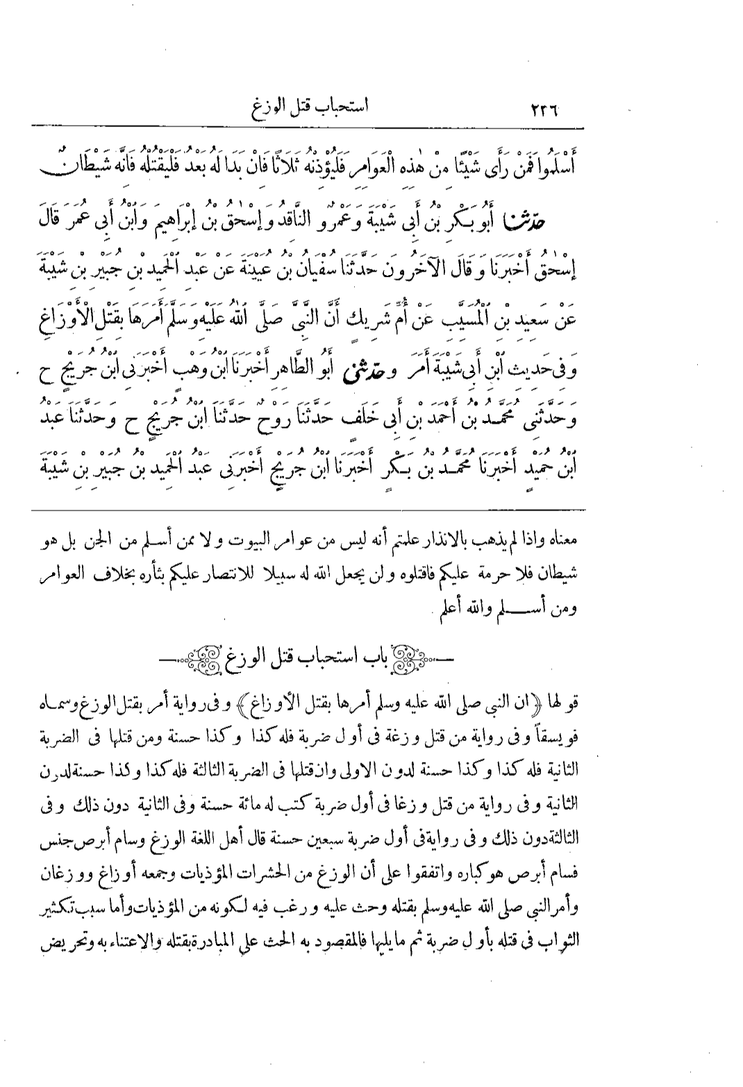 [2237] (أَنَّ النَّبِيَّ صَلَّى اللَّهُ عَلَيْهِ وَسَلَّمَ أَمَرَهَا بِقَتْلِ الْأَوْزَاغِ) وَفِي رِوَايَةٍ