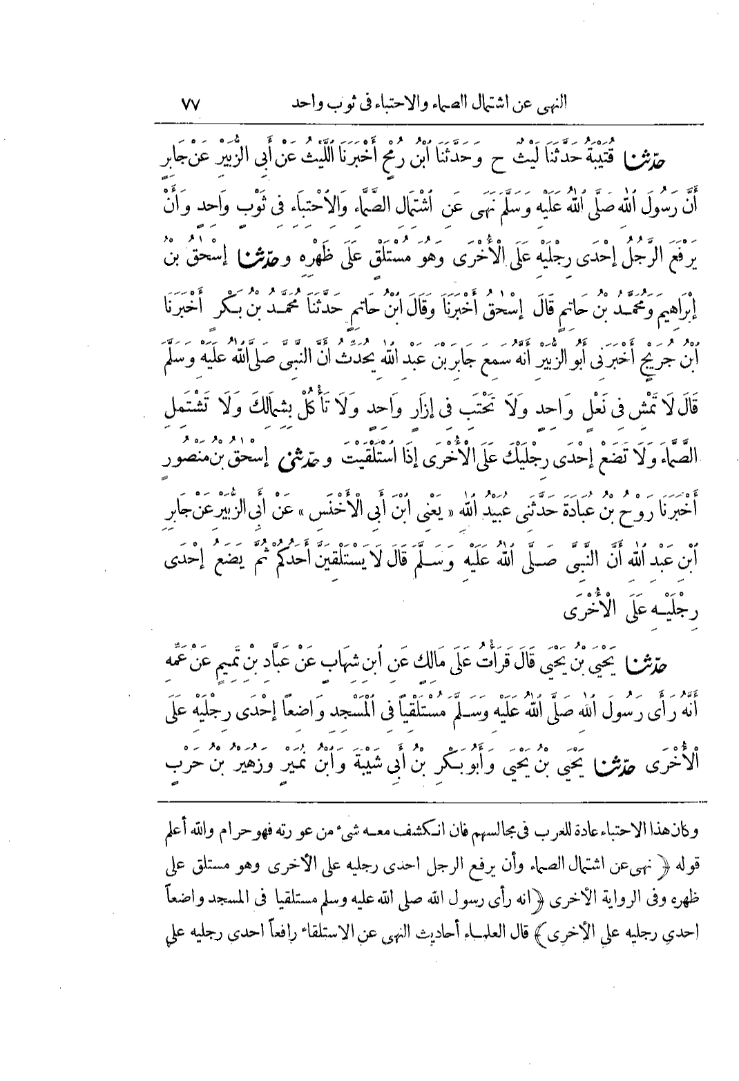 وَكَانَ هَذَا الِاحْتِبَاءُ عَادَةً لِلْعَرَبِ فِي مَجَالِسِهِمْ فَإِنِ انْكَشَفَ مَعَهُ شَيْءٌ مِنْ عَوْرَتِهِ فَهُوَ حَرَامٌ وَاللَّهُ أَعْلَمُ قَوْلُهُ (نَهَى عَنِ اشْتِمَالِ الصَّمَّاءِ وَأَنْ يَرْفَعَ الرَّجُلُ إِحْدَى رِجْلَيْهِ عَلَى الْأُخْرَى وَهُوَ مُسْتَلْقٍ عَلَى ظَهْرِهِ وَفِي الرِّوَايَةِ الْأُخْرَى