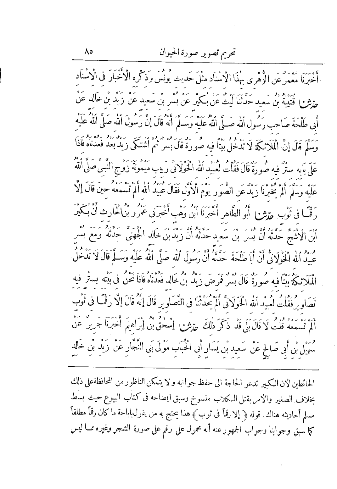 الْحَائِطَيْنِ لِأَنَّ الْكَبِيرَ تَدْعُو الْحَاجَةُ إِلَى حِفْظِ جوانبه ولايتمكن النَّاظُورُ مِنَ الْمُحَافَظَةِ عَلَى ذَلِكَ بِخِلَافِ الصَّغِيرِ وَالْأَمْرُ بِقَتْلِ الْكِلَابِ مَنْسُوخٌ وَسَبَقَ إِيضَاحُهُ فِي كِتَابِ الْبُيُوعِ حَيْثُ بَسَطَ مُسْلِمٌ أَحَادِيثَهُ هُنَاكَ قوله (إلارقما فِي ثَوْبٍ) هَذَا يَحْتَجُّ بِهِ مَنْ يَقُولُ باباحة ماكان رَقْمًا مُطْلَقًا كَمَا سَبَقَ وَجَوَابُنَا وَجَوَابُ الْجُمْهُورِ عَنْهُ أَنَّهُ مَحْمُولٌ عَلَى رَقْمٍ عَلَى صُورَةٍ الشَّجَرِ وَغَيْرِهِ مِمَّا لَيْسَ