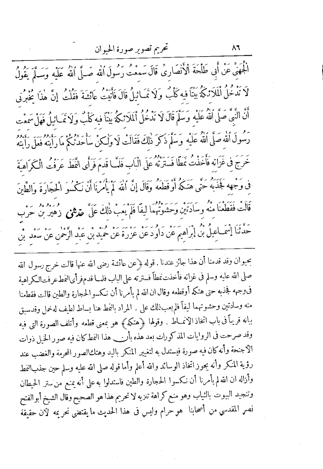 [2107] قَوْلُهُ (عَنْ عَائِشَةَ رَضِيَ اللَّهُ عَنْهَا قَالَتْ خَرَجَ رَسُولُ اللَّهِ صَلَّى اللَّهُ عَلَيْهِ وَسَلَّمَ فِي غَزَاتِهِ فَأَخَذْتُ نَمَطًا فَسُتْرَتُهُ عَلَى الْبَابِ فَلَمَّا قَدِمَ فَرَأَى النَّمَطَ عَرَفْتُ الْكَرَاهِيَةَ فِي وَجْهِهِ فَجَذَبَهُ حَتَّى هَتَكَهُ أَوْ قَطَعَهُ وَقَالَ إِنَّ اللَّهَ لَمْ يَأْمُرْنَا أَنْ نَكْسُوَ الْحِجَارَةَ وَالطِّينَ قَالَتْ فَقَطَعْنَا مِنْهُ وِسَادَتَيْنِ وَحَشَوْتُهُمَا لِيفًا فَلَمْ يَعِبْ ذَلِكَ عَلَيَّ الْمُرَادُ بِالنَّمَطِ هُنَا بِسَاطٌ لَطِيفٌ لَهُ خَمْلٌ وَقَدْ سَبَقَ بَيَانُهُ قَرِيبًا فِي بَابِ اتِّخَاذِ الْأَنْمَاطِ وَقَوْلُهَا (هَتَكَهُ) هوبمعنى قَطَعَهُ وَأَتْلَفَ الصُّورَةَ الَّتِي فِيهِ وَقَدْ صَرَّحَتْ فِي الرِّوَايَاتِ الْمَذْكُورَاتِ بَعْدَ هَذِهِ بِأَنَّ هَذَا النَّمَطَ كَانَ فِيهِ صُوَرُ الْخَيْلِ ذَوَاتِ الْأَجْنِحَةِ وَأَنَّهُ كَانَ فِيهِ صُورَةٌ فَيَسْتَدِلُّ بِهِ لِتَغْيِيرِ الْمُنْكَرِ بِالْيَدِ وَهَتْكِ الصُّوَرِ الْمُحَرَّمَةِ وَالْغَضَبِ عِنْدَ رُؤْيَةِ الْمُنْكَرِ وَأَنَّهُ يَجُوزُ اتِّخَاذُ الْوَسَائِدُ وَاللَّهُ أَعْلَمُ وَأَمَّا قَوْلُهُ صَلَّى اللَّهُ عَلَيْهِ وسلم حِينَ جَذَبَ النَّمَطَ وَأَزَالَهُ إِنَّ اللَّهَ لَمْ يأمرنا أن نكسوا الْحِجَارَةَ وَالطِّينَ فَاسْتَدَلُّوا بِهِ عَلَى أَنَّهُ يُمْنَعُ من ستر الحيطان وتنجيد البيوت بالثياب وهومنع كراهة تنزيه لاتحريم هَذَا هُوَ الصَّحِيحُ وَقَالَ الشَّيْخُ أَبُو الْفَتْحِ نَصْرُ الْمَقْدِسِيُّ مِنْ أَصْحَابِنَا هُوَ حَرَامٌ وَلَيْسَ فِي هَذَا الْحَدِيثِ مَا يَقْتَضِي تَحْرِيمَهُ لِأَنَّ حقيقة