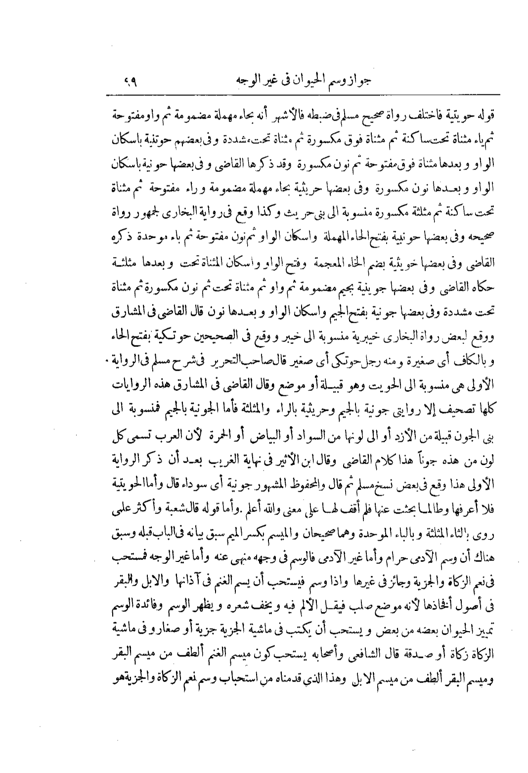 قَوْلُهُ حُوَيْتِيَّةٌ فَاخْتَلَفَ رُوَاةُ صَحِيحِ مُسْلِمٍ فِي ضَبْطِهِ فَالْأَشْهَرُ أَنَّهُ بِحَاءٍ مُهْمَلَةٍ مَضْمُومَةٍ ثُمَّ واومفتوحة ثُمَّ يَاءٍ مُثَنَّاةٍ تَحْتُ سَاكِنَةٍ ثُمَّ مُثَنَّاةٍ فوق مكسورة ثم مثناة تحت مشددة وَفِي بَعْضِهِمْ حُوتَنِيَّةٌ بِإِسْكَانِ الْوَاوِ وَبَعْدَهَا مُثَنَّاةٌ فَوْقُ مَفْتُوحَةٌ ثُمَّ نُونٌ مَكْسُورَةٌ وَقَدْ ذَكَرَهَا الْقَاضِي وَفِي بَعْضِهَا حُونِيَّةٌ بِإِسْكَانِ الْوَاوِ وَبَعْدَهَا نُونٌ مَكْسُورَةٌ وَفِي بَعْضِهَا حُرَيْثِيَّةٌ بِحَاءٍ مُهْمَلَةٍ مَضْمُومَةٍ وَرَاءُ مَفْتُوحَةٍ ثُمَّ مُثَنَّاةٍ تَحْتُ سَاكِنَةٍ ثُمَّ مُثَلَّثَةٍ مَكْسُورَةٍ مَنْسُوبَةٍ إِلَى بَنِي حُرَيْثٍ وَكَذَا وَقَعَ فِي رِوَايَةِ الْبُخَارِيِّ لِجُمْهُورِ رُوَاةِ صَحِيحِهِ وَفِي بَعْضِهَا حَوْنَبِيَّةٌ بِفَتْحِ الْحَاءِ الْمُهْمَلَةِ وَإِسْكَانِ الْوَاوِ ثُمَّ نُونٍ مَفْتُوحَةٍ ثُمَّ بَاءٍ مُوَحَّدَةٍ ذَكَرَهُ الْقَاضِي وَفِي بَعْضِهَا خُوَيْثِيَّةٌ بِضَمِّ الْخَاءِ الْمُعْجَمَةِ وَفَتْحِ الْوَاوِ وَإِسْكَانِ الْمُثَنَّاةِ تَحْتُ وَبَعْدَهَا مُثَلَّثَةٌ حَكَاهُ الْقَاضِي وَفِي بَعْضِهَا جُوَيْنِيَّةٌ بِجِيمٍ مَضْمُومَةٍ ثُمَّ وَاوٍ ثُمَّ مُثَنَّاةٍ تَحْتُ ثُمَّ نُونٍ مَكْسُورَةٍ ثُمَّ مُثَنَّاةٍ تَحْتُ مُشَدَّدَةٍ وَفِي بَعْضِهَا جَوْنِيَّةٌ بِفَتْحِ الْجِيمِ وَإِسْكَانِ الْوَاوِ وَبَعْدَهَا نُونٌ قَالَ الْقَاضِي فِي الْمَشَارِقِ وَوَقَعَ لِبَعْضِ رُوَاةِ الْبُخَارِيِّ خَيْبَرِيَّةٌ مَنْسُوبَةٌ إِلَى خَيْبَرَ وَوَقَعَ فِي الصَّحِيحَيْنِ حَوْتَكِيَّةٌ بِفَتْحِ الْحَاءِ وَبِالْكَافِ أَيْ صَغِيرَةٌ وَمِنْهُ رَجُلٌ حَوْتَكِيٌّ أَيْ صَغِيرٌ قَالَ صَاحِبُ التَّحْرِيرِ فِي شَرْحِ مُسْلِمٍ فِي الرِّوَايَةِ الْأُولَى هِيَ مَنْسُوبَةٌ إِلَى الْحُوَيْتِ وَهُوَ قَبِيلَةٌ أَوْ مَوْضِعٌ وَقَالَ الْقَاضِي فِي الْمَشَارِقِ هذه الروايات كلها تصحيف إلاروايتى جَوْنِيَّةٌ بِالْجِيمِ وَحُرَيْثِيَّةٌ بِالرَّاءِ وَالْمُثَلَّثَةِ فَأَمَّا الْجَوْنِيَّةُ بِالْجِيمِ فَمَنْسُوبَةٌ إِلَى بَنِي الْجَوْنِ قَبِيلَةٍ مِنَ الْأَزْدِ أَوْ إِلَى لَوْنِهَا مِنَ السَّوَادِ أَوِ الْبَيَاضِ أَوِ الْحُمْرَةِ لِأَنَّ الْعَرَبَ تُسَمِّي كُلَّ لَوْنٍ مِنْ هَذِهِ جَوْنًا هَذَا كَلَامُ الْقَاضِي وقال بن الْأَثِيرِ فِي نِهَايَةِ الْغَرِيبِ بَعْدَ أَنْ ذَكَرَ الرِّوَايَةَ الْأُولَى هَذَا وَقَعَ فِي بَعْضِ نُسَخِ مُسْلِمٍ ثُمَّ قَالَ وَالْمَحْفُوظُ الْمَشْهُورُ جَوْنِيَّةٌ أَيْ سوداء قال وأما الحويتية فلاأعرفها وَطَالَمَا بَحَثْتُ عَنْهَا فَلَمْ أَقِفْ لَهَا عَلَى مَعْنَى وَاللَّهُ أَعْلَمُ وَأَمَّا قَوْلُهُ قَالَ شُعْبَةُ وَأَكْثَرُ عِلْمِي رُوِيَ بِالثَّاءِ الْمُثَلَّثَةِ وَبِالْبَاءِ الْمُوَحَّدَةِ وهما صحيحان والميسم بِكَسْرِ الْمِيمِ سَبَقَ بَيَانُهُ فِي الْبَابِ قَبْلَهُ وَسَبَقَ هُنَاكَ أَنَّ وَسْمَ الْآدَمِيِّ حَرَامٌ وَأَمَّا غَيْرُ الْآدَمِيِّ فَالْوَسْمُ فِي وَجْهِهِ مَنْهِيٌّ عَنْهُ وَأَمَّا غَيْرُ الْوَجْهِ فَمُسْتَحَبٌّ فِي نَعَمِ الزَّكَاةِ وَالْجِزْيَةِ وَجَائِزٌ فِي غَيْرِهَا وَإِذَا وُسِمَ فَيُسْتَحَبُّ أَنْ يَسِمَ الْغَنَمَ فِي آذَانِهَا وَالْإِبِلَ وَالْبَقَرَ فى أصول أفخاذخا لِأَنَّهُ مَوْضِعٌ صُلْبٌ فَيَقِلُّ الْأَلَمُ فِيهِ وَيَخِفُّ شَعْرُهُ وَيَظْهَرُ الْوَسْمُ وَفَائِدَةُ الْوَسْمِ تَمْيِيزُ الْحَيَوَانِ بَعْضِهُ مِنْ بَعْضٍ وَيُسْتَحَبُّ أَنْ يُكْتَبَ فِي مَاشِيَةِ الْجِزْيَةِ جِزْيَةٌ أَوْ صَغَارٌ وَفِي مَاشِيَةِ الزَّكَاةِ زَكَاةٌ أَوْ صَدَقَةٌ قَالَ الشَّافِعِيُّ وَأَصْحَابُهُ يُسْتَحَبُّ كَوْنُ مِيسَمِ الْغَنَمِ أَلْطَ