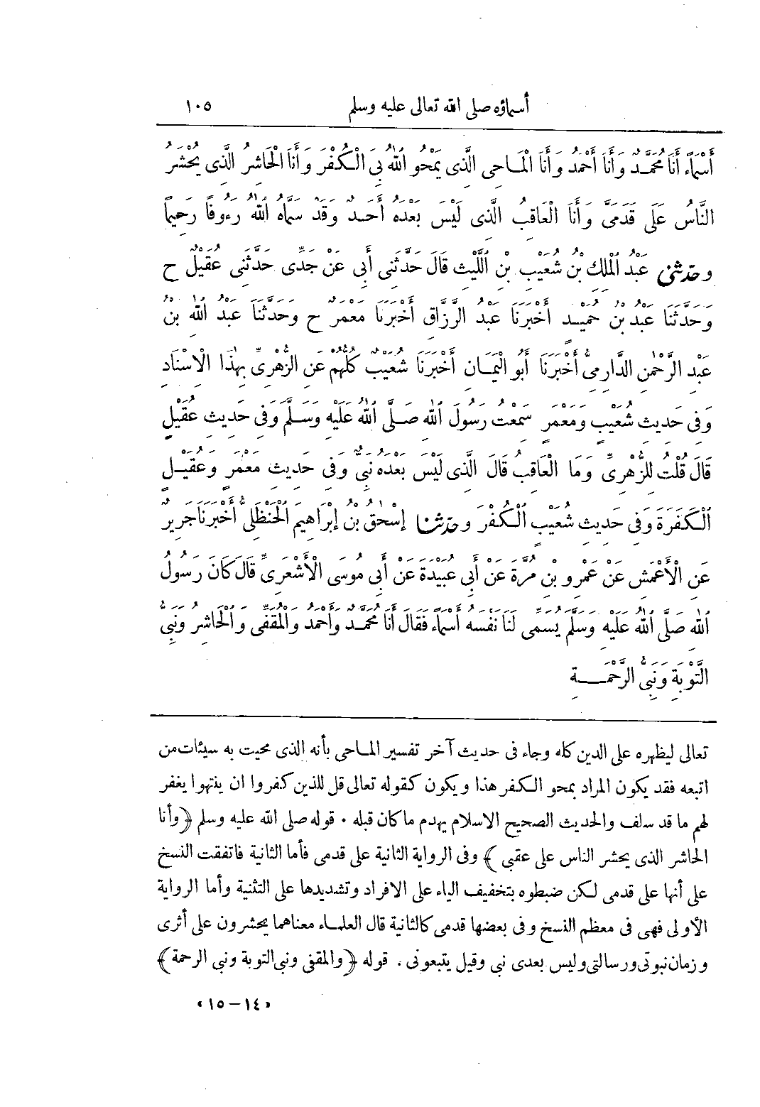 تعالى ليظهره على الدين كله وَجَاءَ فِي حَدِيثٍ آخَرَ تَفْسِيرُ الْمَاحِي بِأَنَّهُ الَّذِي مُحِيَتْ بِهِ سَيِّئَاتُ مَنِ اتَّبَعَهُ فَقَدْ يَكُونُ الْمُرَادُ بِمَحْوِ الْكُفْرِ هَذَا وَيَكُونُ كَقَوْلِهِ تَعَالَى قُلْ لِلَّذِينَ كَفَرُوا إِنْ يَنْتَهُوا يُغْفَرْ لهم ما قد سلف وَالْحَدِيثِ الصَّحِيحِ الْإِسْلَامُ يَهْدِمُ مَا كَانَ قَبْلَهُ قَوْلُهُ صَلَّى اللَّهُ عَلَيْهِ وَسَلَّمَ (وَأَنَا الْحَاشِرُ الَّذِي يُحْشَرُ النَّاسُ عَلَى عَقِبِي) وَفِي الرِّوَايَةِ الثَّانِيَةِ عَلَى قَدَمِي فَأَمَّا الثَّانِيَةُ فَاتَّفَقَتِ النُّسَخُ على أنها عَلَى أَنَّهَا عَلَى قَدَمِي لَكِنْ ضَبَطُوهُ بِتَخْفِيفِ الْيَاءِ عَلَى الْإِفْرَادِ وَتَشْدِيدِهَا عَلَى التَّثْنِيَةِ وَأَمَّا الرِّوَايَةُ الْأُولَى فَهِيَ فِي مُعْظَمِ النُّسَخِ وَفِي بَعْضِهَا قَدَمِي كَالثَّانِيَةِ قَالَ الْعُلَمَاءُ مَعْنَاهُمَا يُحْشَرُونَ عَلَى أَثَرِي وَزَمَانِ نُبُوَّتِي وَرِسَالَتِي وَلَيْسَ بَعْدِي نبي وقيل يتبعوني قوله