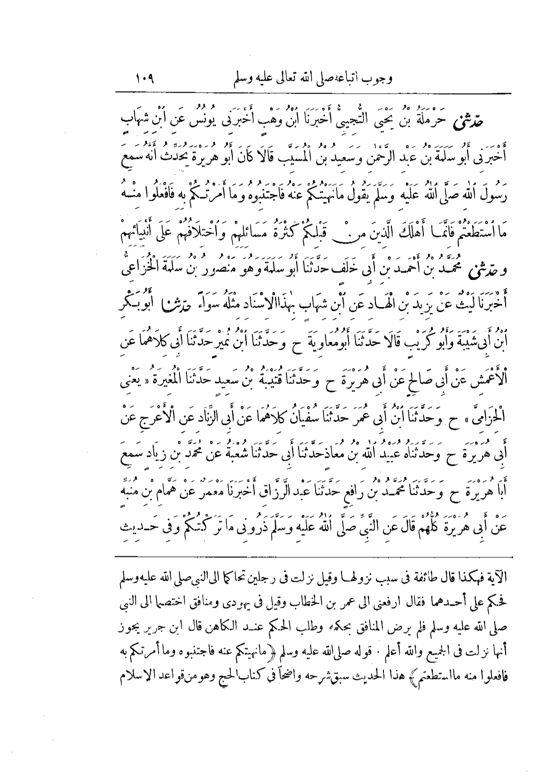 الْآيَةَ فَهَكَذَا قَالَ طَائِفَةٌ فِي سَبَبِ نُزُولِهَا وَقِيلَ نَزَلَتْ فِي رَجُلَيْنِ تَحَاكَمَا إِلَى النَّبِيِّ صَلَّى اللَّهُ عَلَيْهِ وَسَلَّمَ فَحَكَمَ عَلَى أَحَدِهِمَا فَقَالَ ارْفَعْنِي إِلَى عُمَرَ بْنِ الْخَطَّابِ وَقِيلَ فِي يَهُودِيٍّ وَمُنَافِقٍ اخْتَصَمَا إِلَى النَّبِيِّ صَلَّى اللَّهُ عَلَيْهِ وَسَلَّمَ فَلَمْ يَرْضَ الْمُنَافِقُ بِحُكْمِهِ وطلب الحكم عند الكاهن قال بن جَرِيرٍ يَجُوزُ أَنَّهَا نَزَلَتْ فِي الْجَمِيعِ وَاللَّهُ أَعْلَمُ قَوْلُهُ صَلَّى اللَّهُ عَلَيْهِ وَسَلَّمَ (مانهيتكم عَنْهُ فَاجْتَنِبُوهُ وَمَا أَمَرْتُكُمْ بِهِ فَافْعَلُوا مِنْهُ مَا اسْتَطَعْتُمْ) هَذَا الْحَدِيثُ سَبَقَ شَرْحُهُ وَاضِحًا فِي كِتَابِ الْحَجِّ وَهُوَ مِنْ قَوَاعِدِ الْإِسْلَامِ