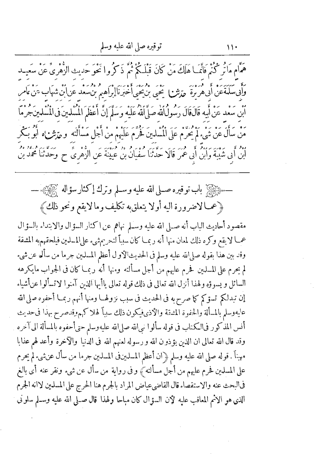 (بَابُ تَوْقِيرِهِ صَلَّى اللَّهُ عَلَيْهِ وَسَلَّمَ وَتَرْكِ إِكْثَارِ سُؤَالِهِ)