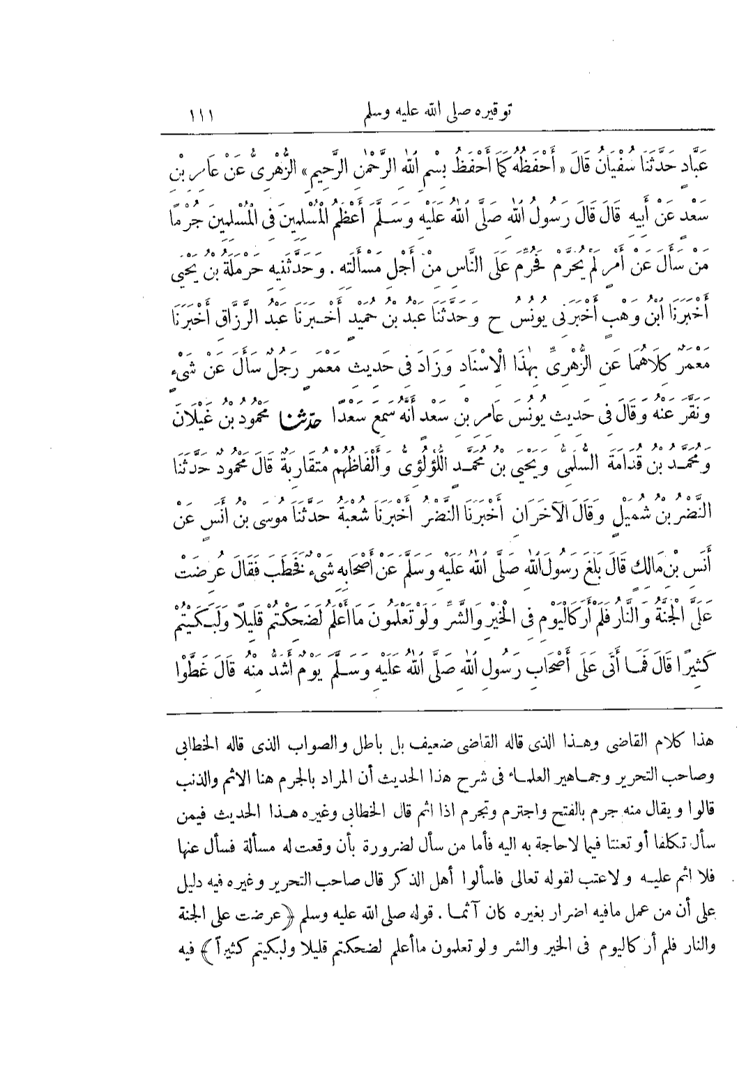 [2359] (عُرِضَتْ عَلَيَّ الْجَنَّةُ وَالنَّارُ فَلَمْ أَرَ كَالْيَوْمِ فِي الْخَيْرِ وَالشَّرِّ وَلَوْ تَعْلَمُونَ مَا أَعْلَمُ لَضَحِكْتُمْ قَلِيلًا وَلَبَكَيْتُمْ كَثِيرًا) فِيهِ