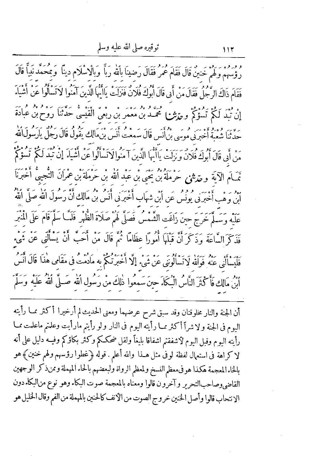 أَنَّ الْجَنَّةَ وَالنَّارَ مَخْلُوقَتَانِ وَقَدْ سَبَقَ شَرْحُ عَرْضِهِمَا وَمَعْنَى الْحَدِيثِ لَمْ أَرَ خَيْرًا أَكْثَرَ مِمَّا رَأَيْتُهُ الْيَوْمَ فِي الْجَنَّةِ وَلَا شَرًّا أَكْثَرَ مِمَّا رَأَيْتُهُ الْيَوْمَ فِي النَّارِ وَلَوْ رَأَيْتُمْ مَا رَأَيْتُ وَعَلِمْتُمْ مَا عَلِمْتُ مِمَّا رَأَيْتُهُ الْيَوْمَ وَقَبْلَ الْيَوْمِ لَأَشْفَقْتُمْ إِشْفَاقًا بَلِيغًا وَلَقَلَّ ضَحِكُكُمْ وَكَثُرَ بُكَاؤُكُمْ وَفِيهِ دَلِيلٌ عَلَى أَنَّهُ لَا كَرَاهَةَ فِي اسْتِعْمَالِ لَفْظَةِ لَوْ فِي مِثْلِ هَذَا وَاللَّهُ أَعْلَمُ قَوْلُهُ (غَطَّوْا رؤسهم وَلَهُمْ خَنِينٌ) هُوَ بِالْخَاءِ الْمُعْجَمَةِ هَكَذَا هُوَ فِي مُعْظَمِ النُّسَخِ وَلِمُعْظَمِ الرُّوَاةِ وَلِبَعْضِهِمْ بِالْحَاءِ الْمُهْمَلَةِ وَمِمَّنْ ذَكَرَ الْوَجْهَيْنِ الْقَاضِي وَصَاحِبُ التَّحْرِيرِ وَآخَرُونَ قَالُوا وَمَعْنَاهُ بِالْمُعْجَمَةِ صَوْتُ الْبُكَاءِ وَهُوَ نَوْعٌ مِنَ الْبُكَاءِ دُونَ الِانْتِحَابِ قَالُوا وَأَصْلُ الْخَنِينِ خُرُوجُ الصَّوْتِ مِنَ الْأَنْفِ كَالْحَنِينِ بِالْمُهْمَلَةِ مِنَ الْفَمِ وَقَالَ الْخَلِيلُ هُوَ