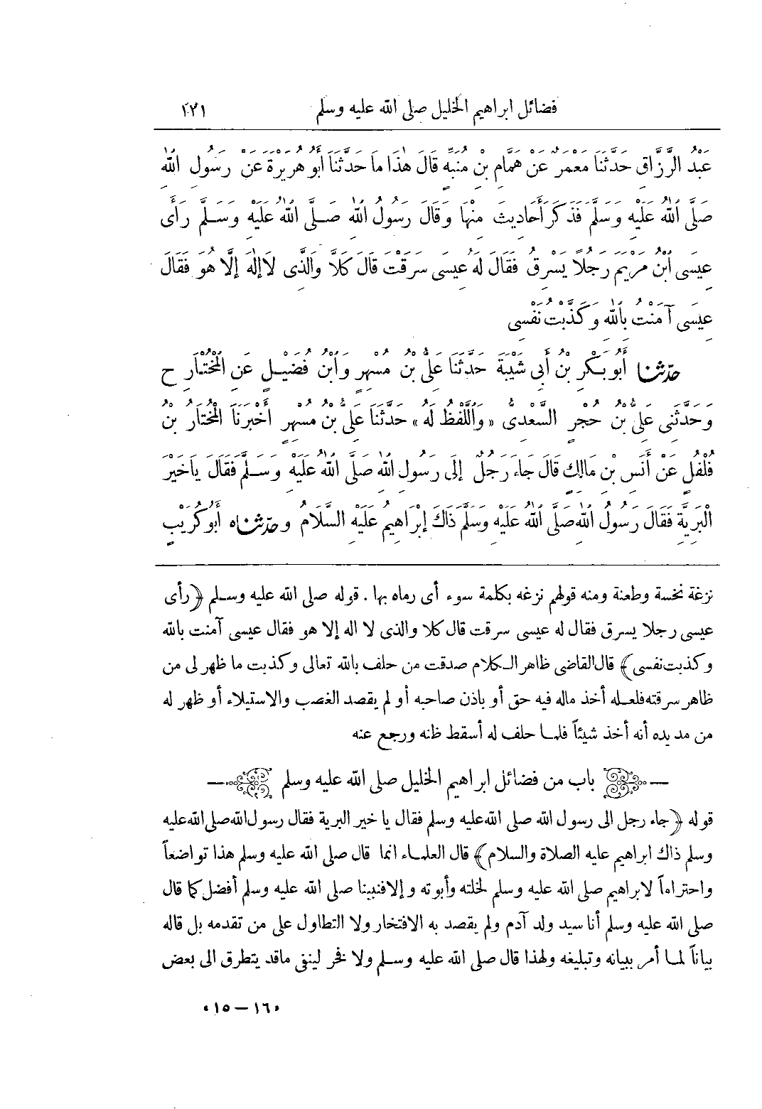 [2369] (جَاءَ رَجُلٌ إِلَى رَسُولِ اللَّهِ صَلَّى اللَّهُ عَلَيْهِ وَسَلَّمَ فَقَالَ يَا خَيْرَ الْبَرِيَّةِ فَقَالَ رَسُولُ اللَّهِ صَلَّى اللَّهُ عَلَيْهِ وَسَلَّمَ ذَاكَ إِبْرَاهِيمُ عَلَيْهِ الصَّلَاةِ وَالسَّلَامِ) قَالَ الْعُلَمَاءُ إِنَّمَا قَالَ صَلَّى اللَّهُ عَلَيْهِ وَسَلَّمَ هَذَا تَوَاضُعًا وَاحْتِرَامًا لِإِبْرَاهِيمَ صَلَّى اللَّهُ عَلَيْهِ وَسَلَّمَ لِخُلَّتِهِ وَأُبُوَّتِهِ وإلافنبينا صَلَّى اللَّهُ عَلَيْهِ وَسَلَّمَ أَفْضَلُ كَمَا قَالَ صَلَّى اللَّهُ عَلَيْهِ وَسَلَّمَ أَنَا سَيِّدُ وَلَدِ آدَمَ وَلَمْ يَقْصِدْ بِهِ الِافْتِخَارَ وَلَا التَّطَاوُلَ عَلَى مَنْ تَقَدَّمَهُ بَلْ قَالَهُ بَيَانًا لِمَا أُمِرَ بِبَيَانِهِ وَتَبْلِيغِهِ وَلِهَذَا قَالَ صَلَّى اللَّهُ عَلَيْهِ وَسَلَّمَ وَلَا فَخْرَ لِيَنْفِيَ مَا قَدْ يَتَطَرَّقُ إِلَى بَعْضِ